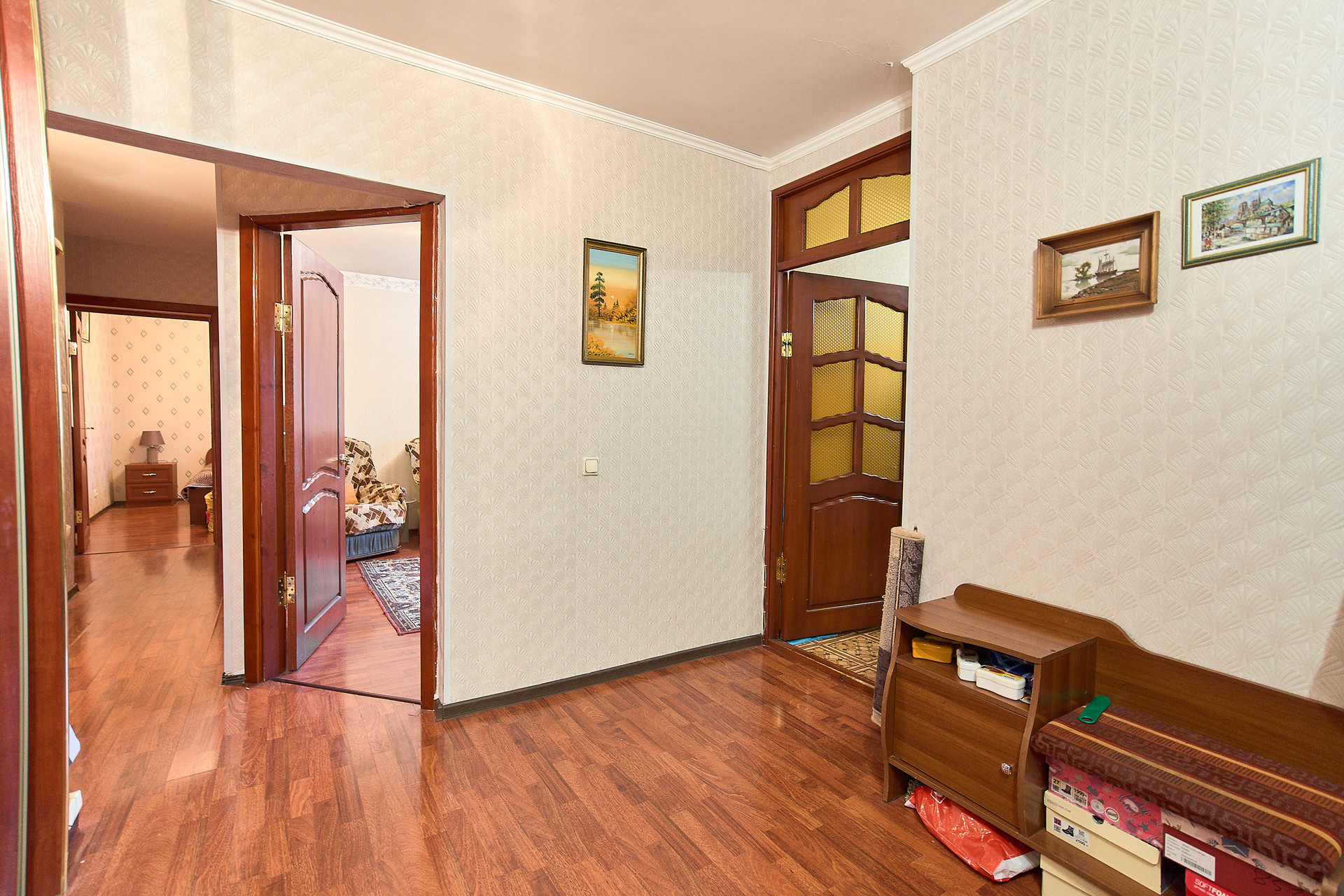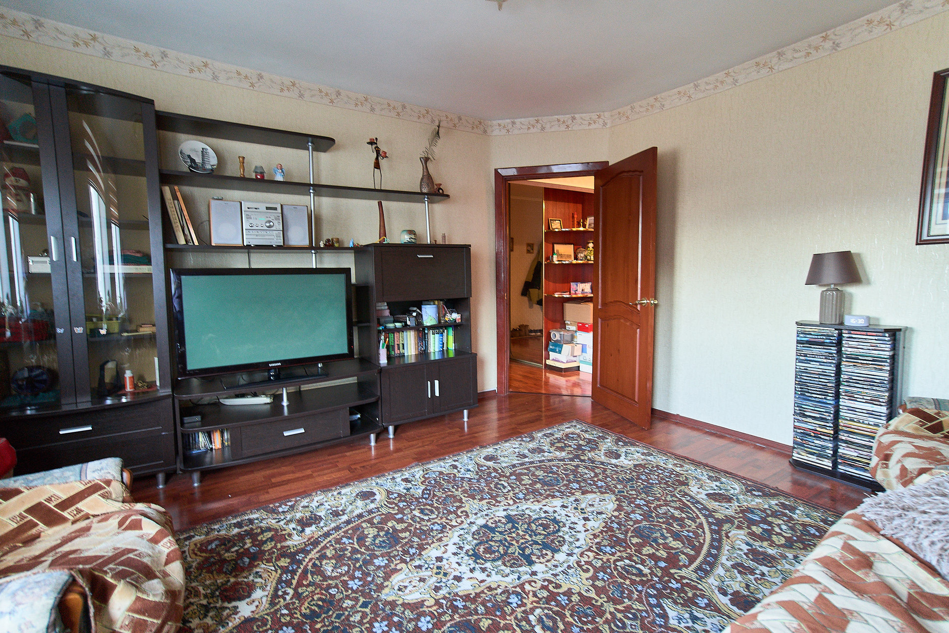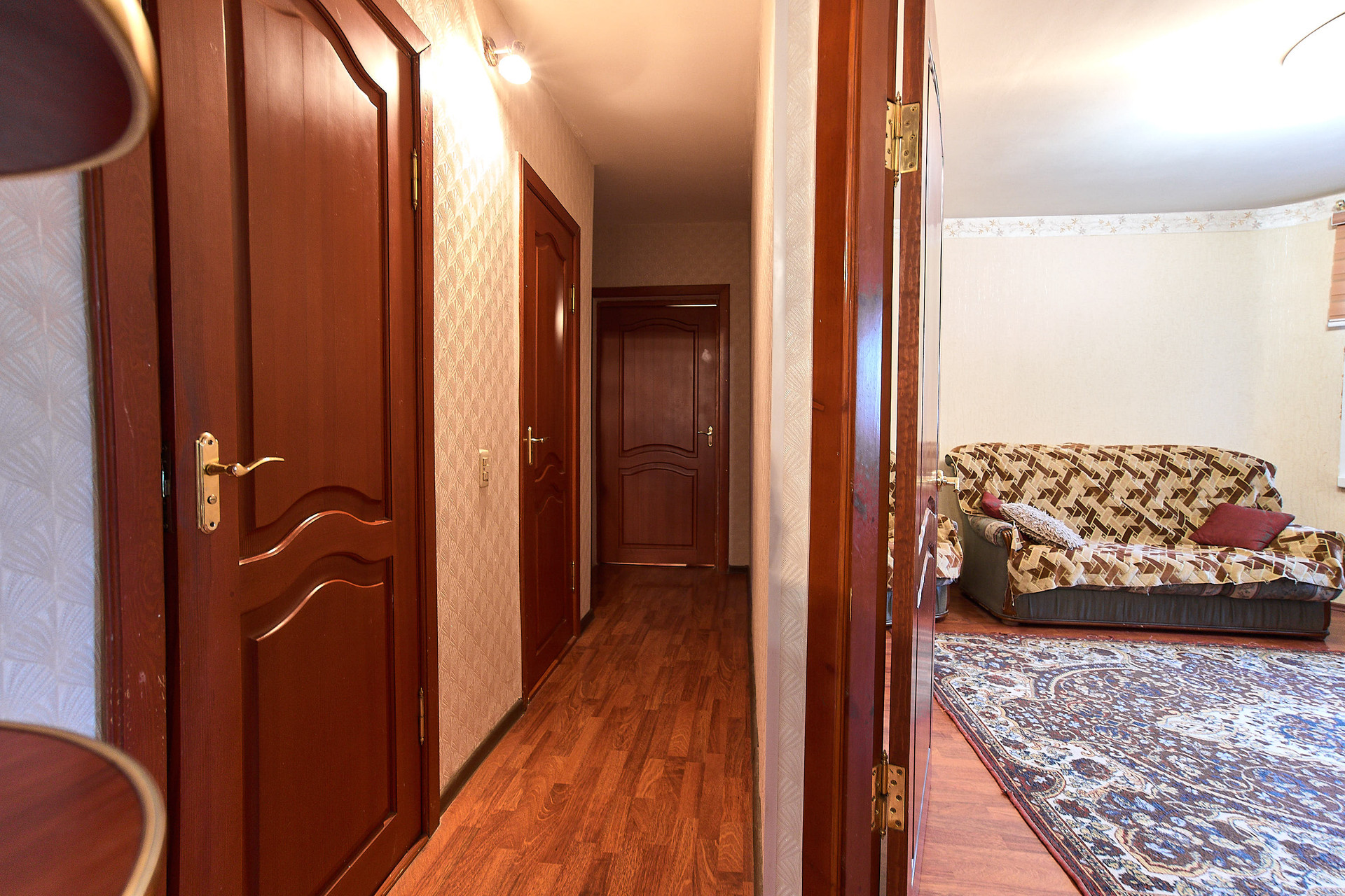Межкомнатные двери из натурального дерева, остается классический кухонный гарнитур с плитой, диваны. большой зеркальный шкаф во входной группе и белая стенка-горка.