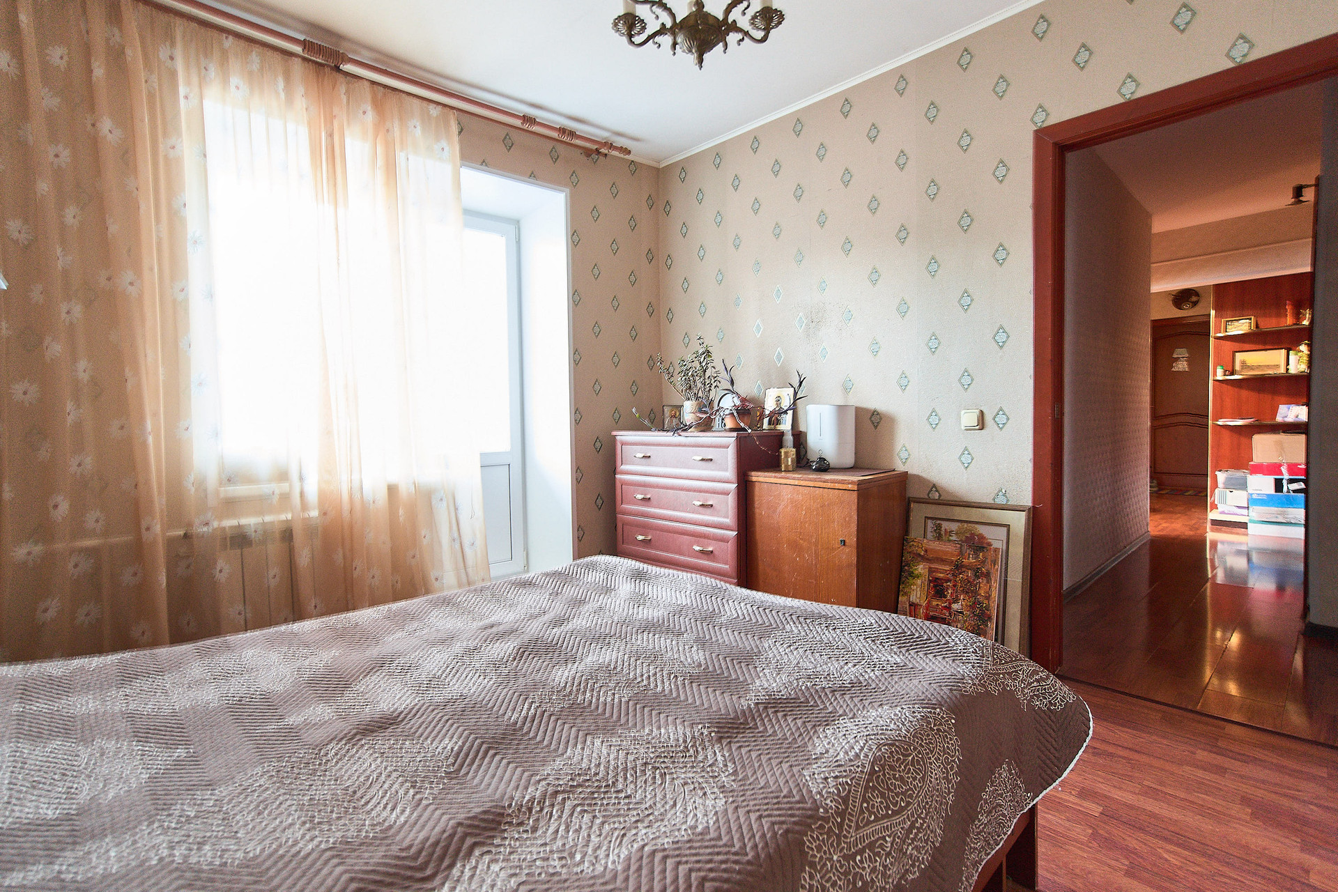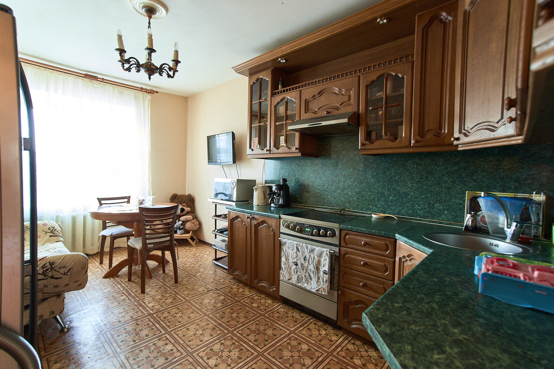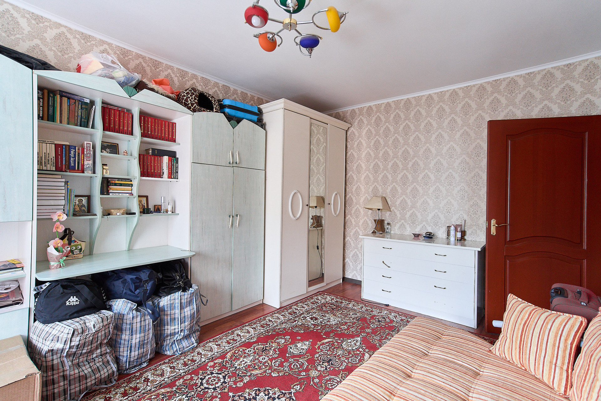 Межкомнатные двери из натурального дерева, остается классический кухонный гарнитур с плитой, диваны. большой зеркальный шкаф во входной группе и белая стенка-горка.