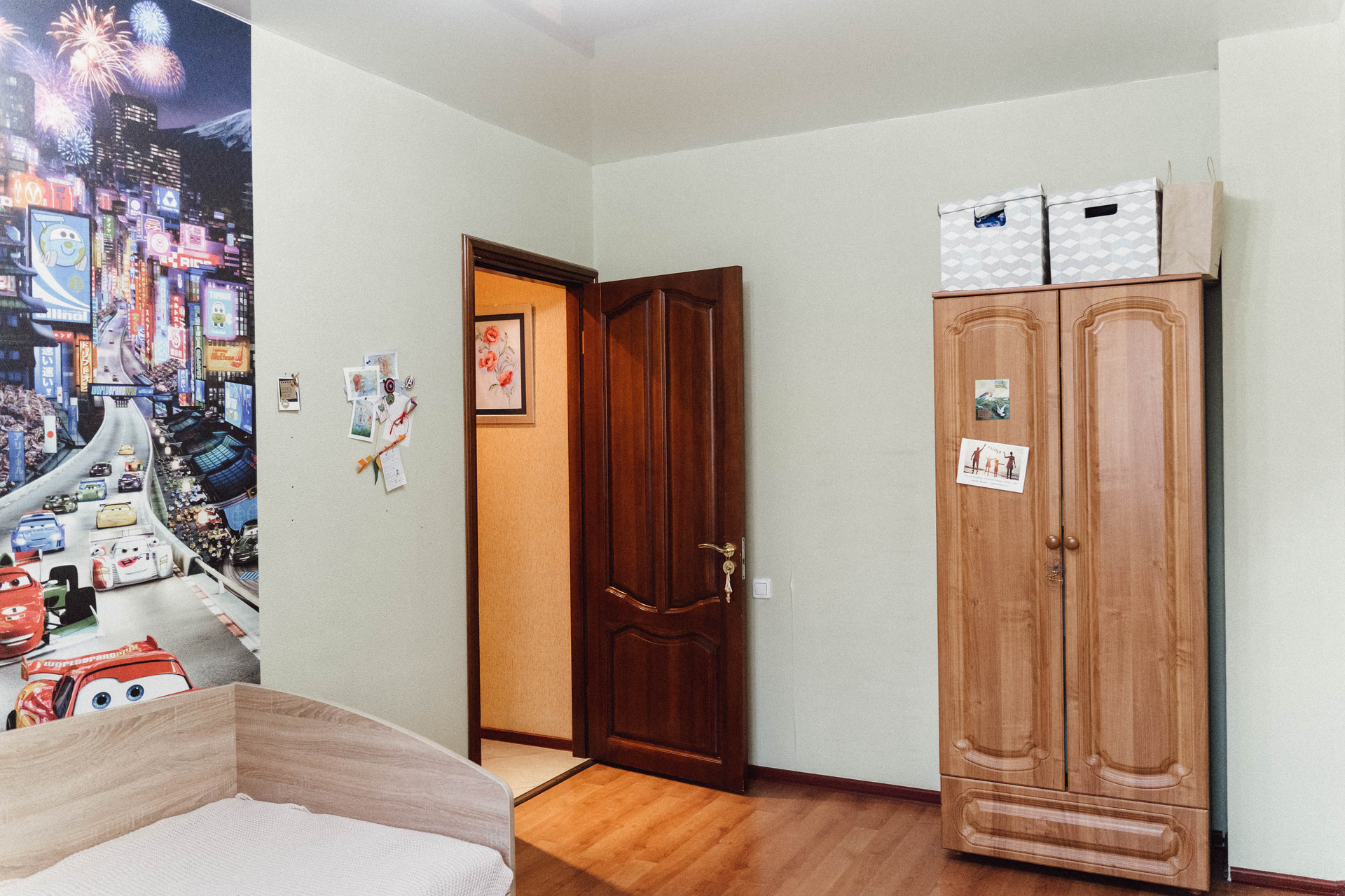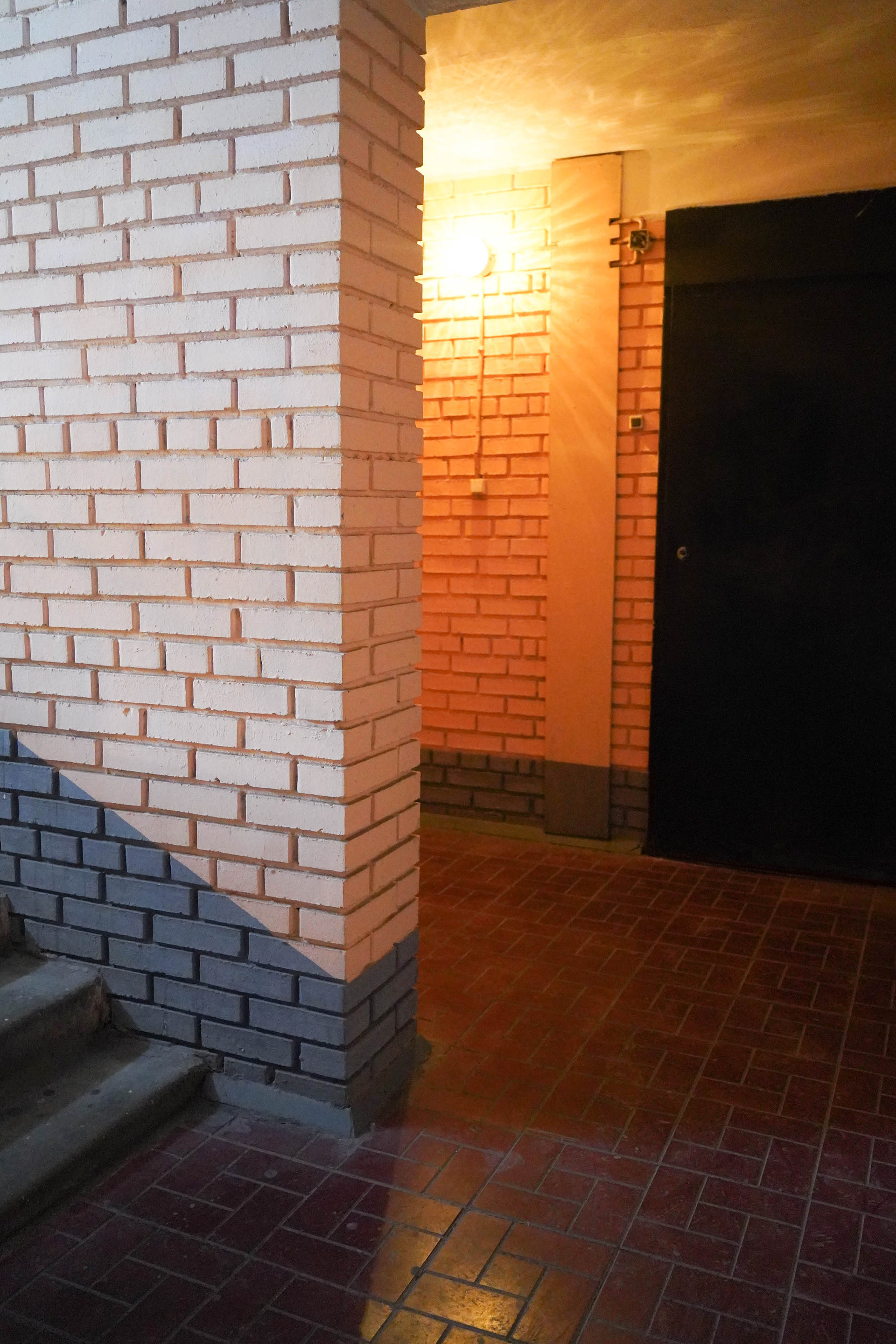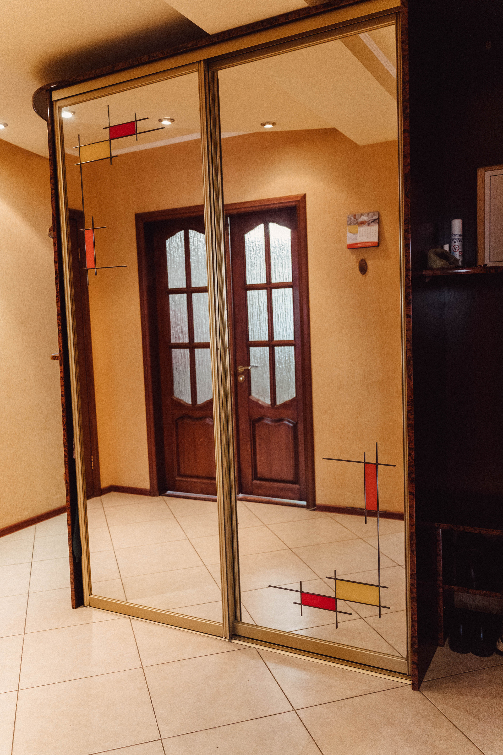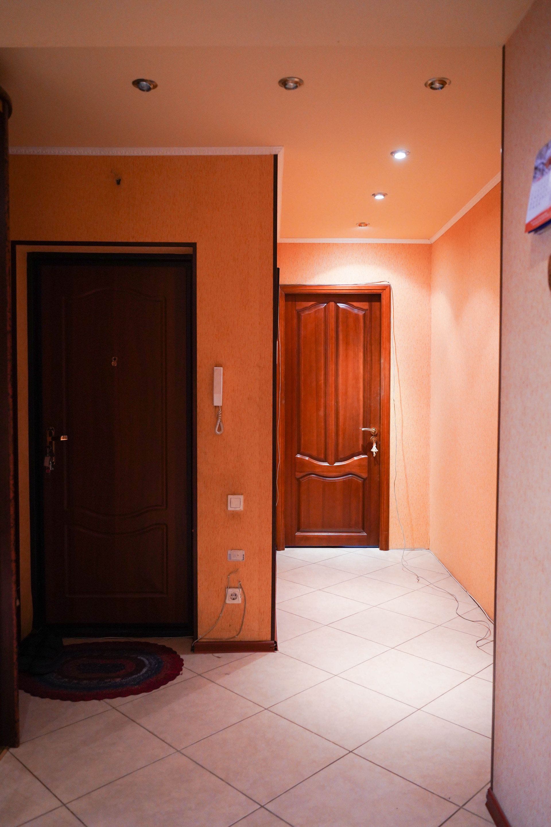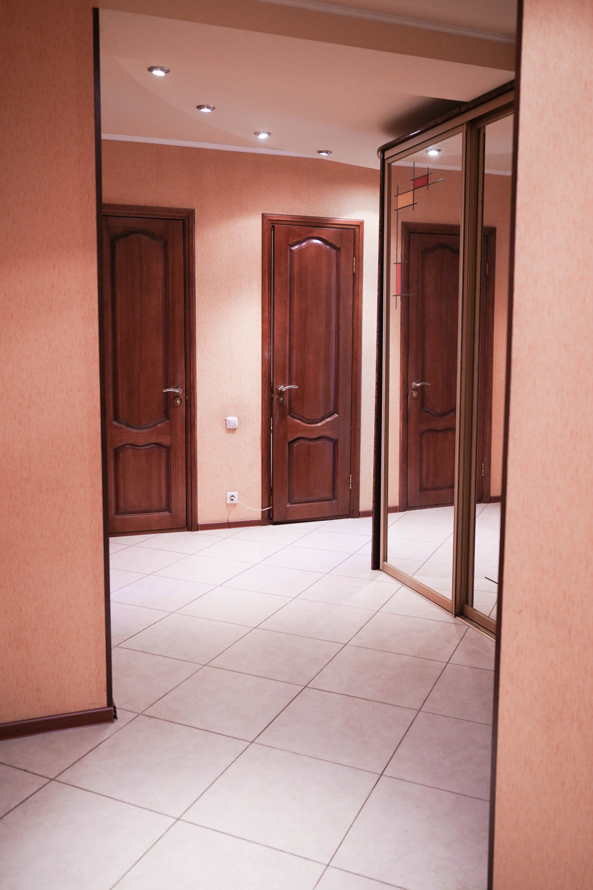 Просторный коридор со встроенным шкафом и зеркалами в пол, точечное освещение. Две квартиры отделены дверью на этаже. Можно оборудовать входную зону.