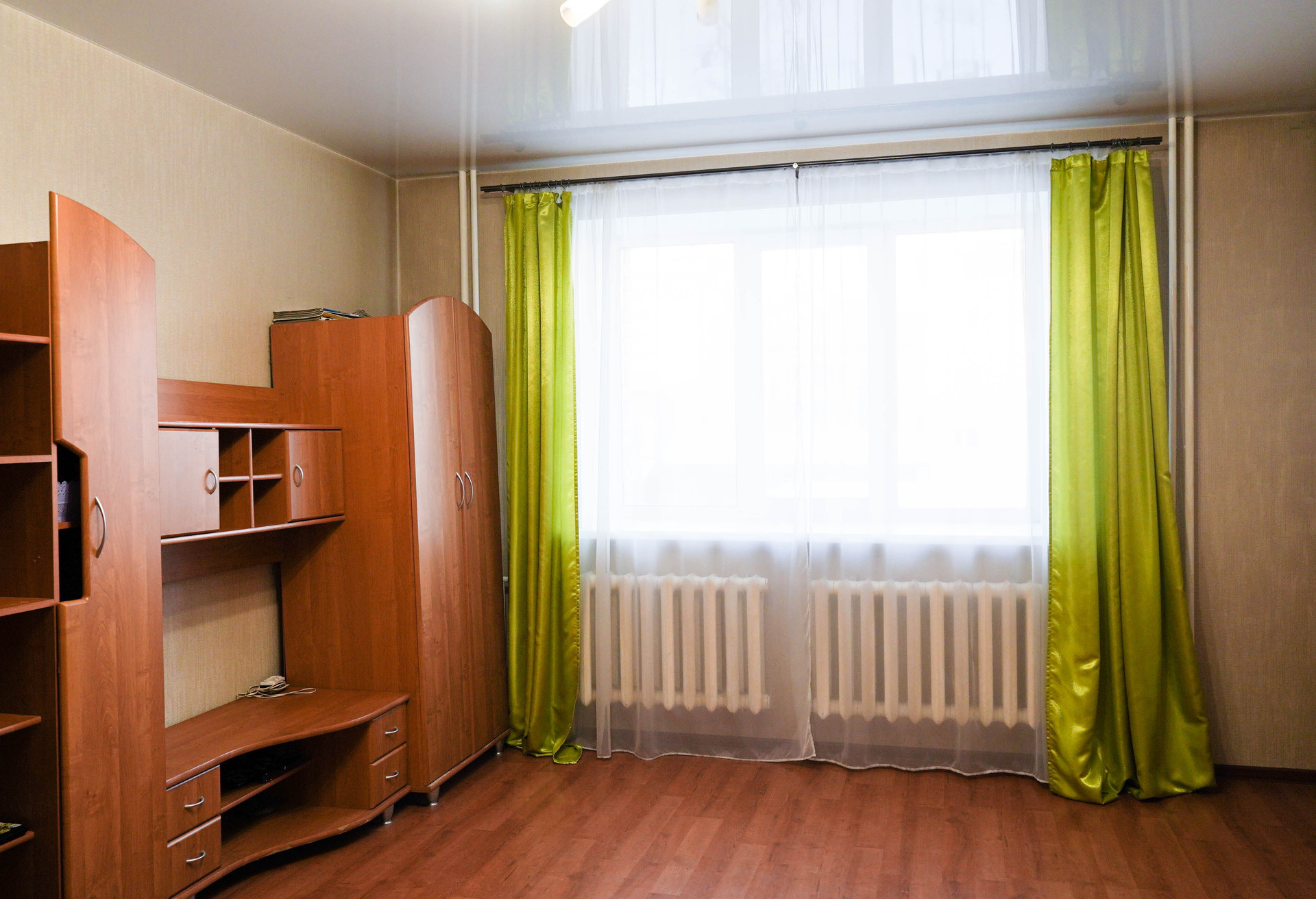 Большая гостиная, окна выходят во двор, видно детскую площадку. Две светлые спальни, также окна выходят во двор, нет шума от улицы. Из спальни поменьше выход на  просторную лоджию 5.2 кв.м..
