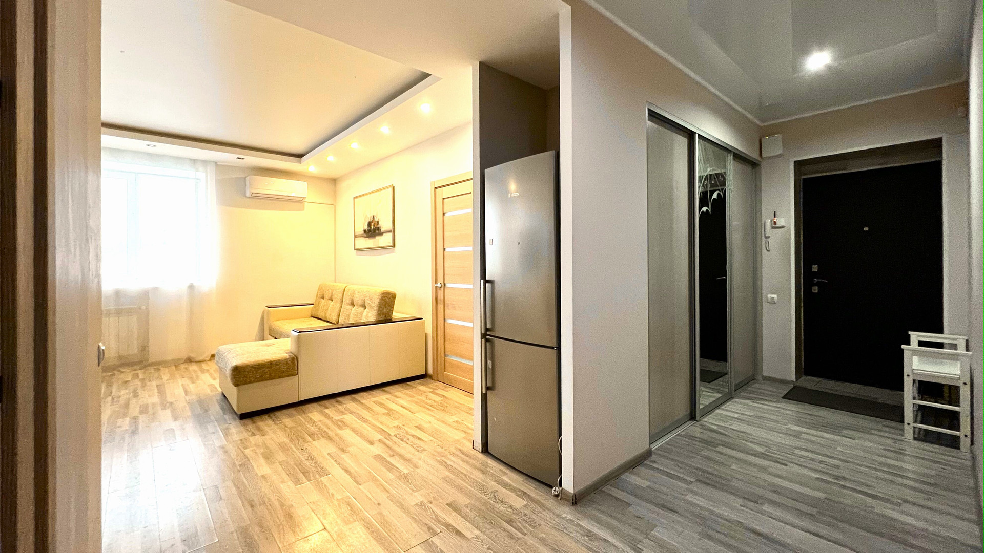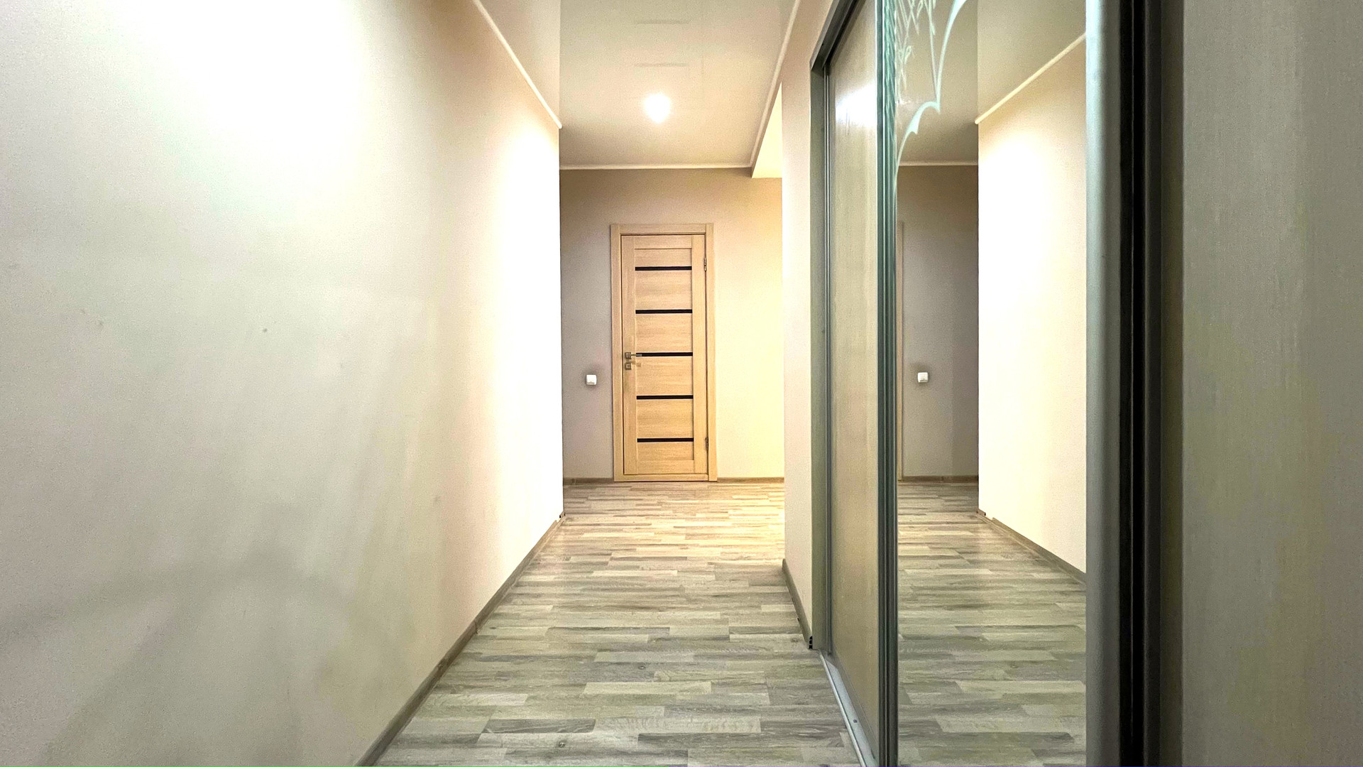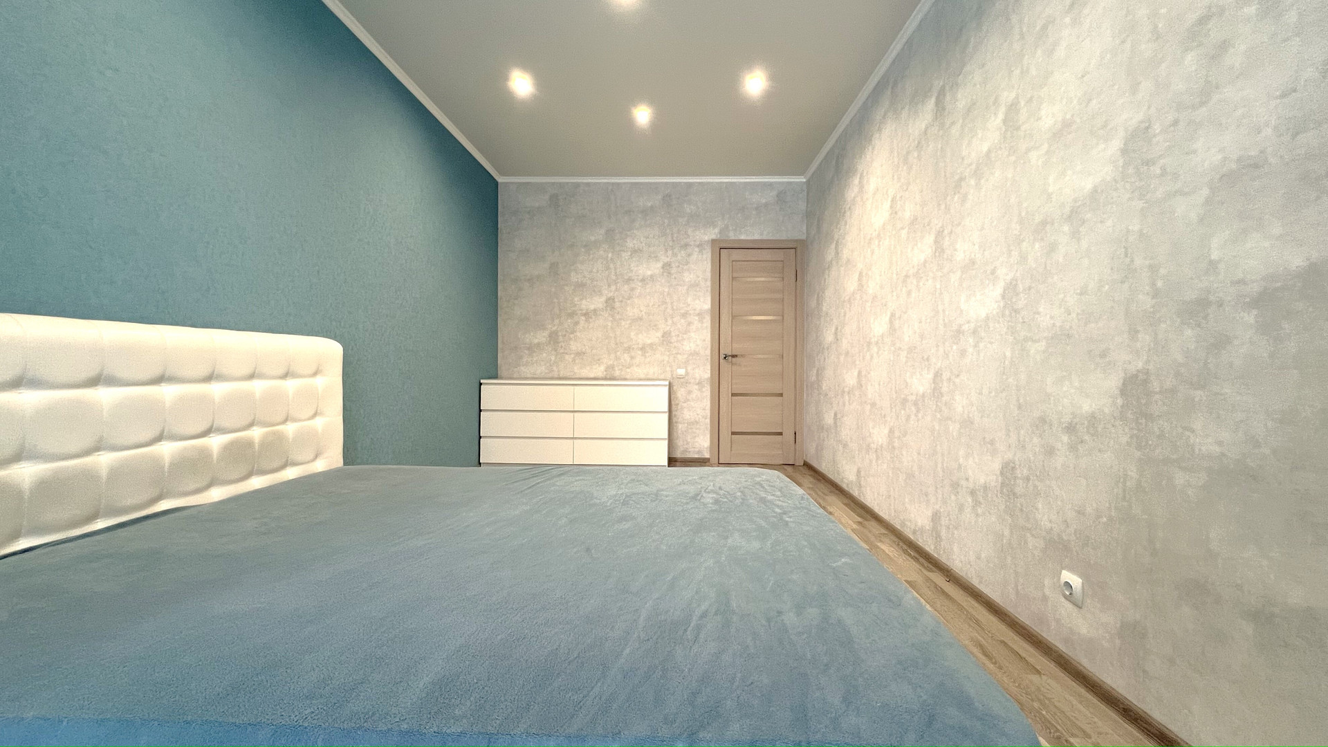 На полу ламинат, натяжной потолок с разноуровневой подсветкой и большим количеством световых точек.