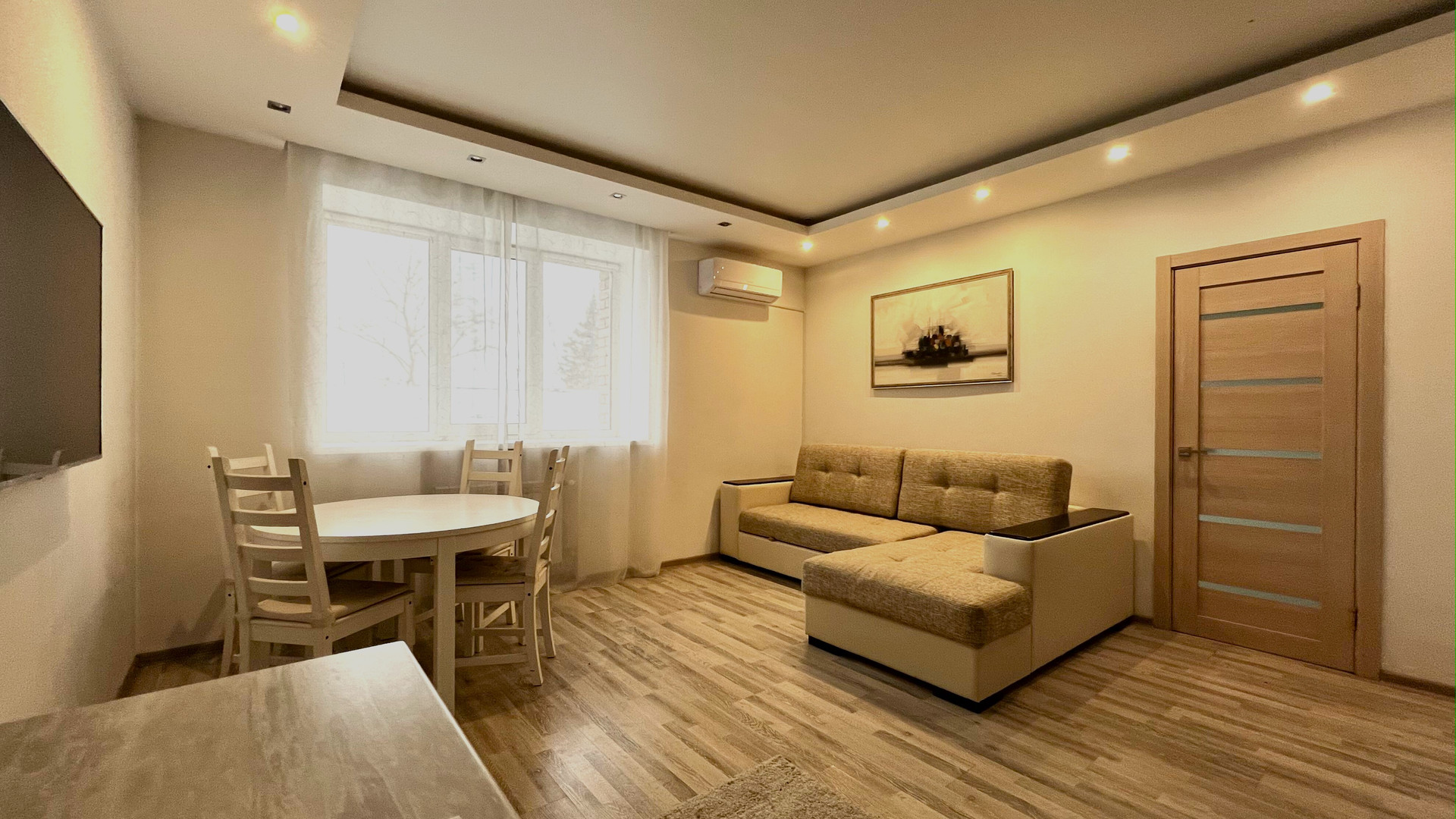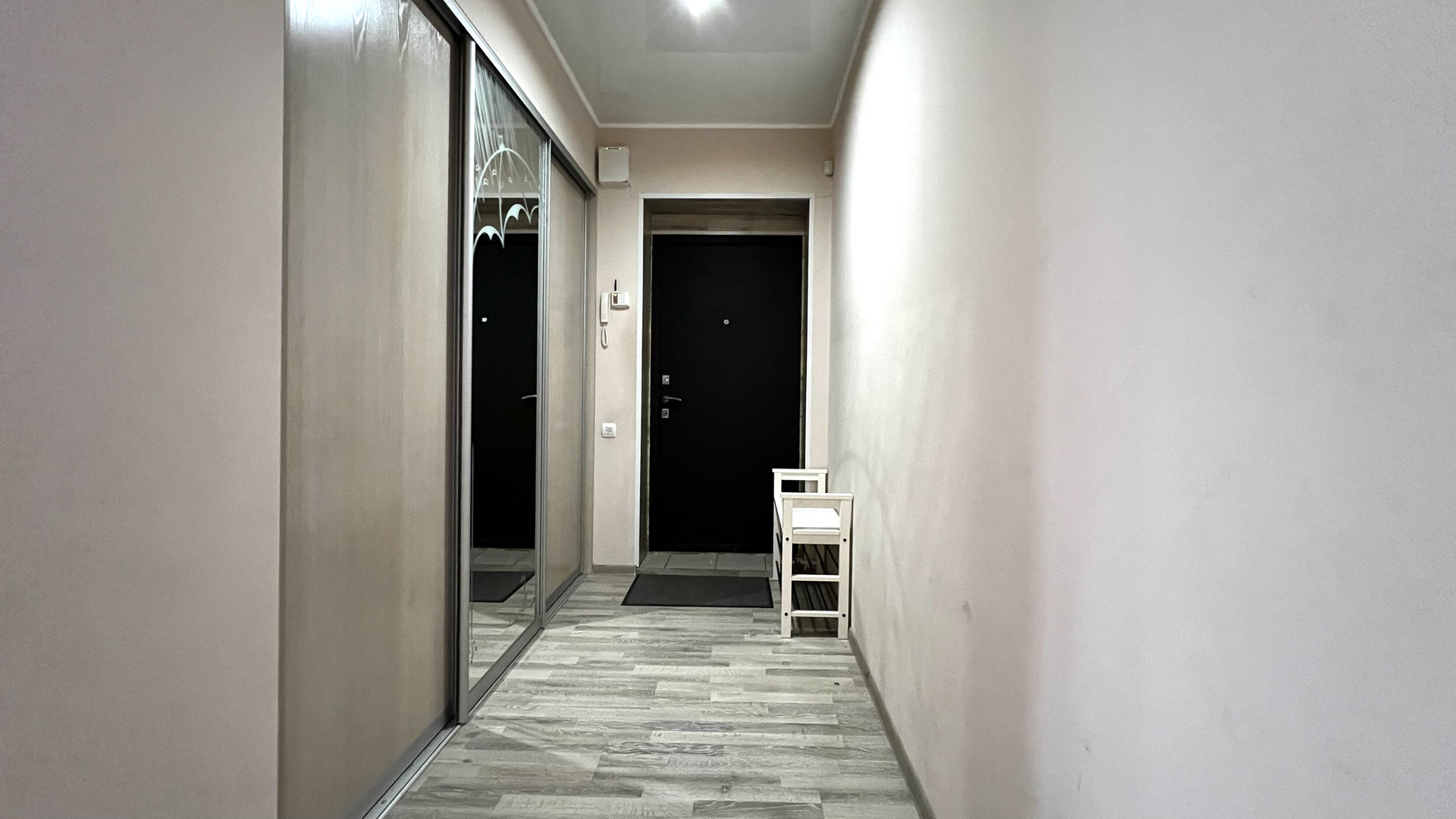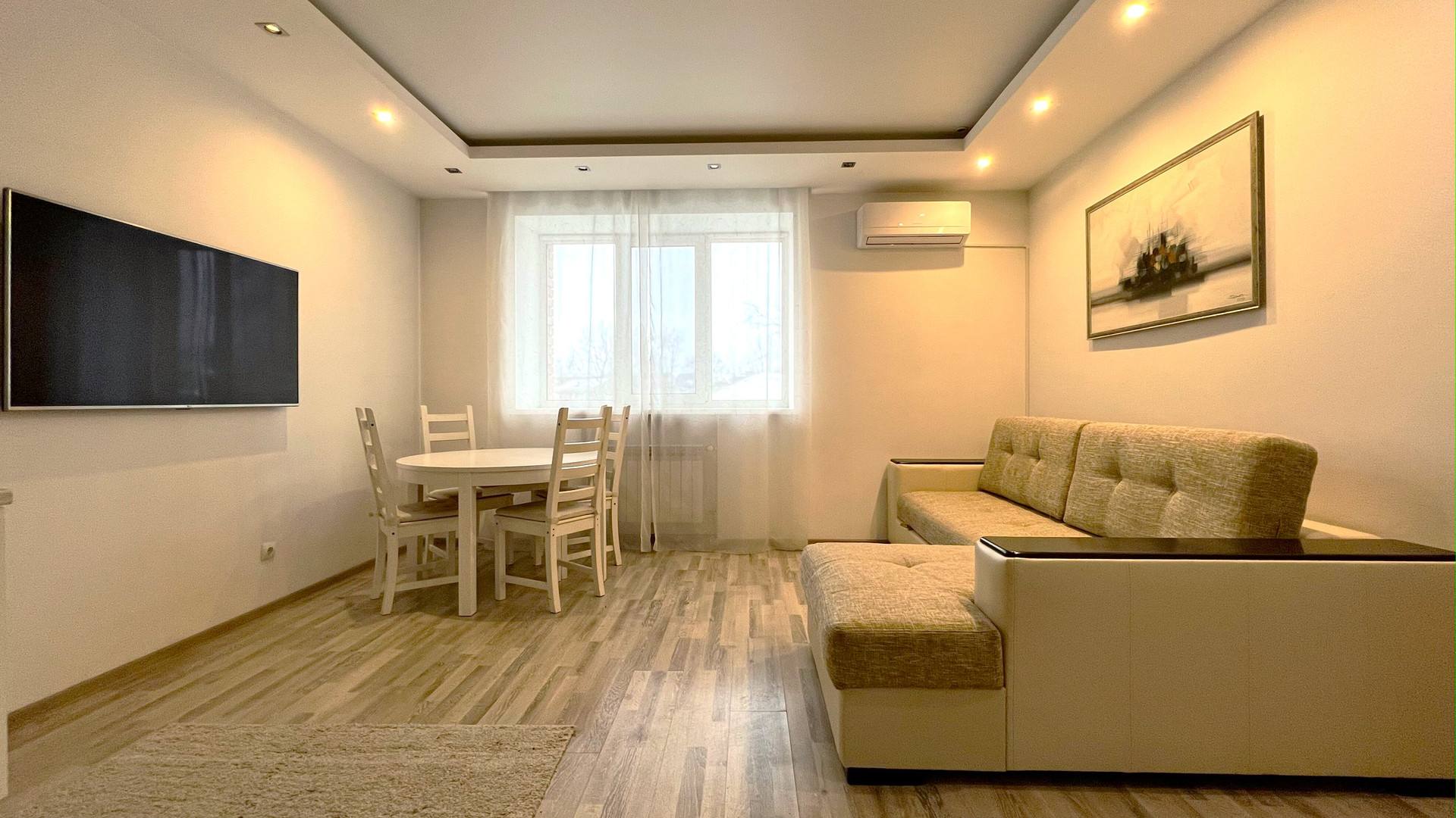 На полу ламинат, натяжной потолок с разноуровневой подсветкой и большим количеством световых точек.
