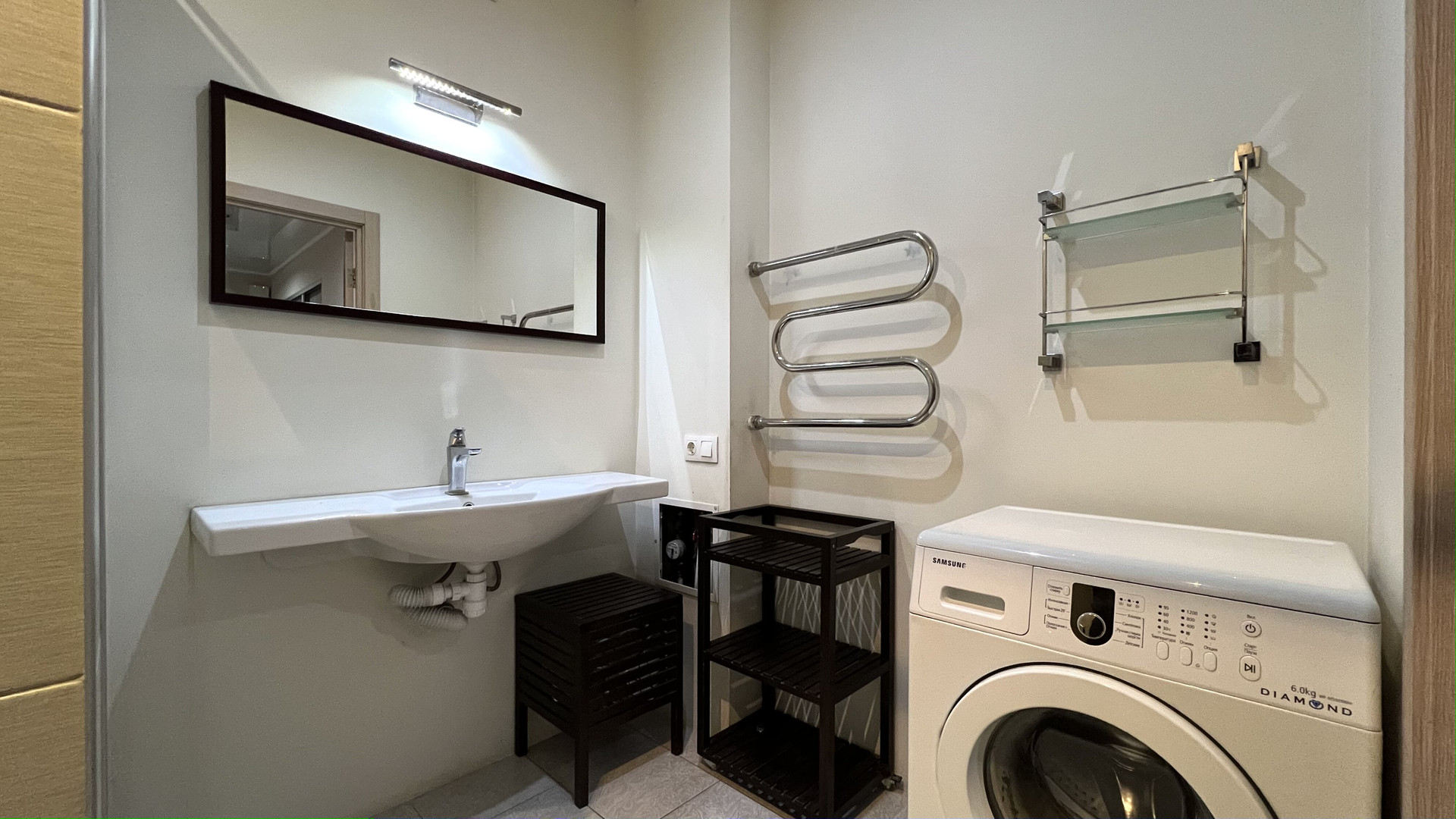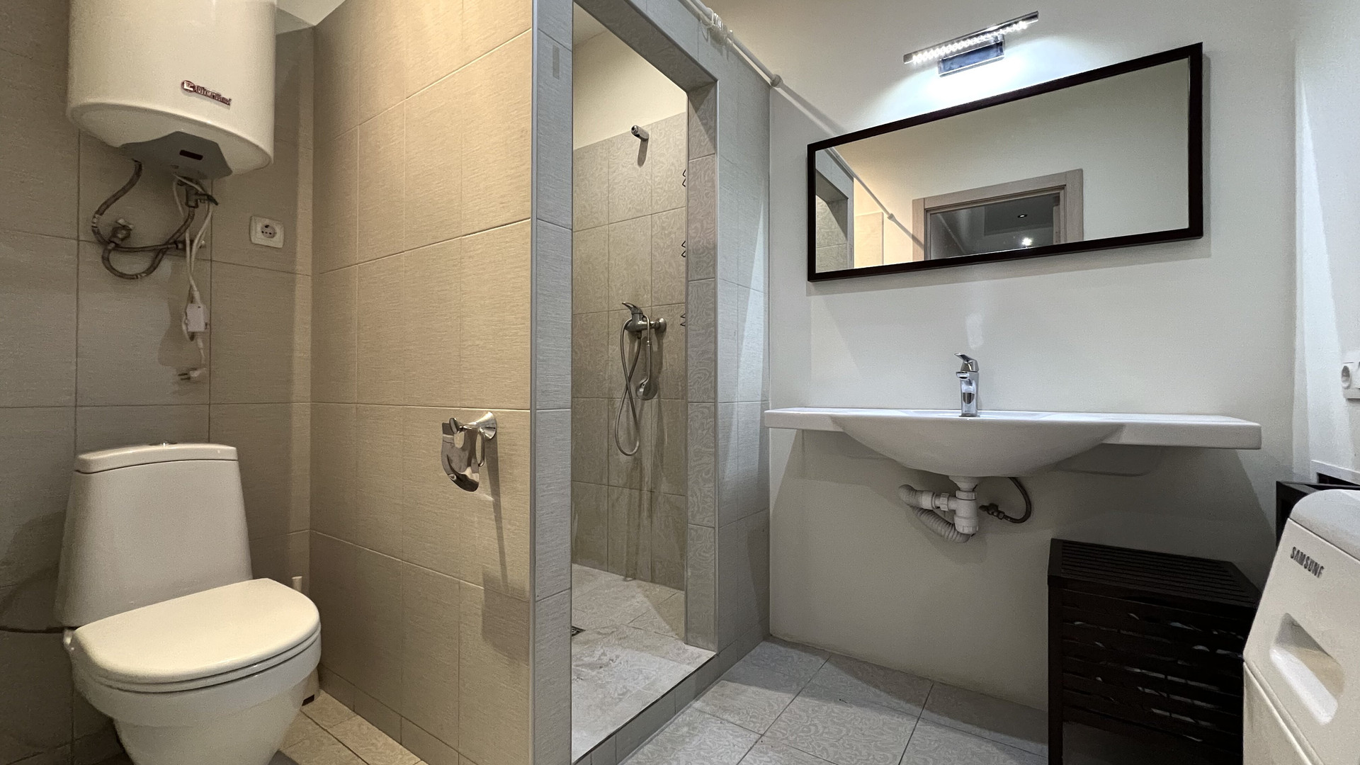 Санузел в кафеле, тропический душ, бойлер.
