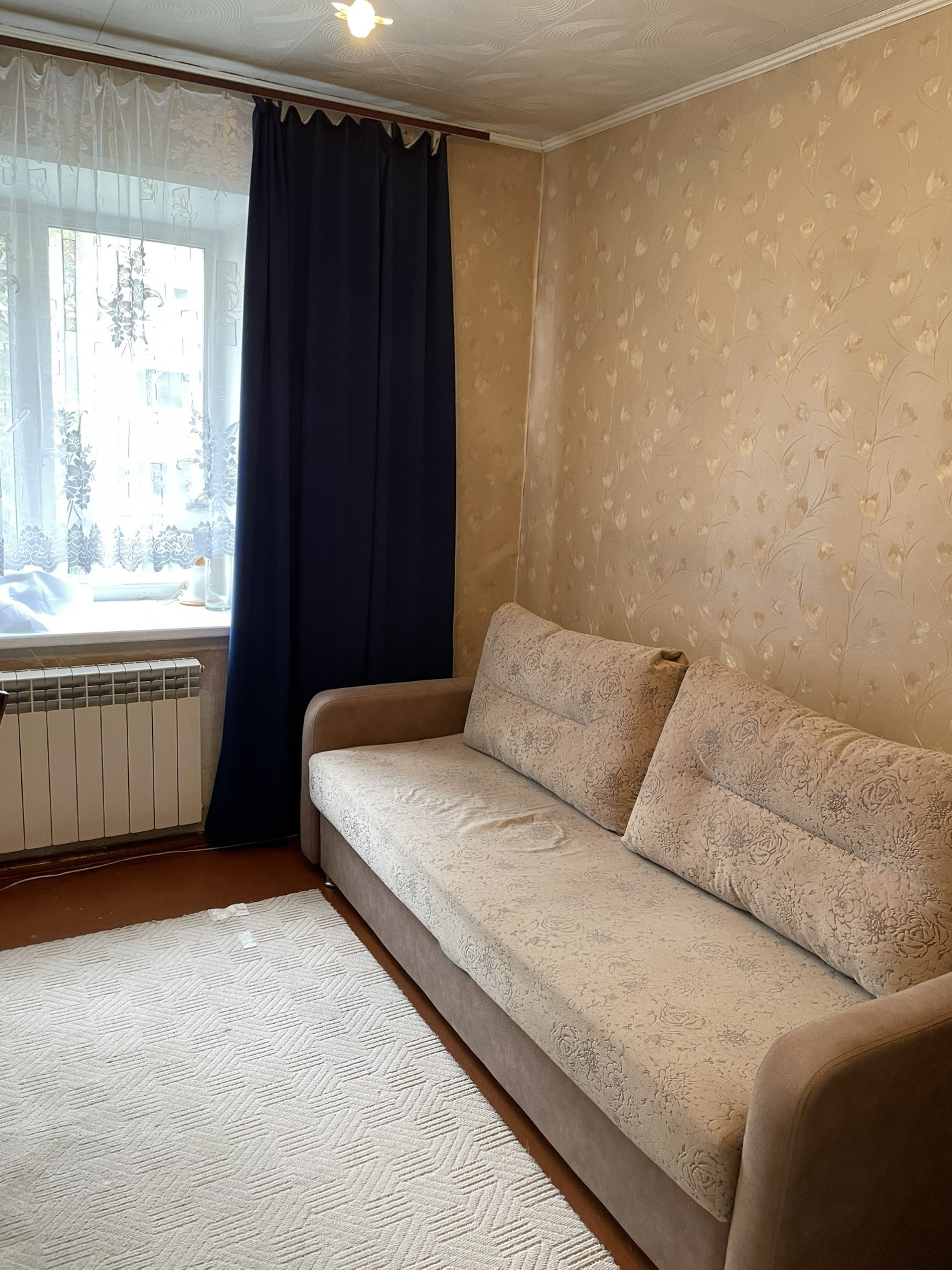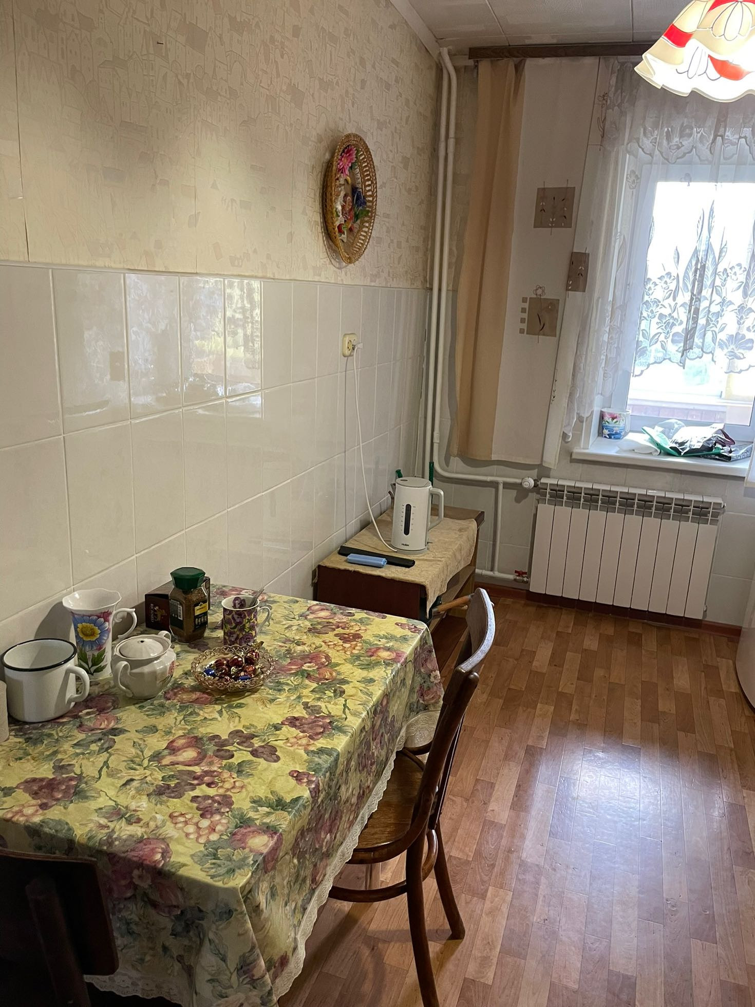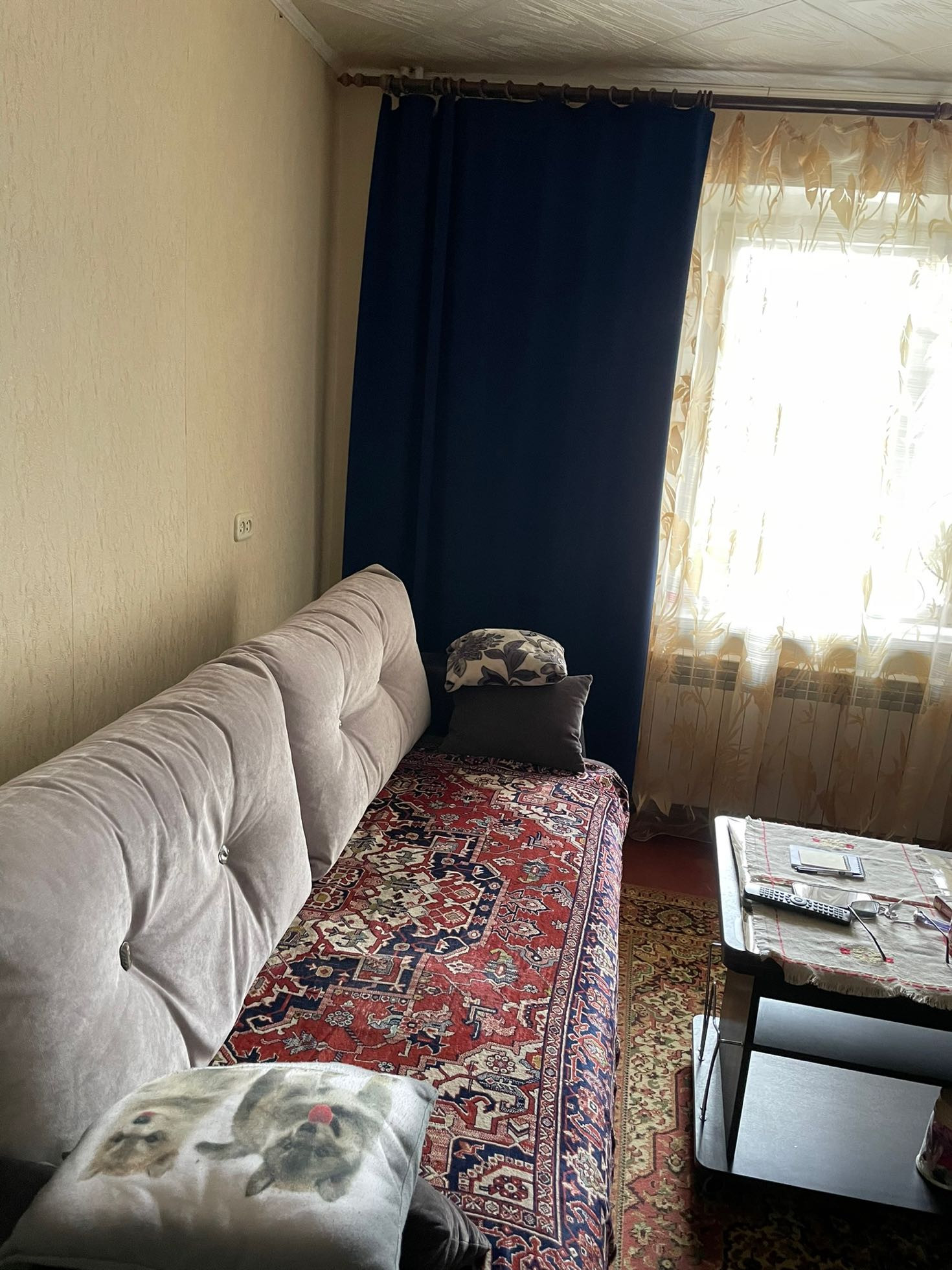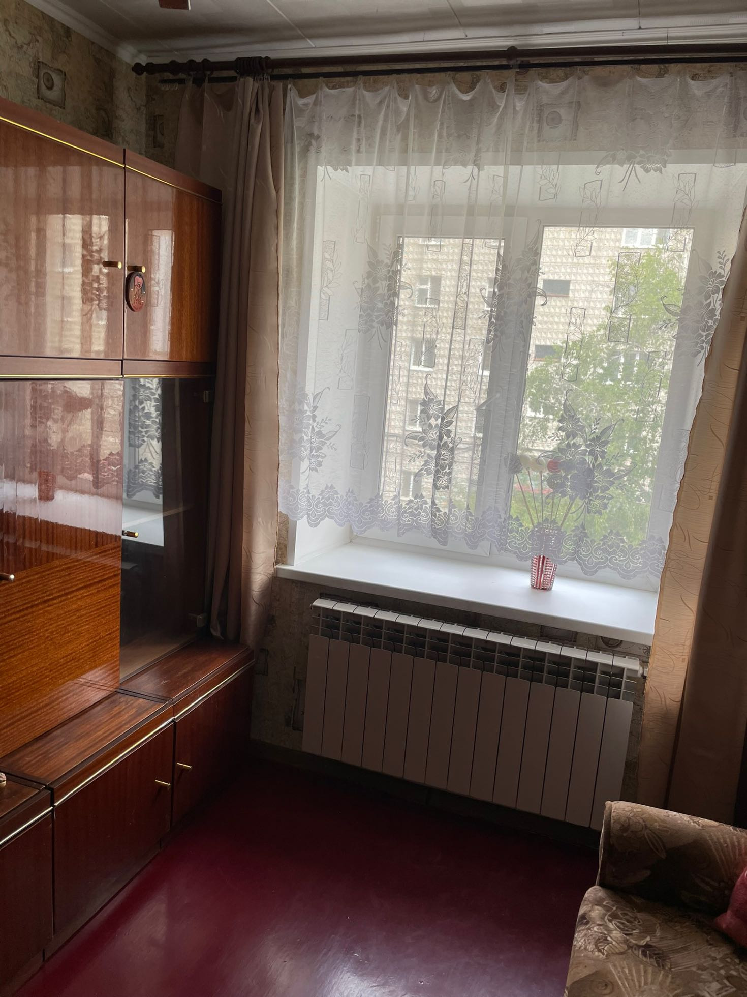 Квартира теплая и уютная с косметическим ремонтом располагается на третьем этаже шестиэтажного кирпичного дома. Все три комнаты имеют квадратную форму и полностью мебелированы. Вся мебель и бытовая техника остается новым жильцам. Дом находится в центре города,но в стороне от трасс.В данном районе есть все,что необходимо как взрослым, так и детям. Дом расположен рядом с Цетральным рынком города, имеется вся микроструктура- школы, детские сады, магазины, аптеки, спортивный комплекс.  Рядом с домом автобусная остановка, от которой можно доехать без пересадки в любой район города.