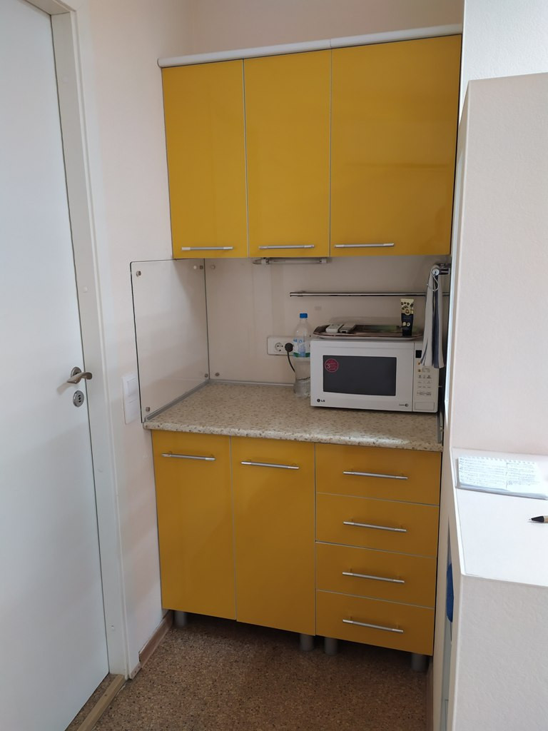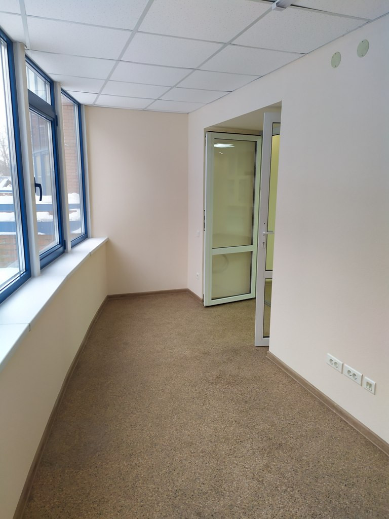 Помещение удобно зонировано: зона входа, основной зал, два закрывающихся кабинета, собственный санузел, «кухонная» зона.  Есть микроволновка, холодильник. Установлен кондиционер.