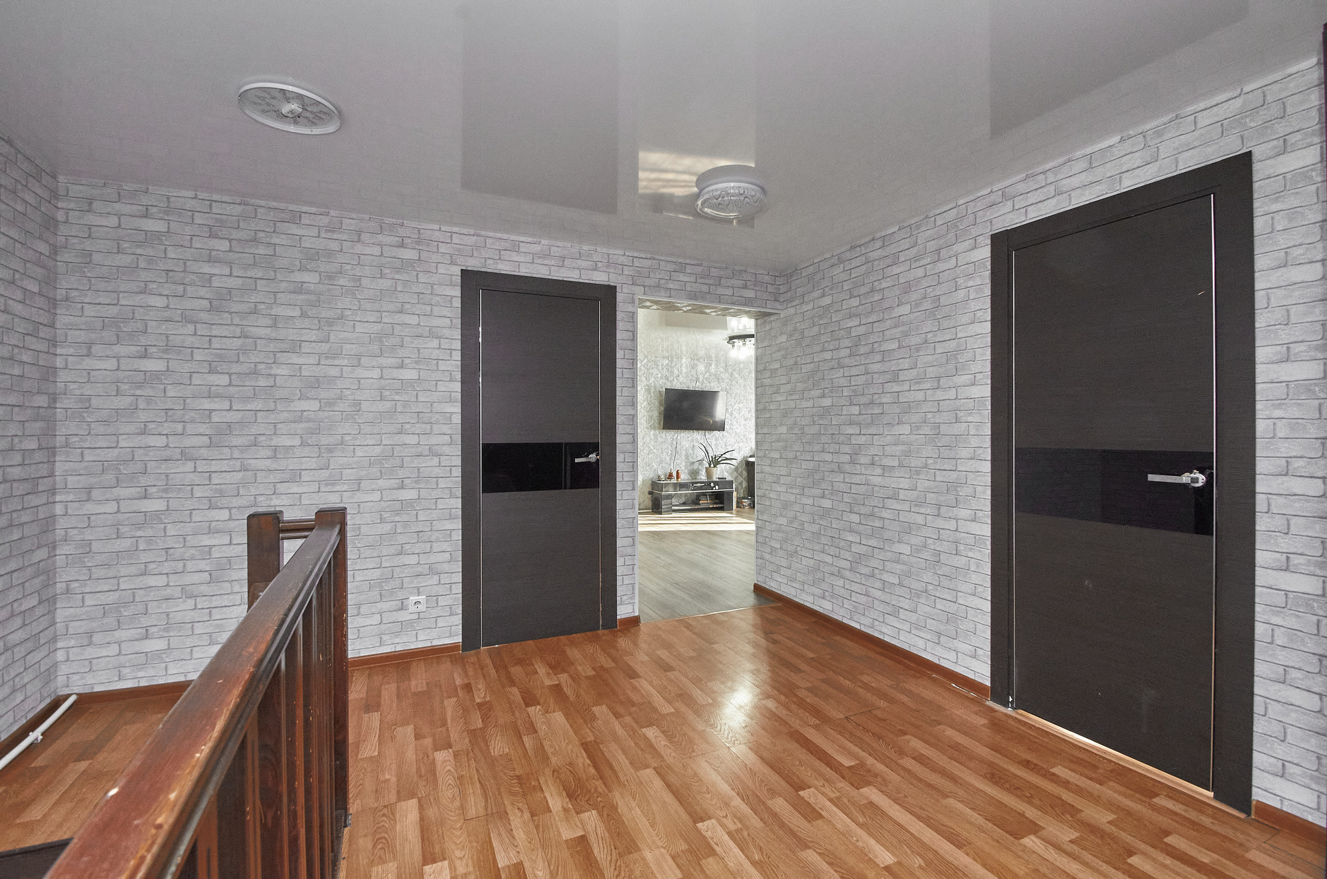 На первом этаже 64 кв.м. с тремя спальнями. Второй этаж 53, 2 кв.м. мансардный.