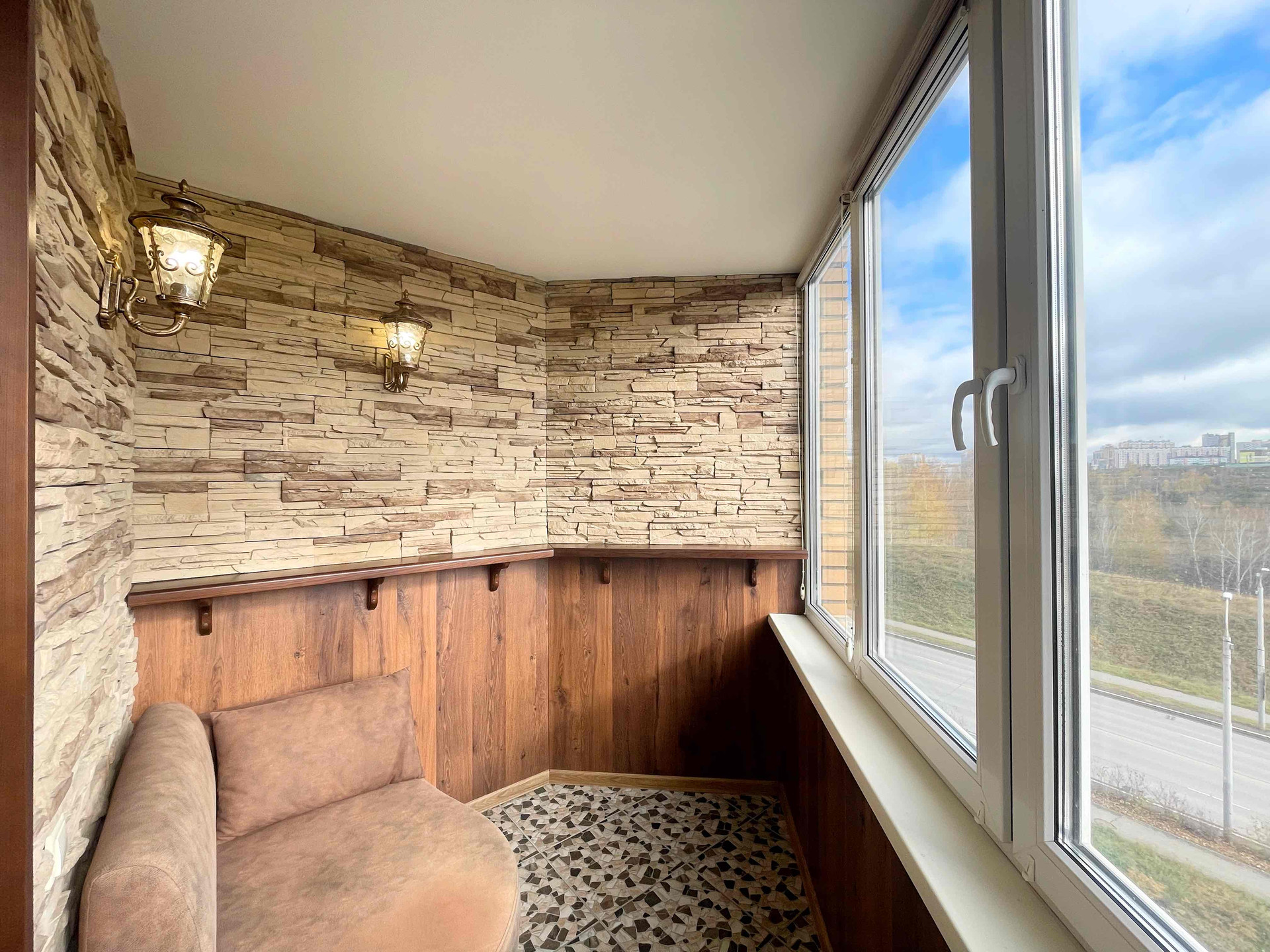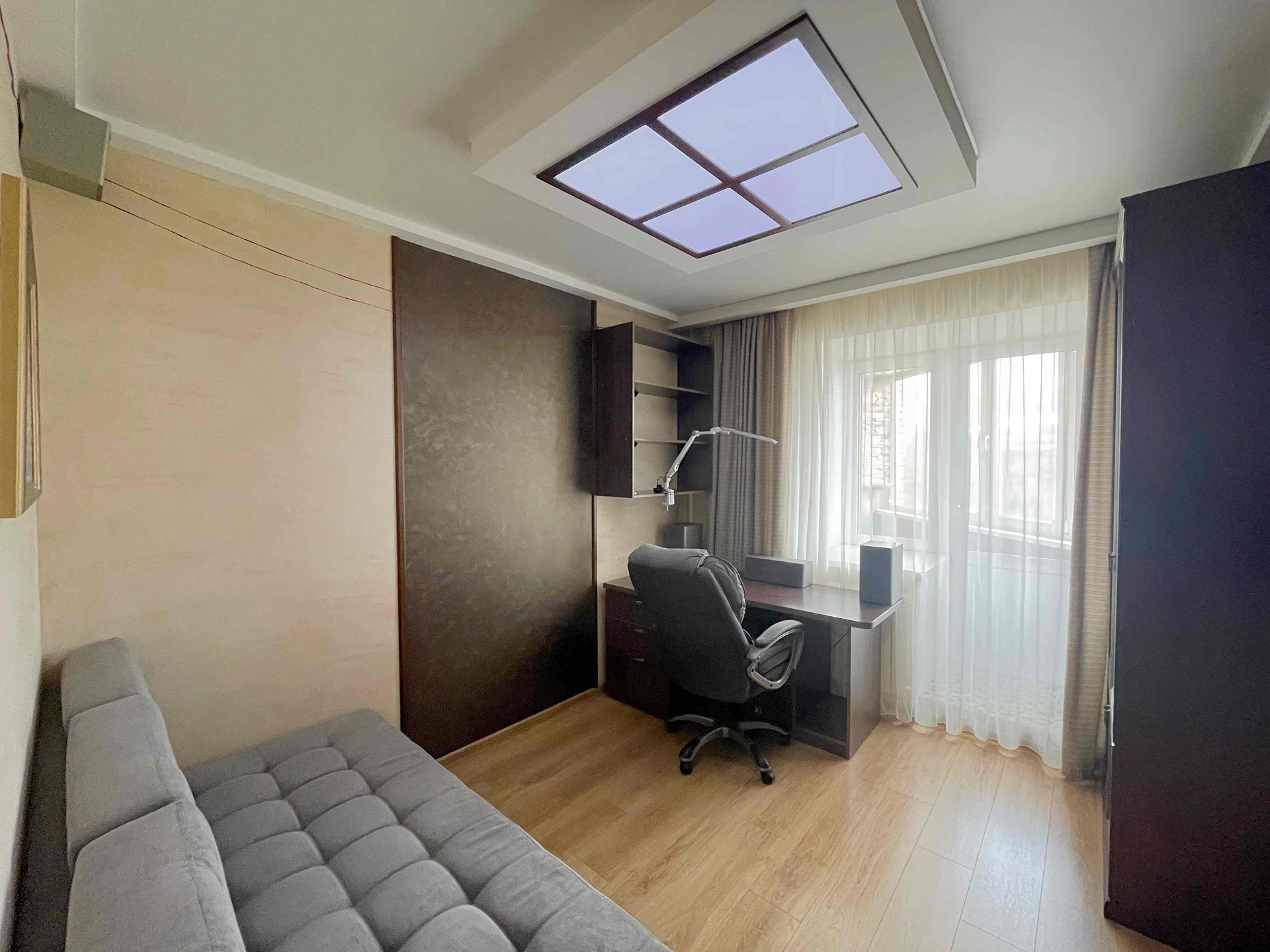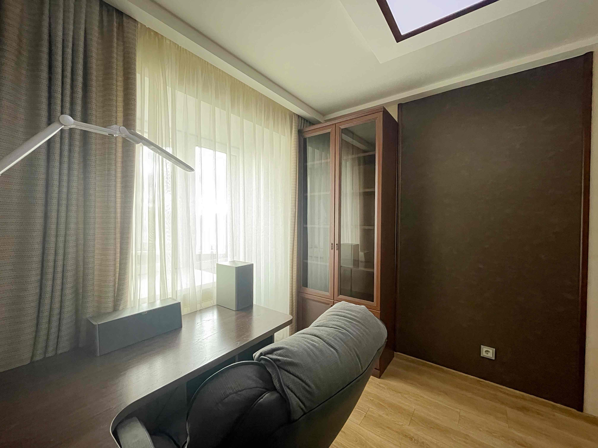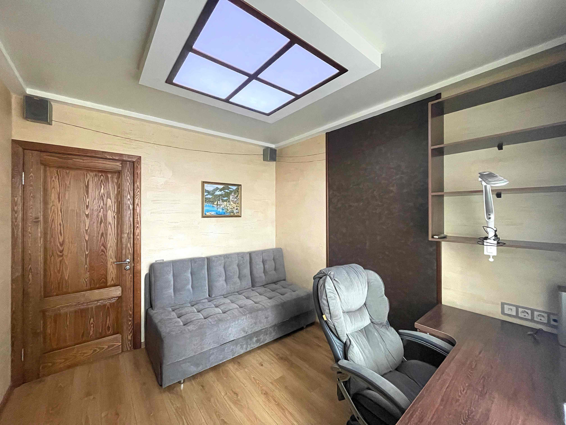 ✅ Рабочее место обустроено в отдельном кабинете, в котором имеется удобный письменный стол, книжный шкаф, настенные полки, диван. Отсюда же выход на утеплённую лоджию, где обустроена релакс-зона.