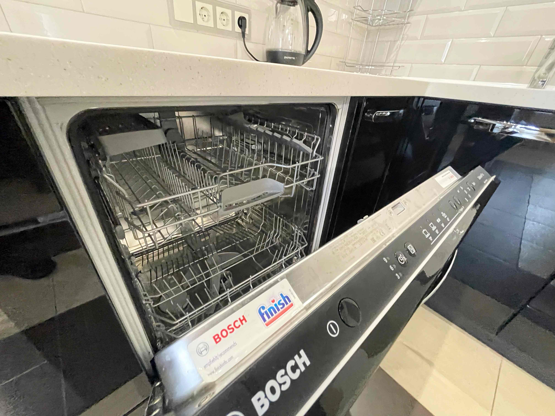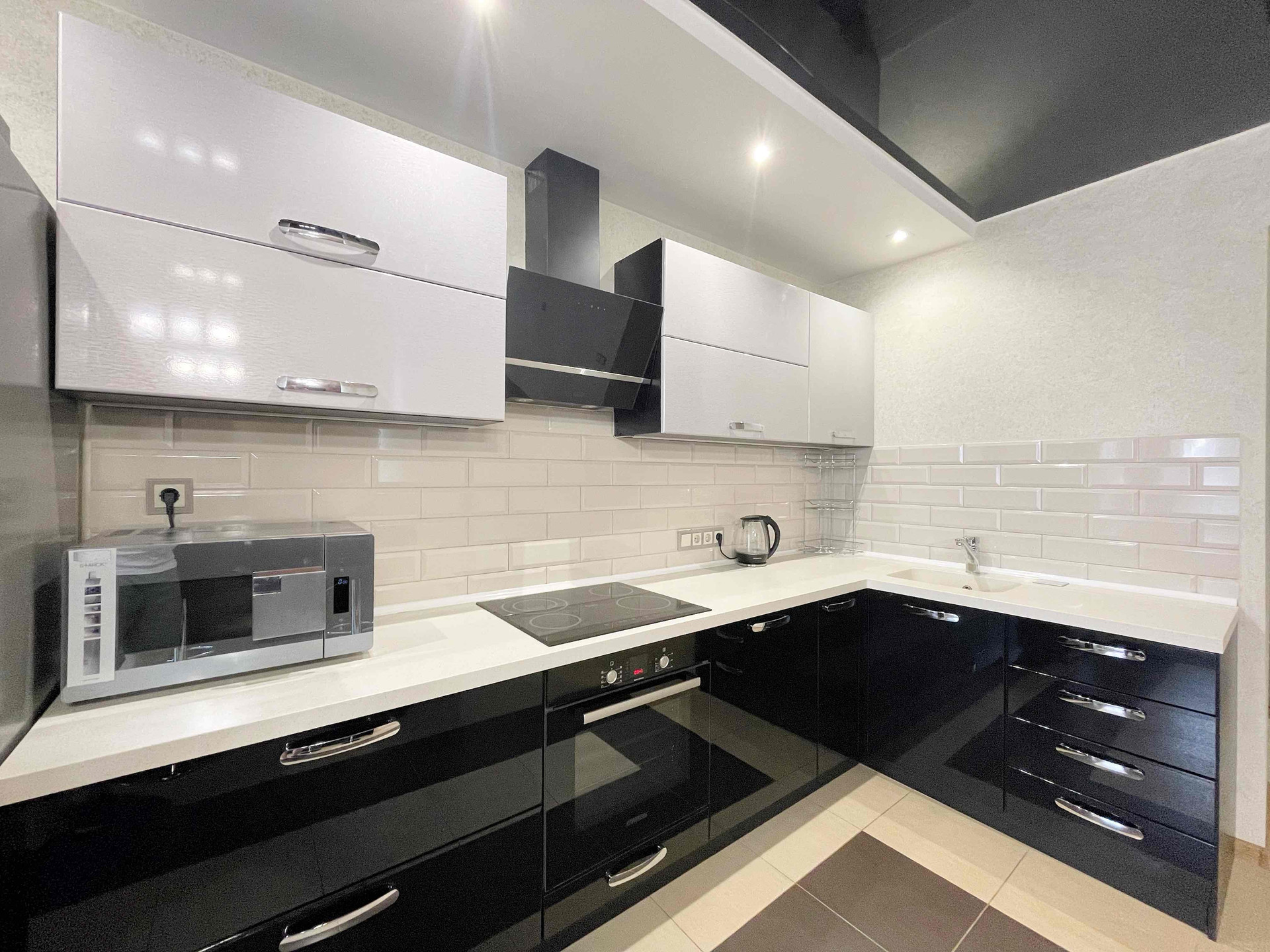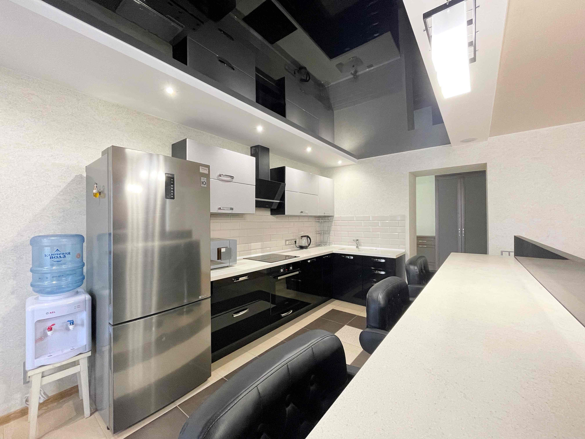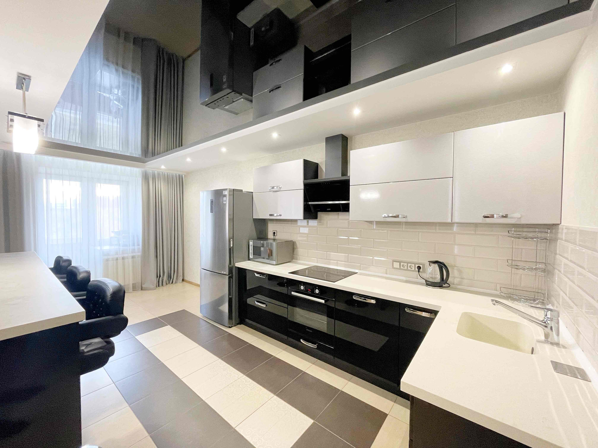 ✅ В просторной кухне-гостиной современный кухонный гарнитур со встроенной бытовой техникой (варочная панель, духовой шкаф, вытяжка, пмм), а также холодильник, микроволновая печь, аэрогриль, мультиварка, чайник, барная стойка со стульями.