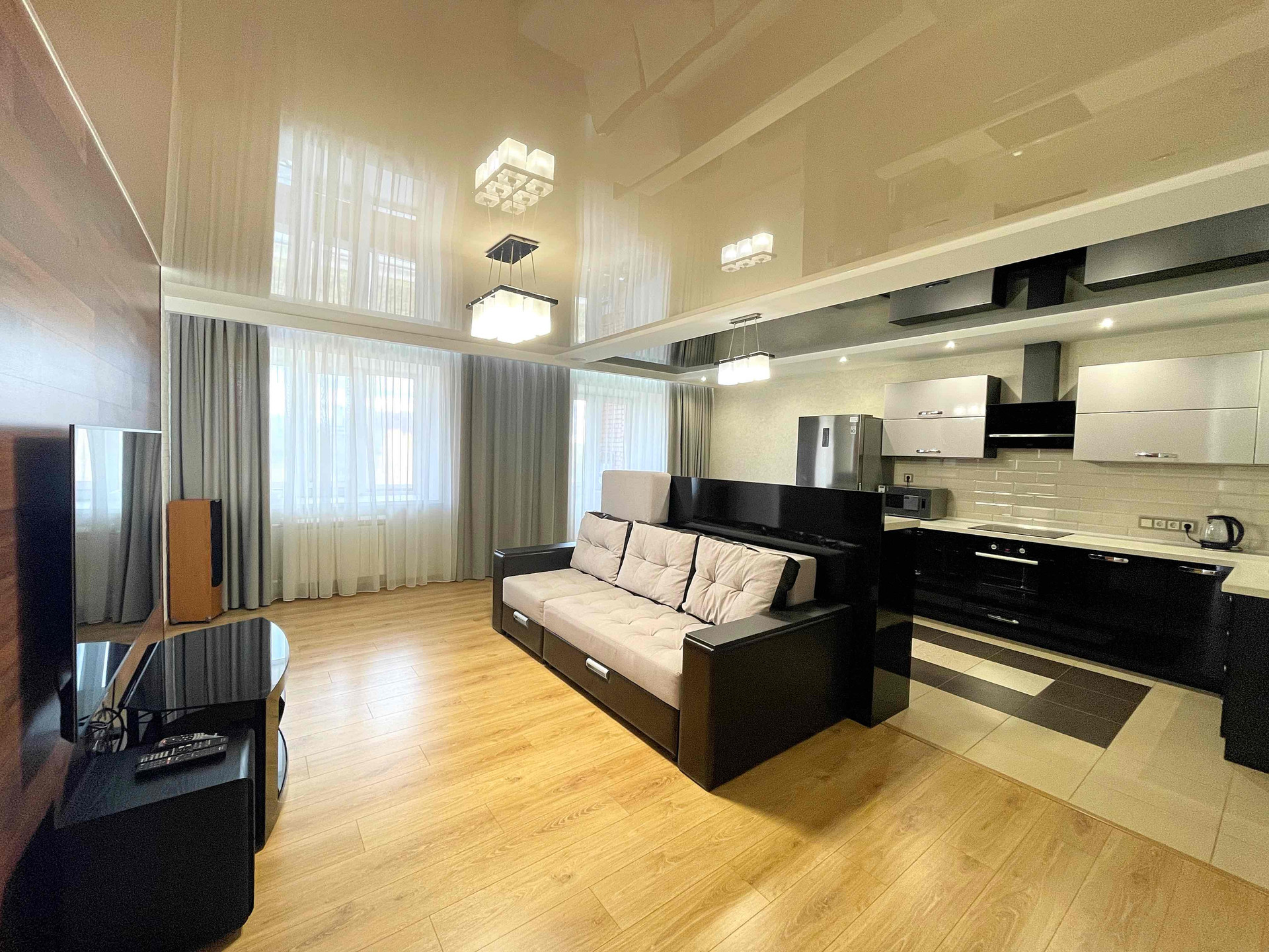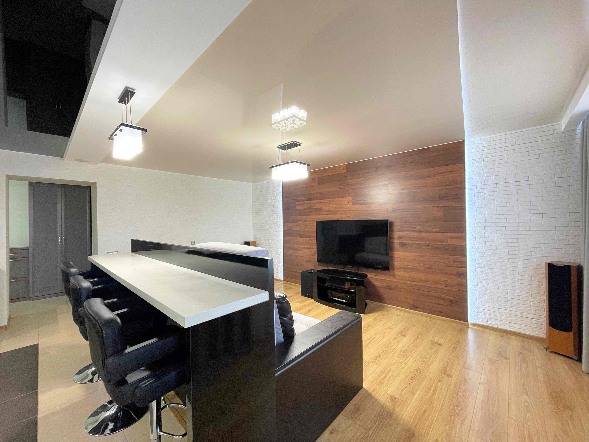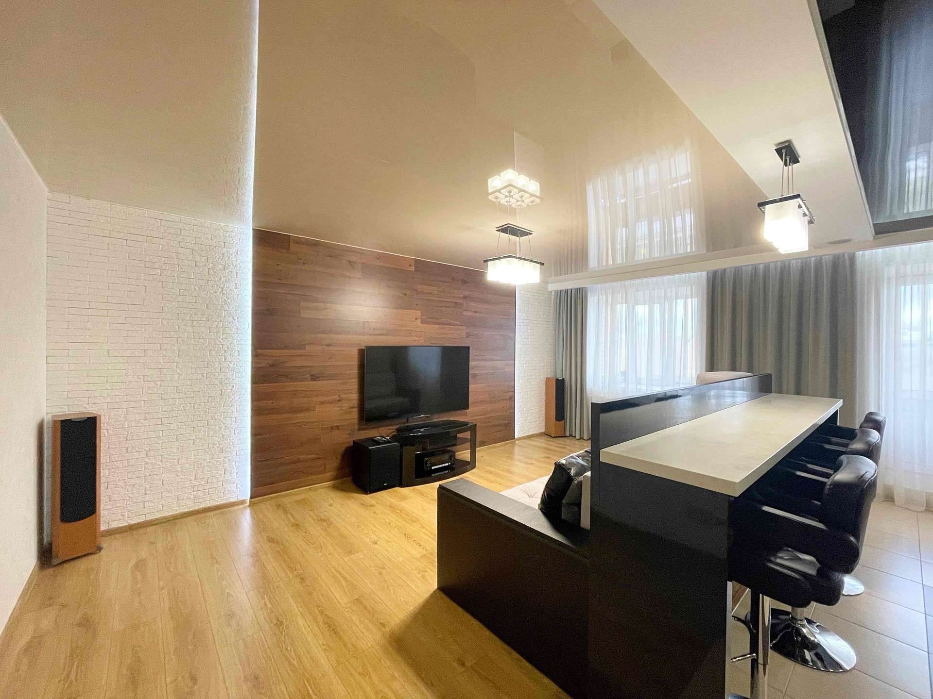 ✅ В зоне гостиной удобный диван, домашний кинотеатр, телевизор 65 дюймов. Настоящий рай для ценителей качественного звука.