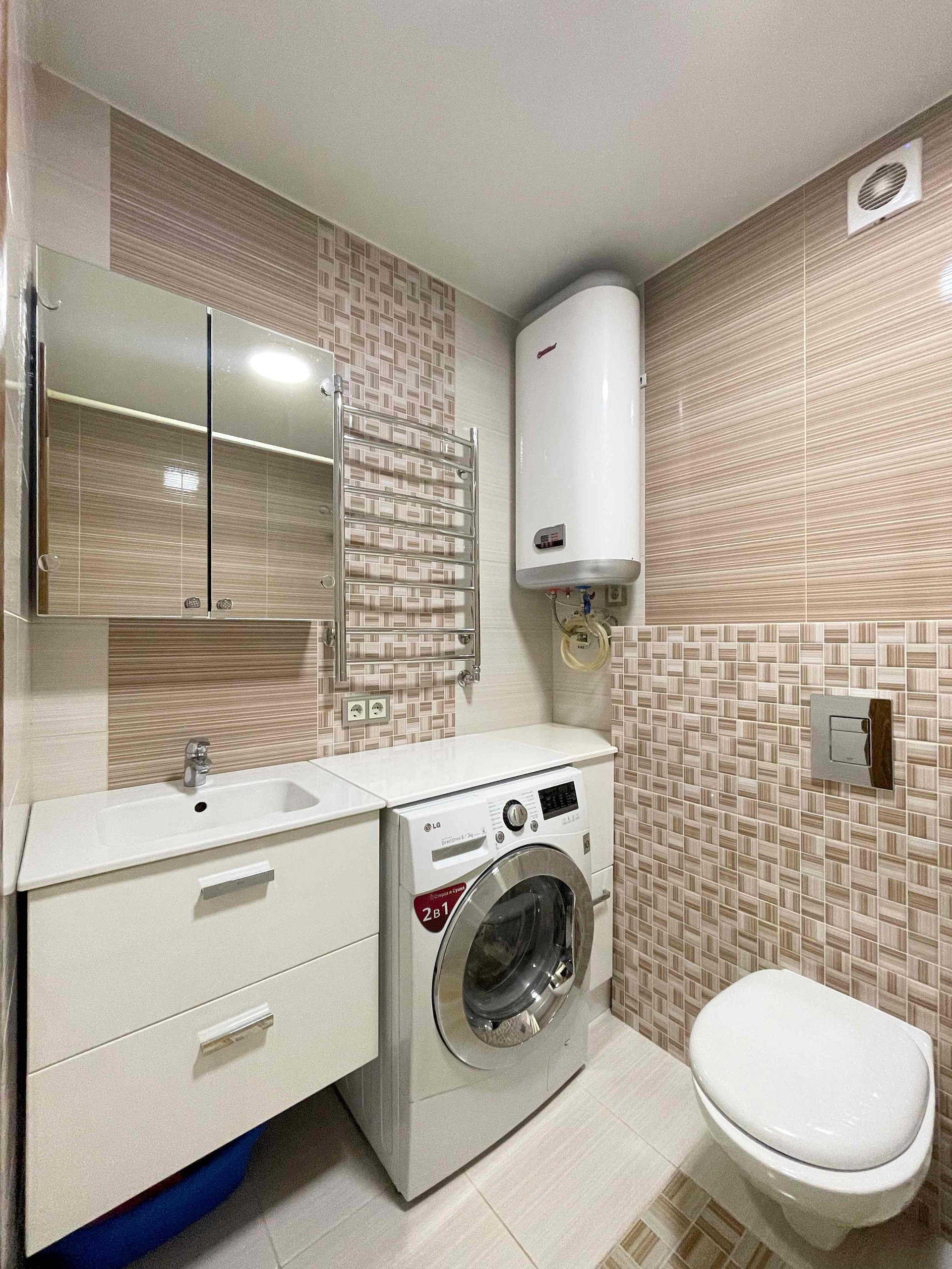 Санузел совмещённый. Здесь имеются водонагреватель, стиральная машина с сушкой, раковина, инсталляция, ванна, фен.