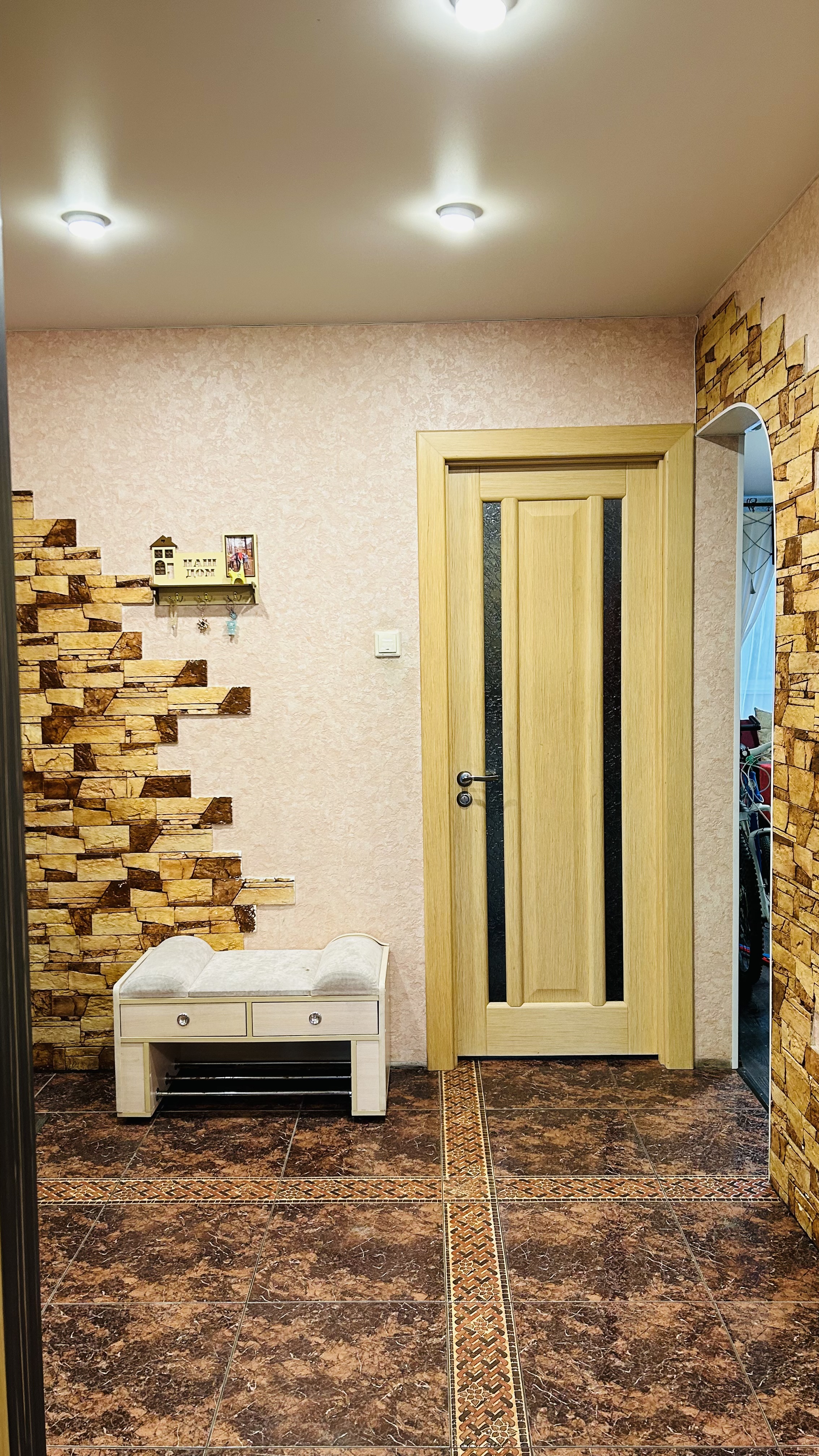 Прихожая: вместительный шкаф-купе (угловой), удобный диванчик-обувница, стильная входная дверь с зеркалом повышенной надежности (ригеля выдвигаются во все стороны двери).