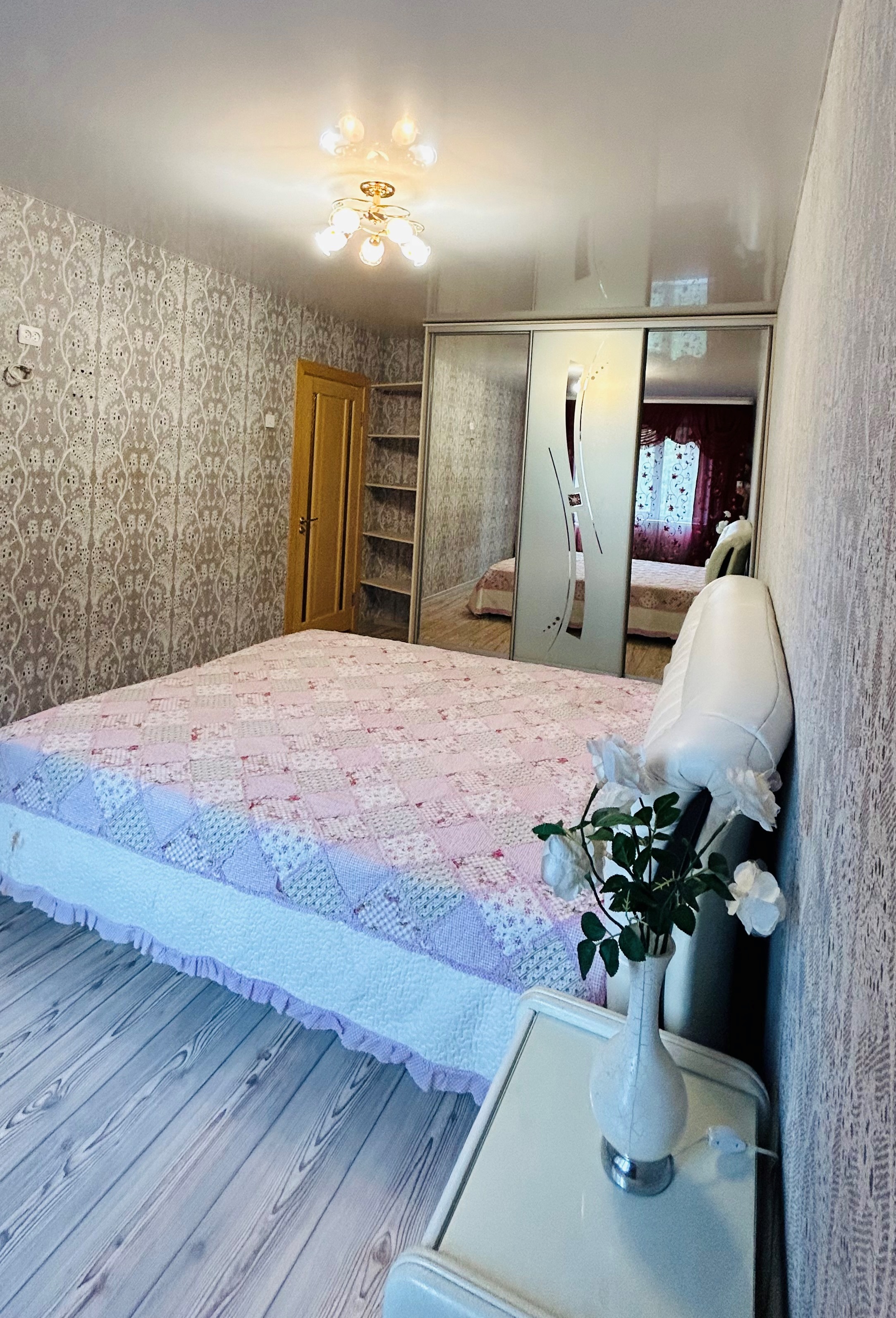Спальня (17,2 кв.м): огромный шкаф купе с зеркальными дверьми. Кровать king-size (200*200). Прикроватные тумбочки. На стене предусмотрена проводка под ТВ.