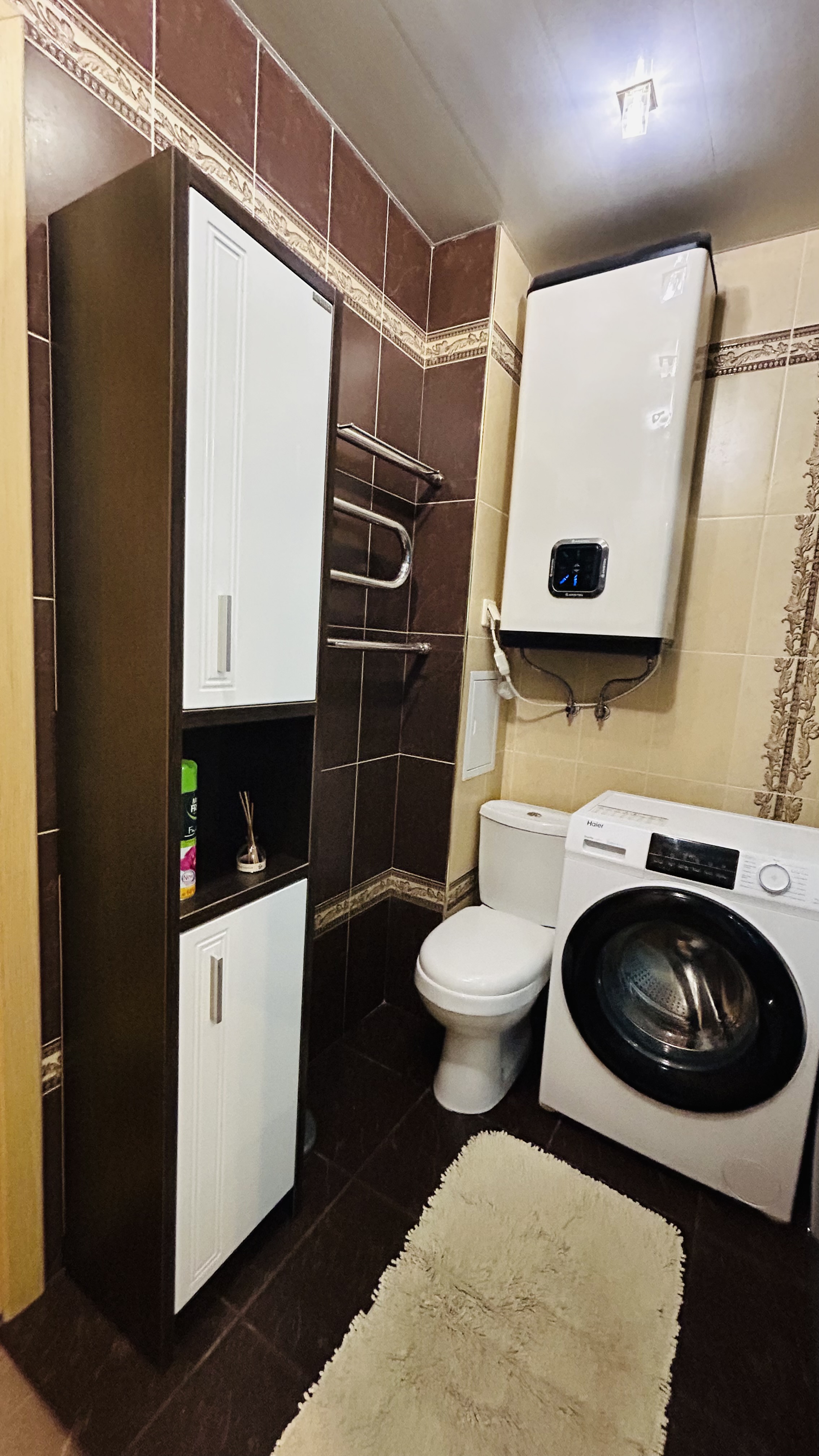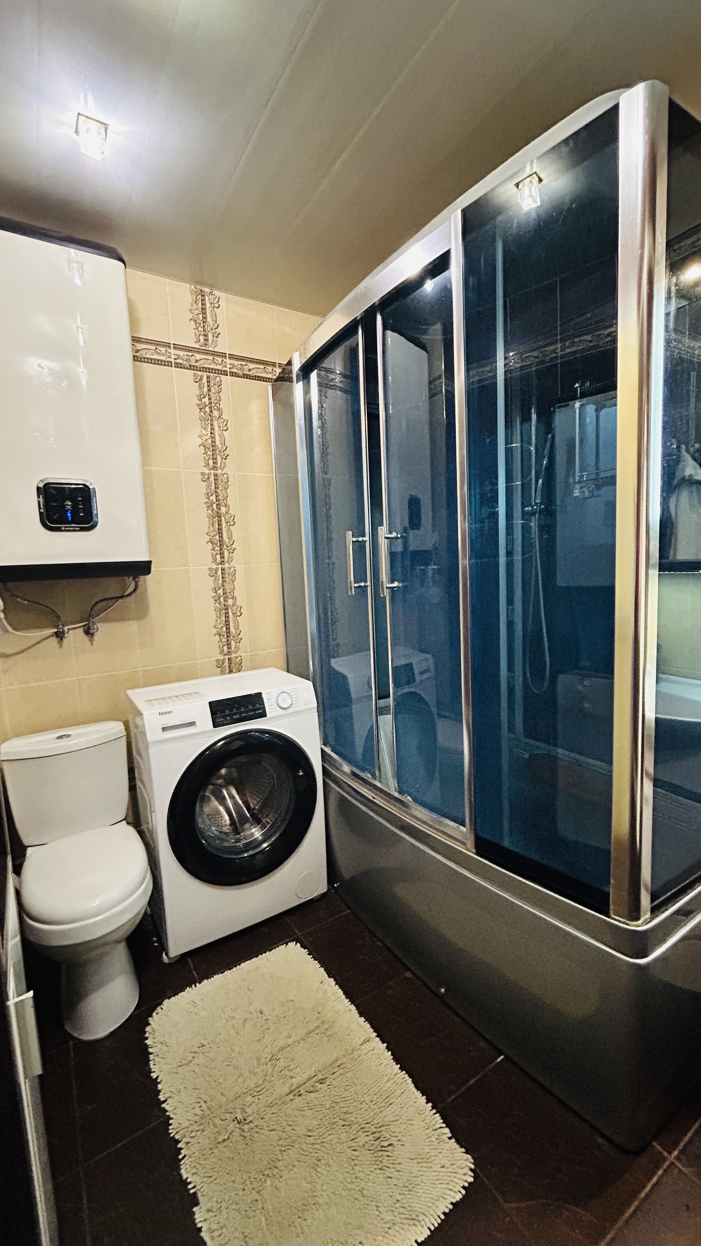 Ванная комната (5,0 кв.м): очень просторная, большая душевая кабина с возможностью принимать ванну, пенал, мебельный уголок с зеркалом, раковиной, отдельным зеркалом для макияжа и светодиодной подсветкой, бойлер Ariston на 80 литров, стиральная машинка Indesit.