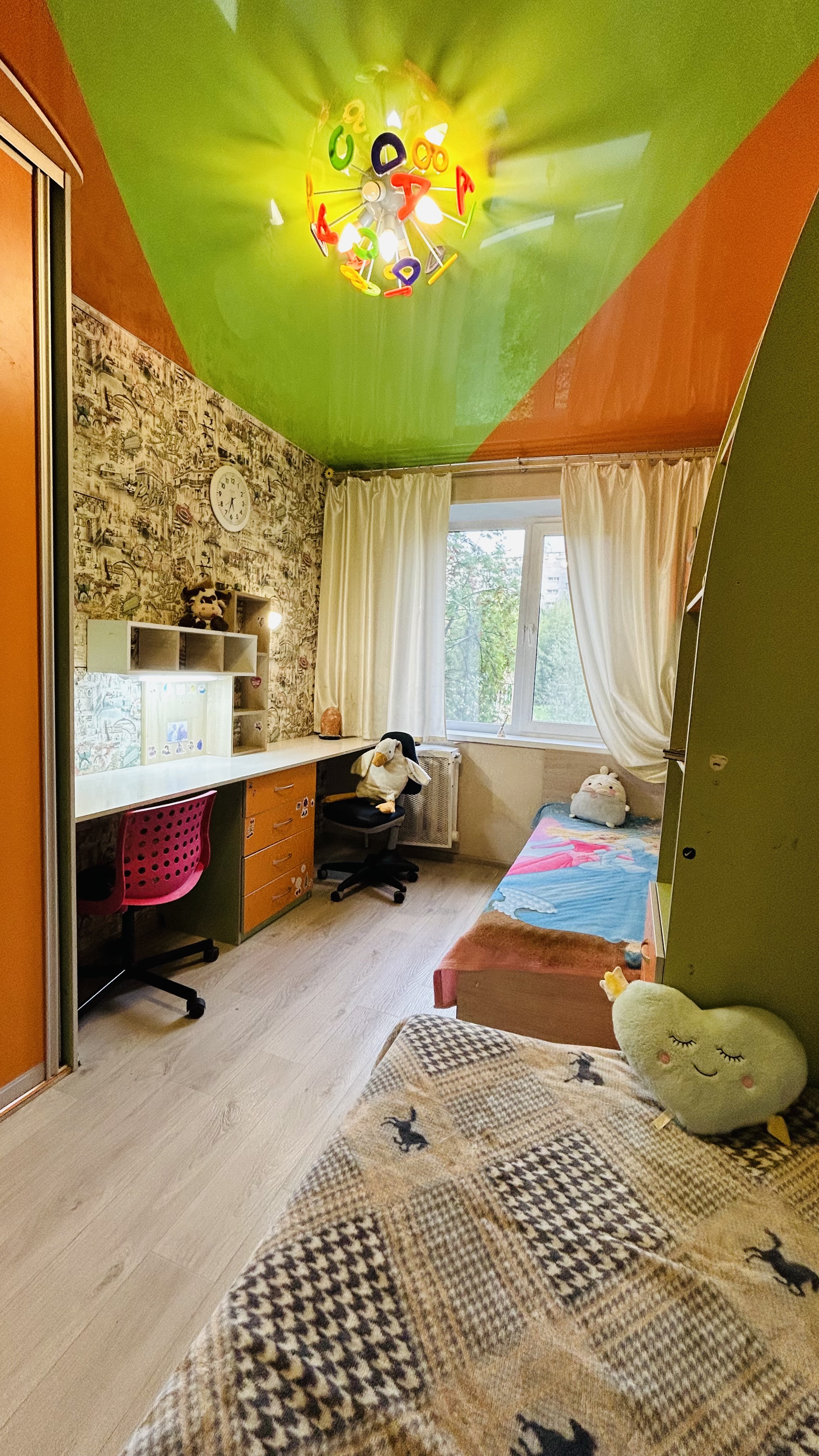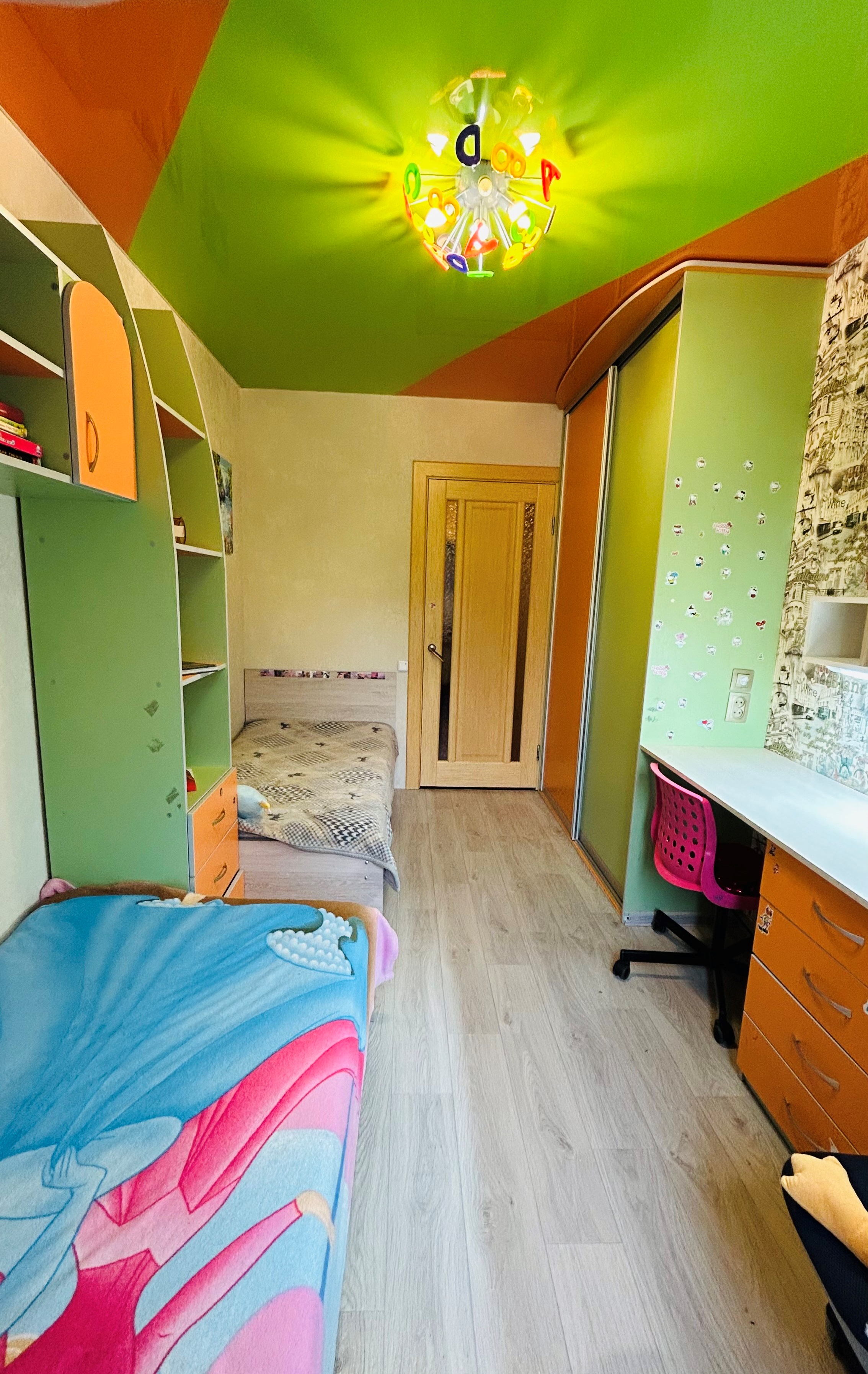 Детская (10,3 кв.м): 2 кровати для детей-подростков, учебный стол с зонированием на 2 рабочих места и встроенной подсветкой. Вместительный шкаф-купе. Настенные полки и пенал. Натяжной потолок яркой раскраски (зеленый/оранжевый).