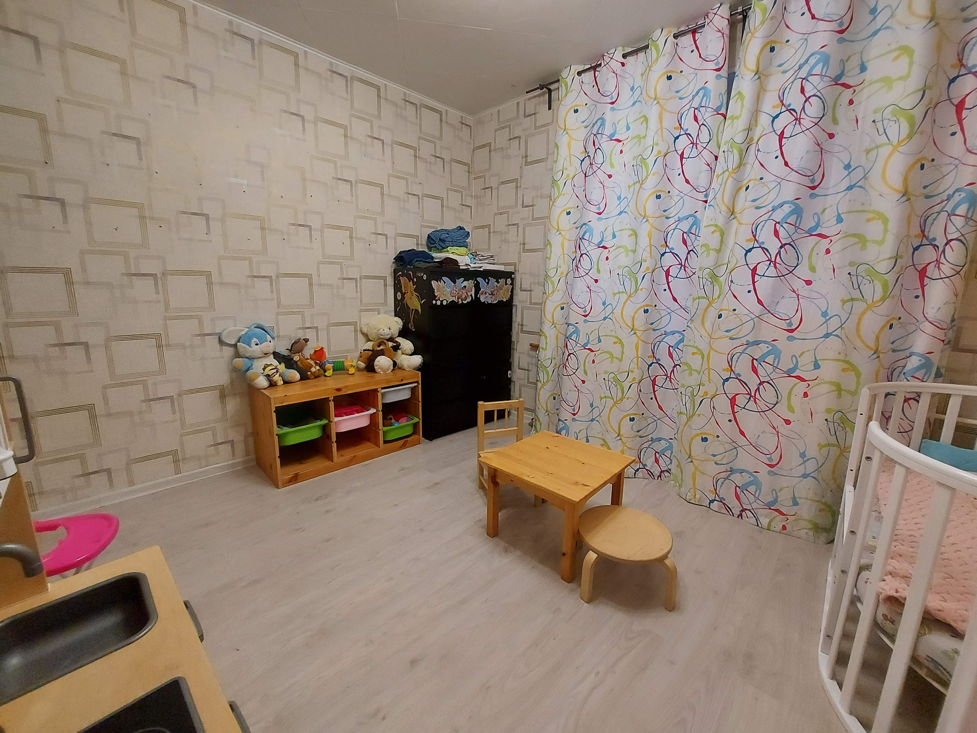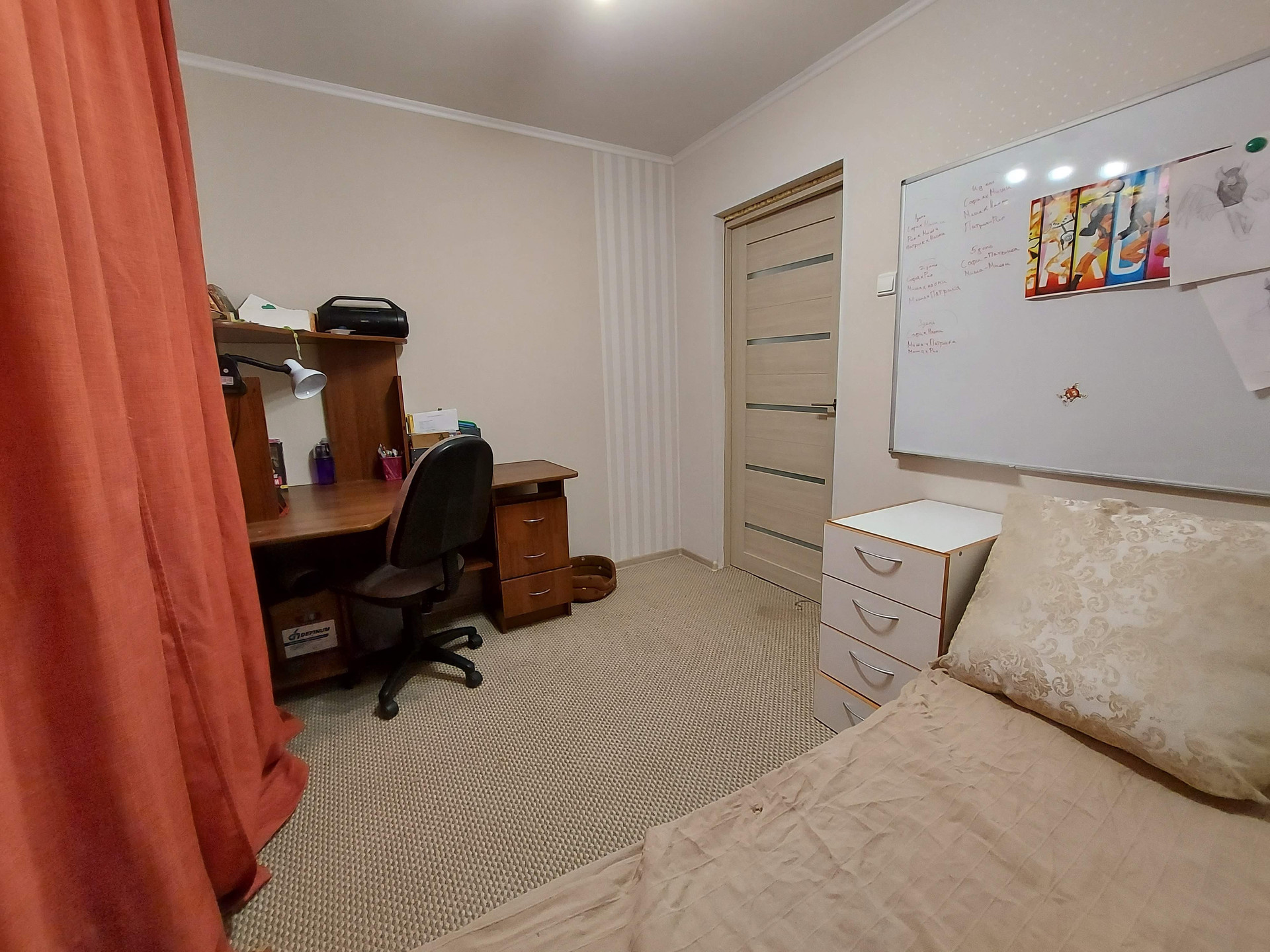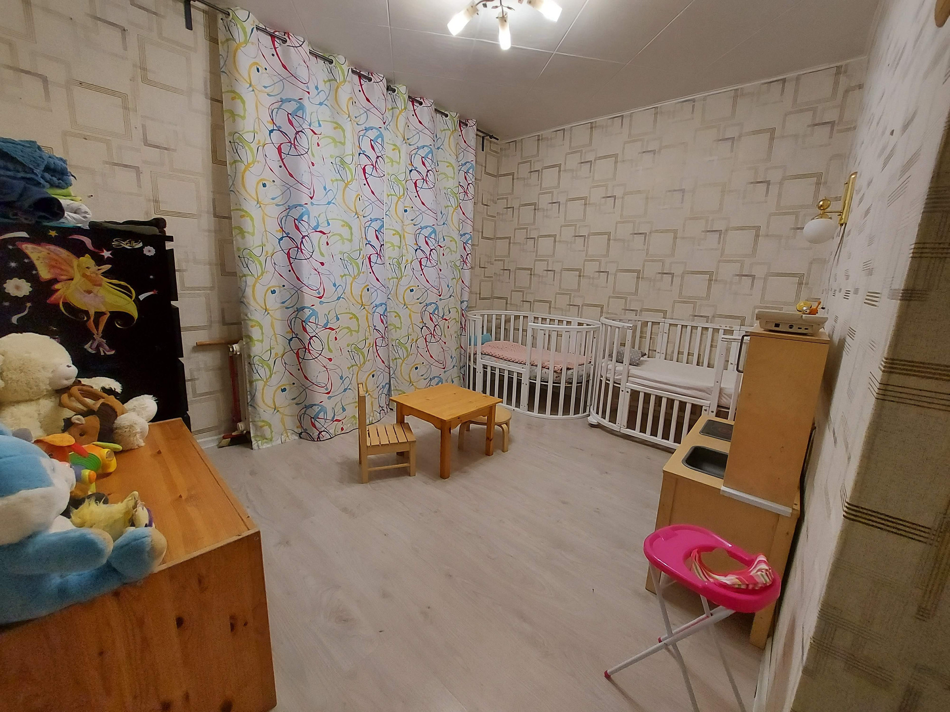 Большая комната квадратная S = 16.6 кв.м., за ней следует комната S = 11.5 кв.м. и самая маленькая комната S = 9 кв.м. Четвертая комната отделена квадратным коредором, идеальное место для гардероба и хранения вещей, S комнаты =12.6 кв.м.