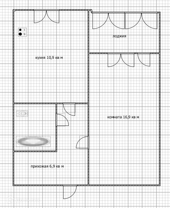 - Кухня 10,9 кв.м., комната 16,9 кв.м. с выходом на лоджию