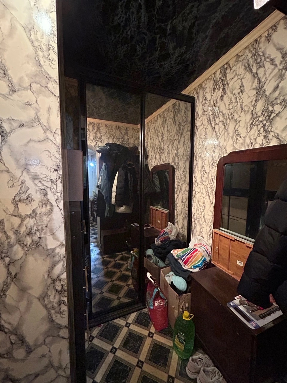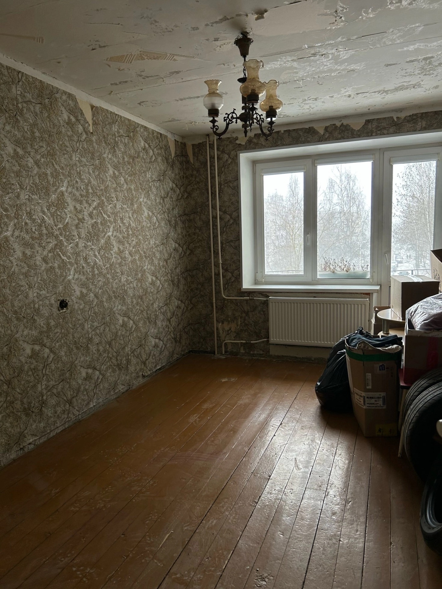 Кухонная гарнитура, сантехника, мебель в гостиной и шкафы остаются.