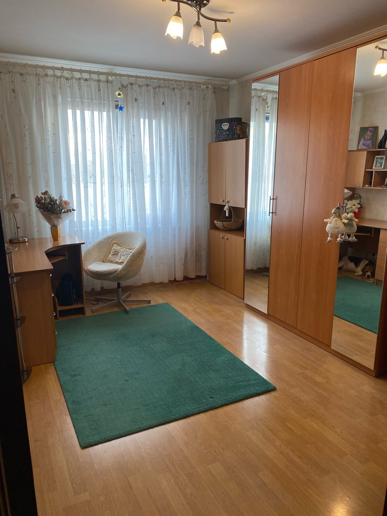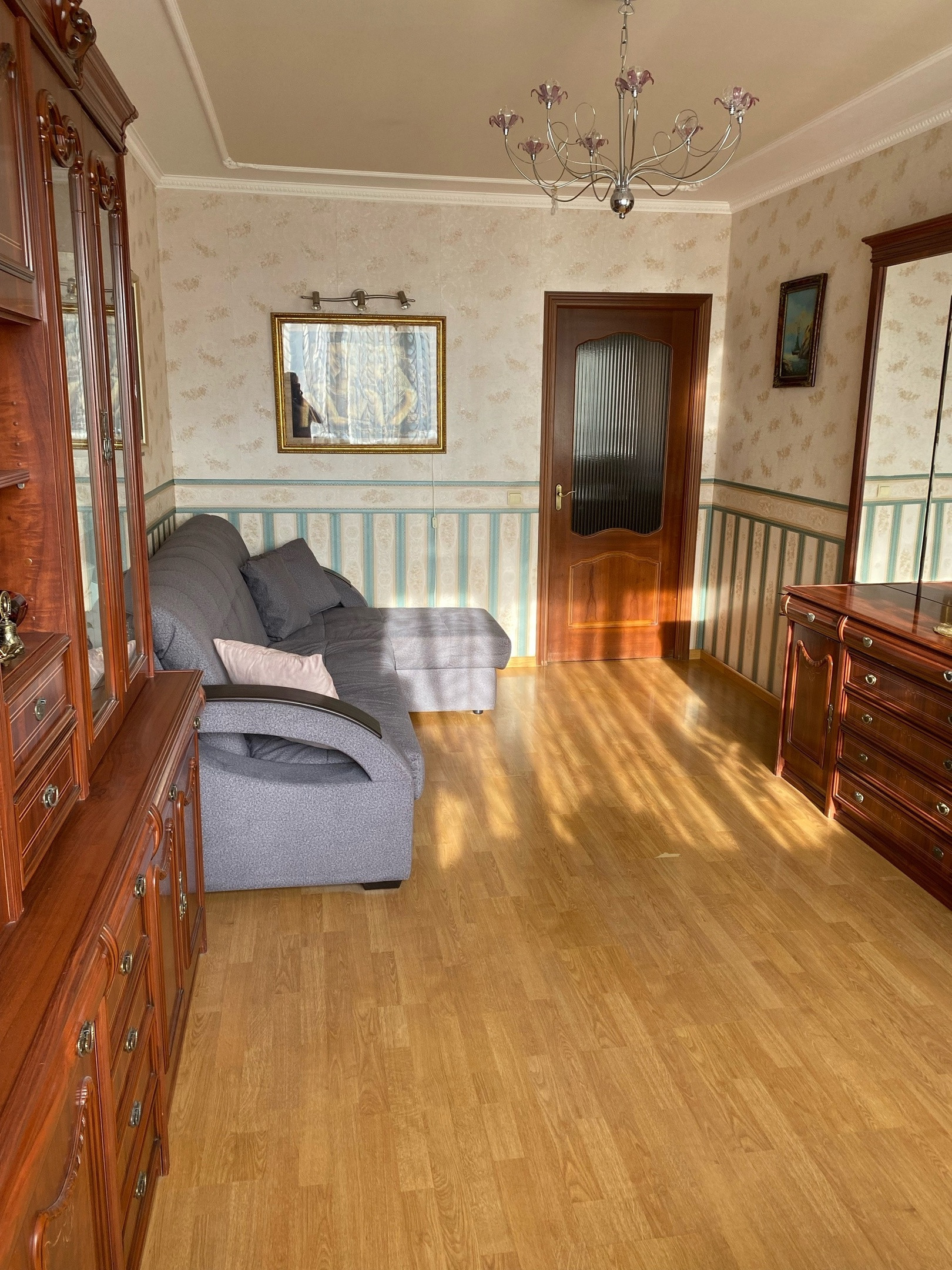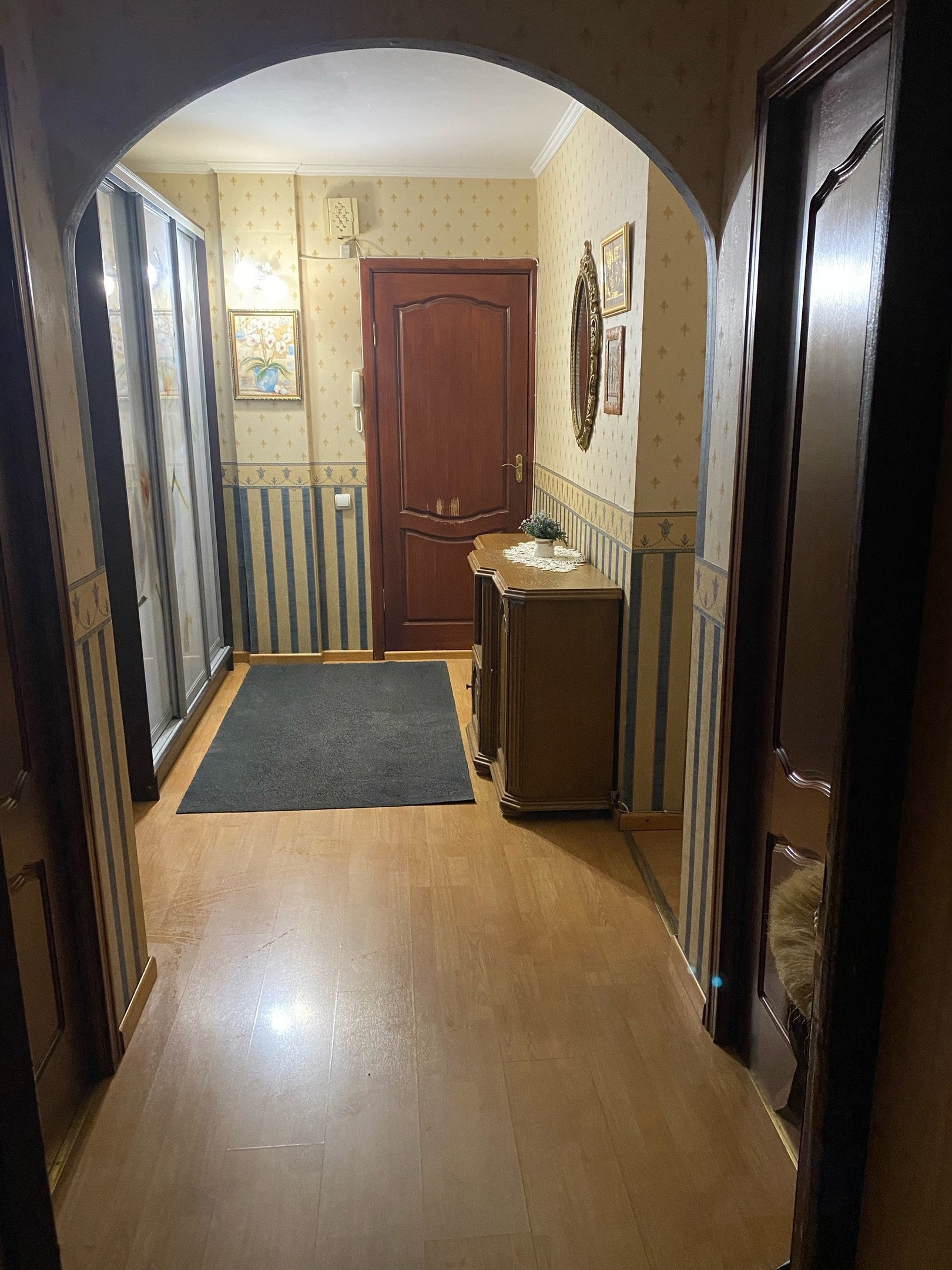 Косметический ремонт, французский ламинат, испанские двери из натурального шпона, испанский кафель, шведская сантехника, стеклопакеты, металлическая входная дверь, лоджия, встроенная кухня из дубового массива.