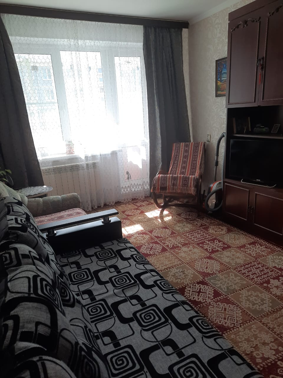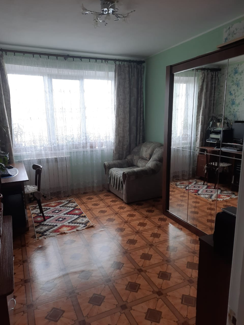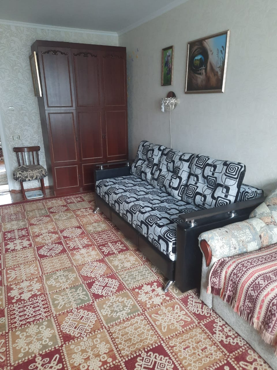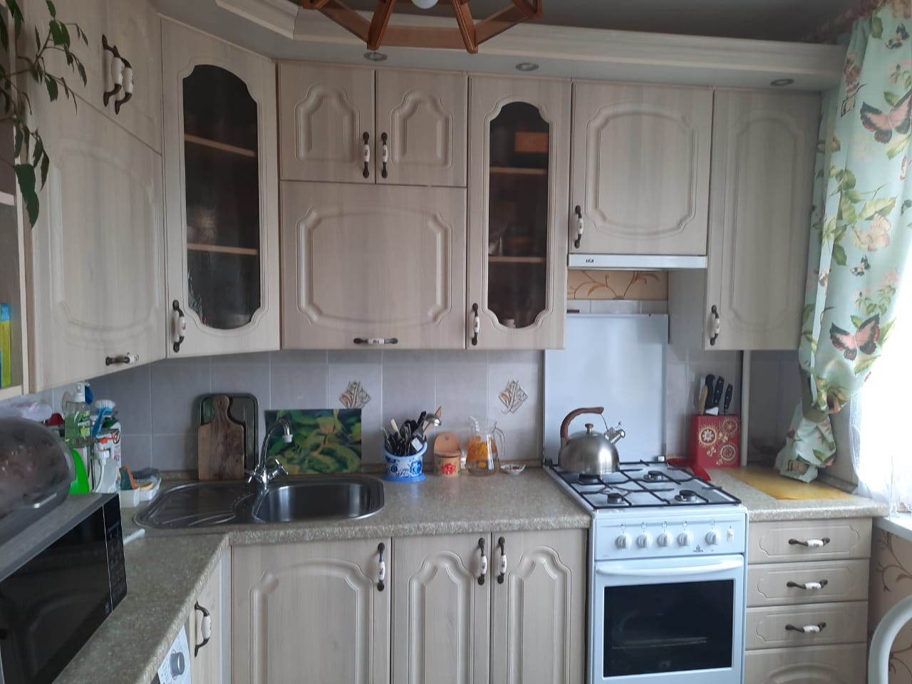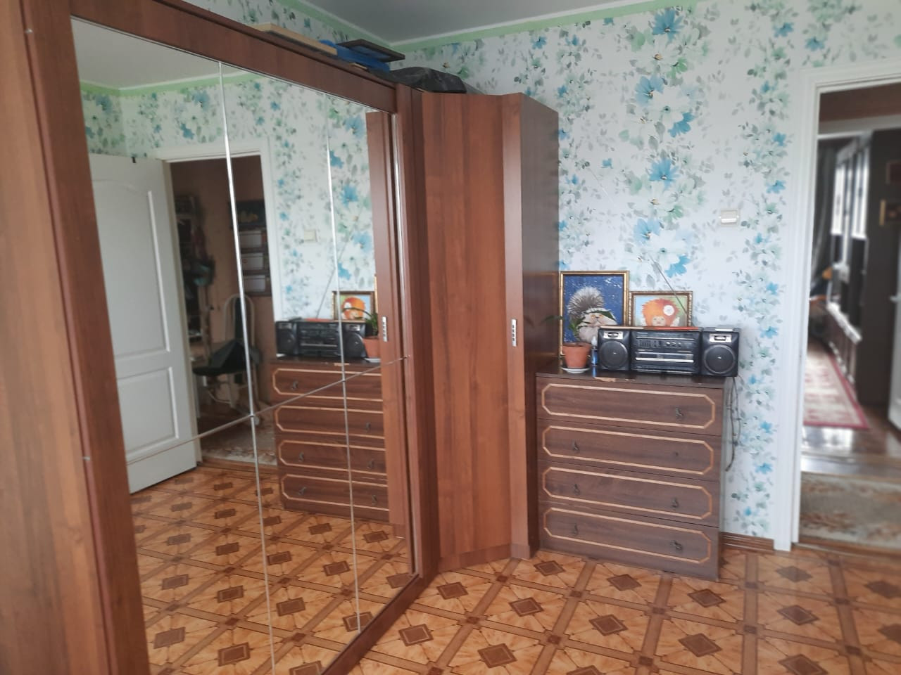 Квартира продается с мебелью: кухонный гарнитур, раскладная двуспальная кровать (на фото в разобранном виде и собранном- за зеркалом) и прочие предметы мебели.