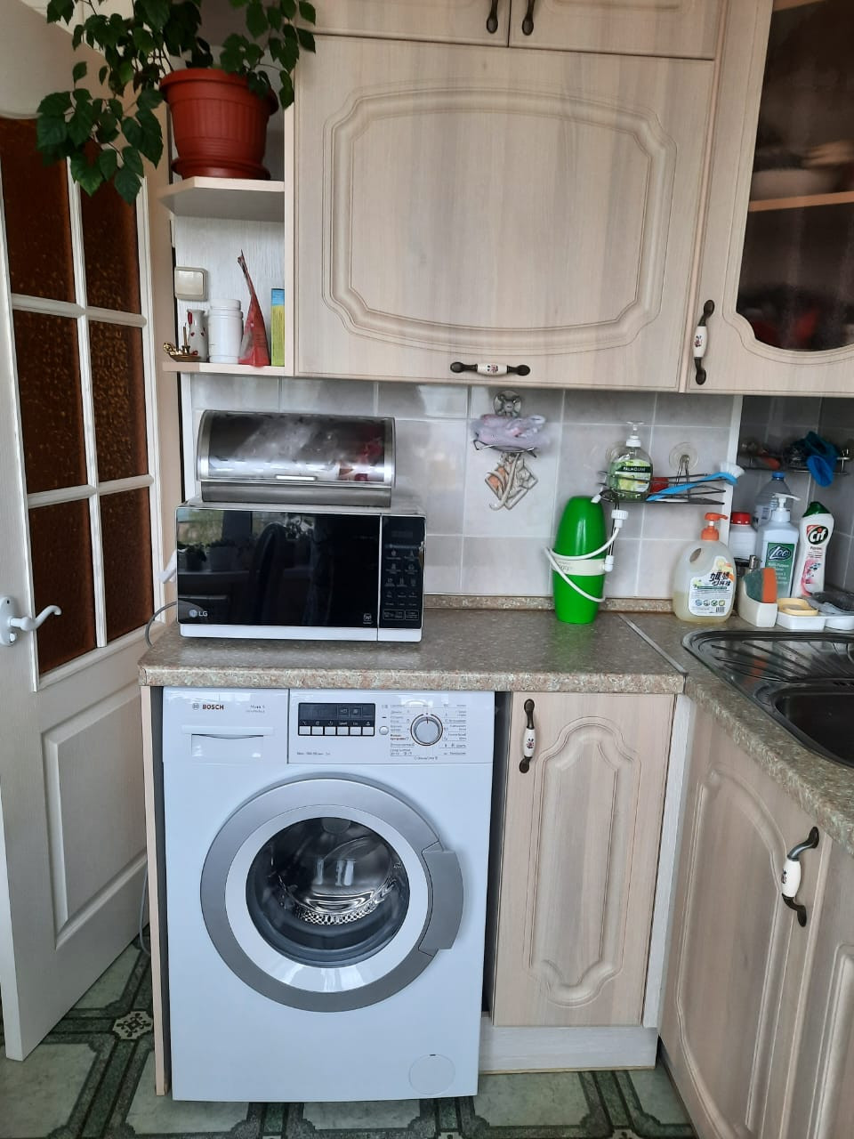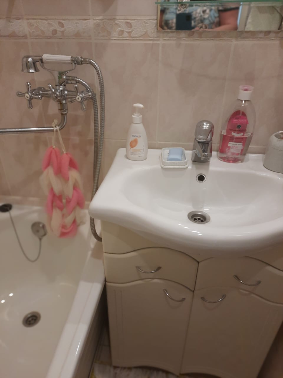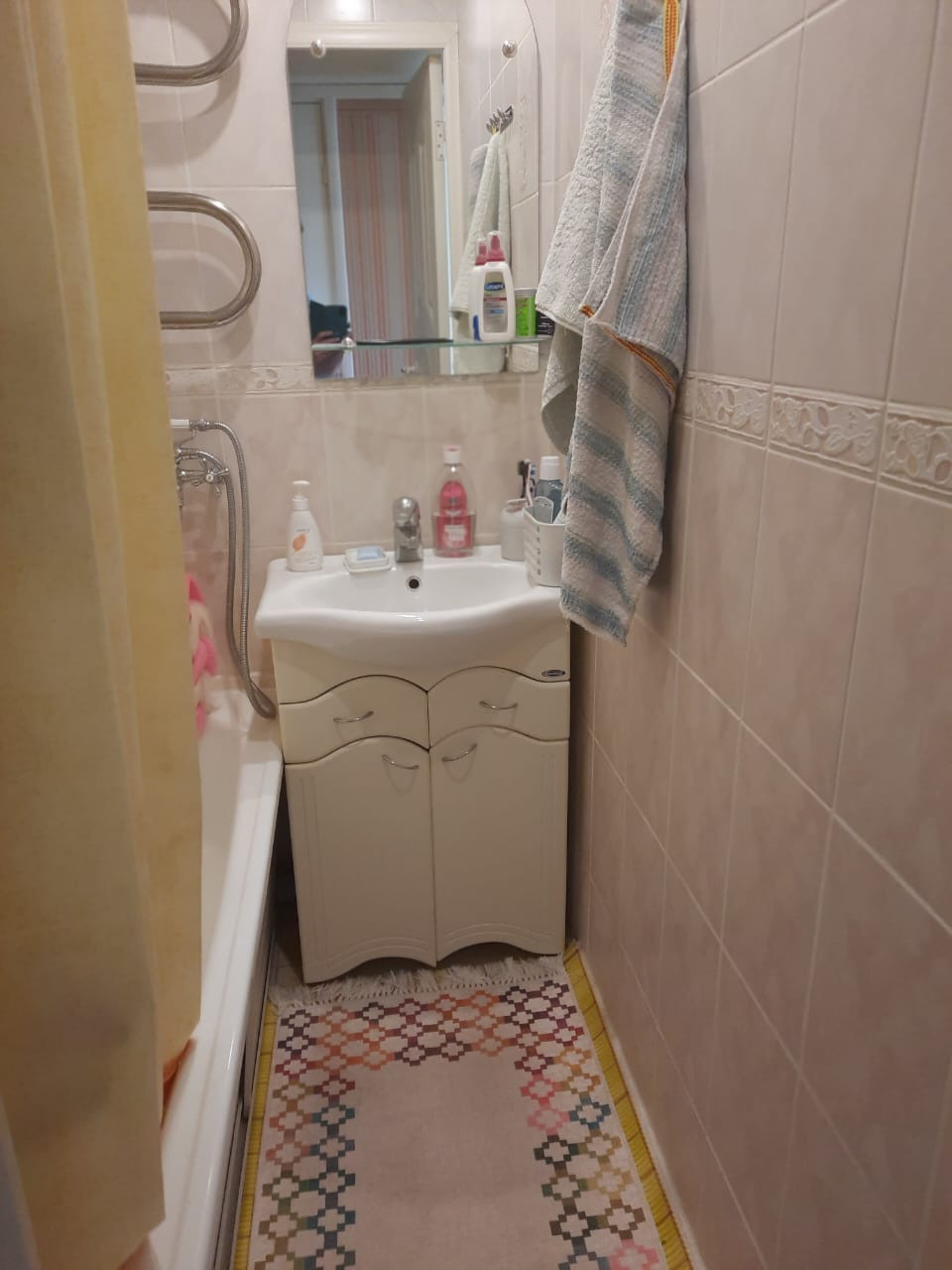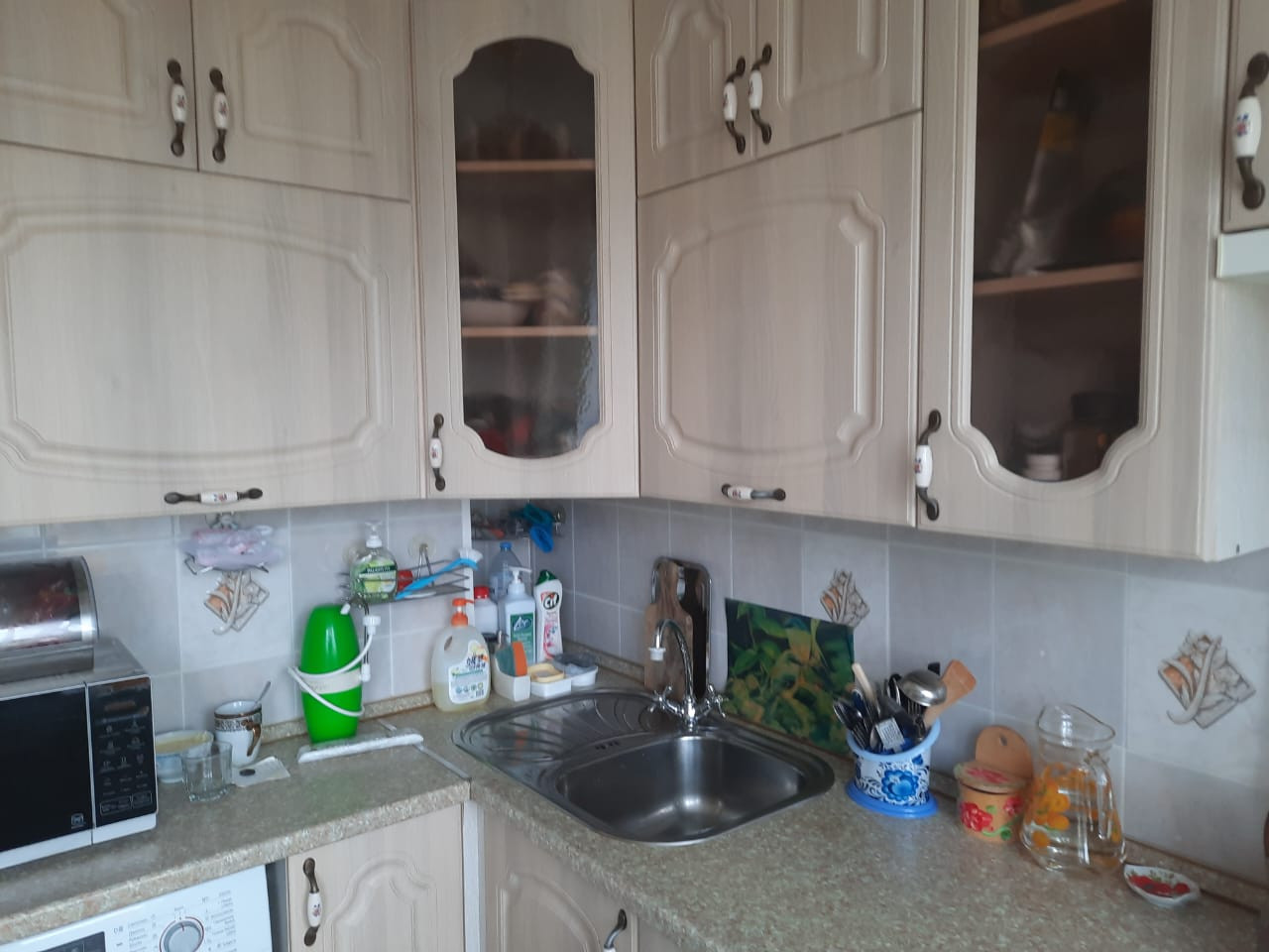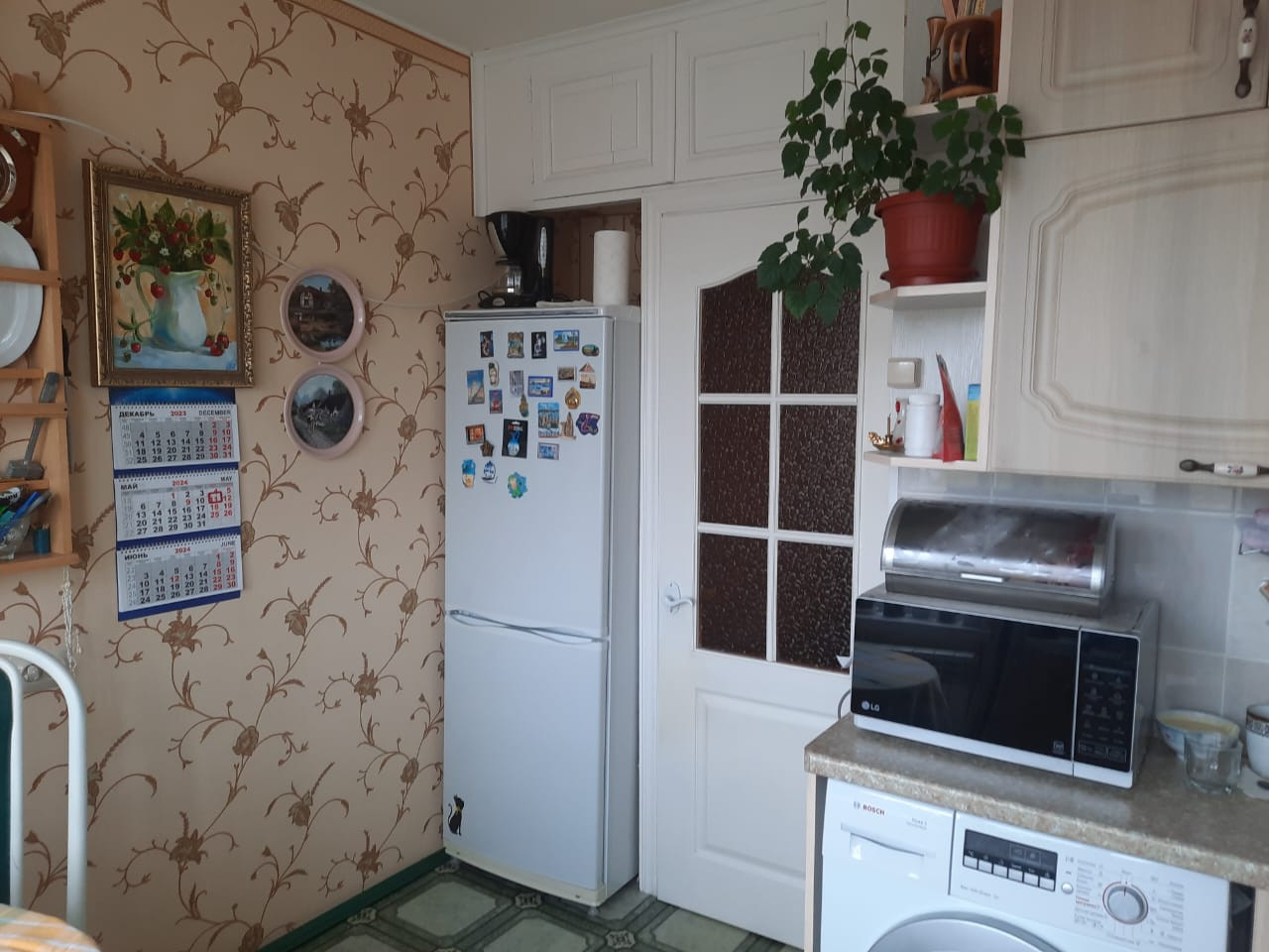 Квартира продается с мебелью: кухонный гарнитур, раскладная двуспальная кровать (на фото в разобранном виде и собранном- за зеркалом) и прочие предметы мебели.