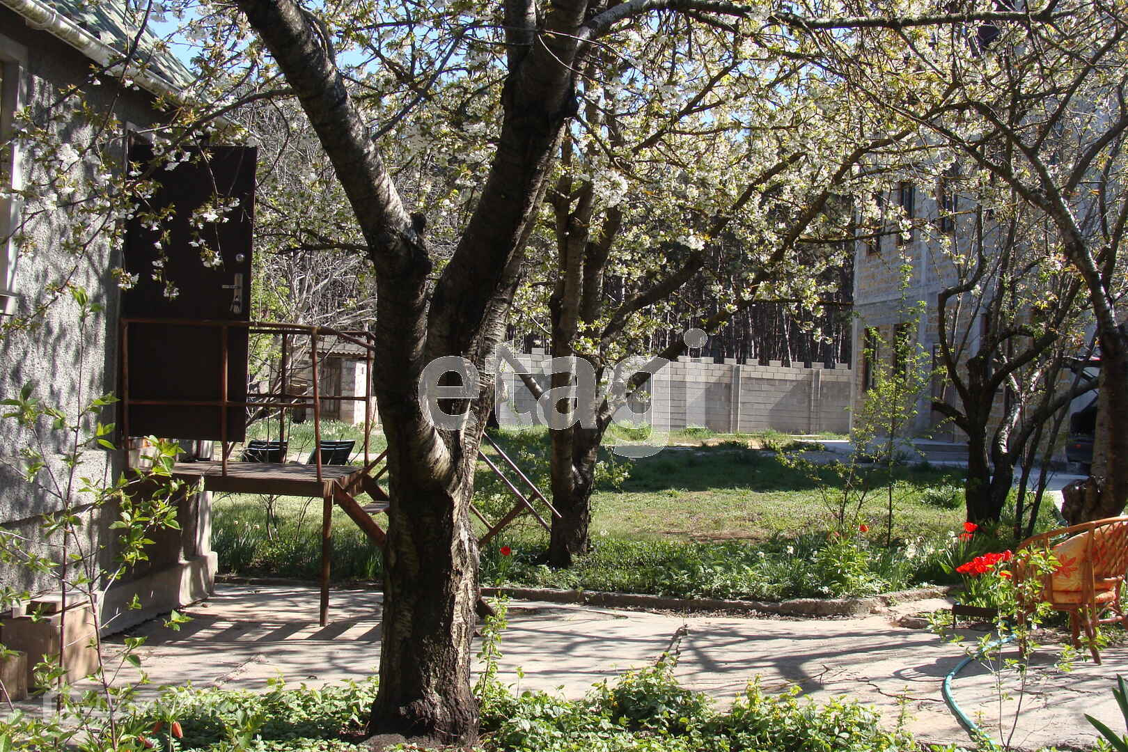 На территории участков расположены 2 ёмкости для воды, залитая бетонная чаша бассейна, хозпостройки. Высажены фруктовые деревья и кустарники : черешня 3-х видов, вишня, персики, абрикос, слива, орех, инжир, шелковица черная и белая, виноград, малина. Распланированы грядки для посадки овощей и ягод, а также ниши вдоль забора для посадки декоративных растений.