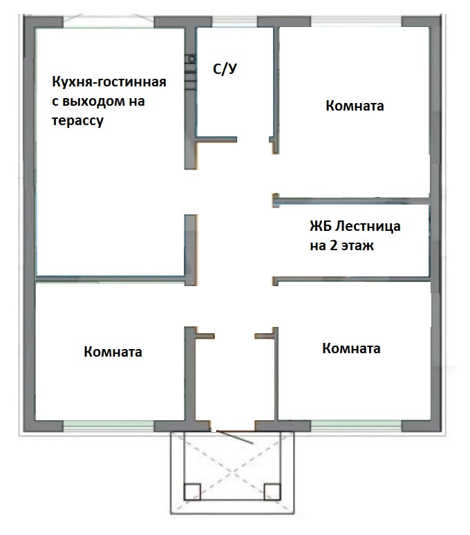 3 изолированные комнаты, с/у + душевая. На втором этаже – свободная планировка.