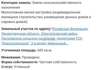 ПРОДАЕТСЯ УЧАСТОК 6СОТОК+1сотка дорога ВИД РАЗРЕШЕННОГО ИСПОЛЬЗОВАНИЯ:МАЛОЭТАЖНАЯ ЖИЛАЯ ЗАСТРОЙКА. (ИНДИВИДУАЛЬНОЕ ЖИЛИЩНОЕ СТРОИТЕЛЬСТВО): НА ПЕРВОЙ УЛИЦЕ. НО НЕ ГРАНИЧЕТ С ДОРОГОЙ В 5КМ ОТ ЦЕНТРА ГОРОДА КРАСНОГО СЕЛА.ЭТО НЕ КОТЕДЖНЫЙ ПОСЕЛОК. АДРЕС:ЛЕНИНГРАДСКАЯ ОБЛАСТЬ ЛОМОНОСОВСКИЙ РАЙОН, ЛАГОЛОВСКОЕ С/ПОСЕЛЕНИЕ, ТСН КРАСНОСЕЛЬСКОЕ, МАЛЫЙ ПРОСПЕКТ... |