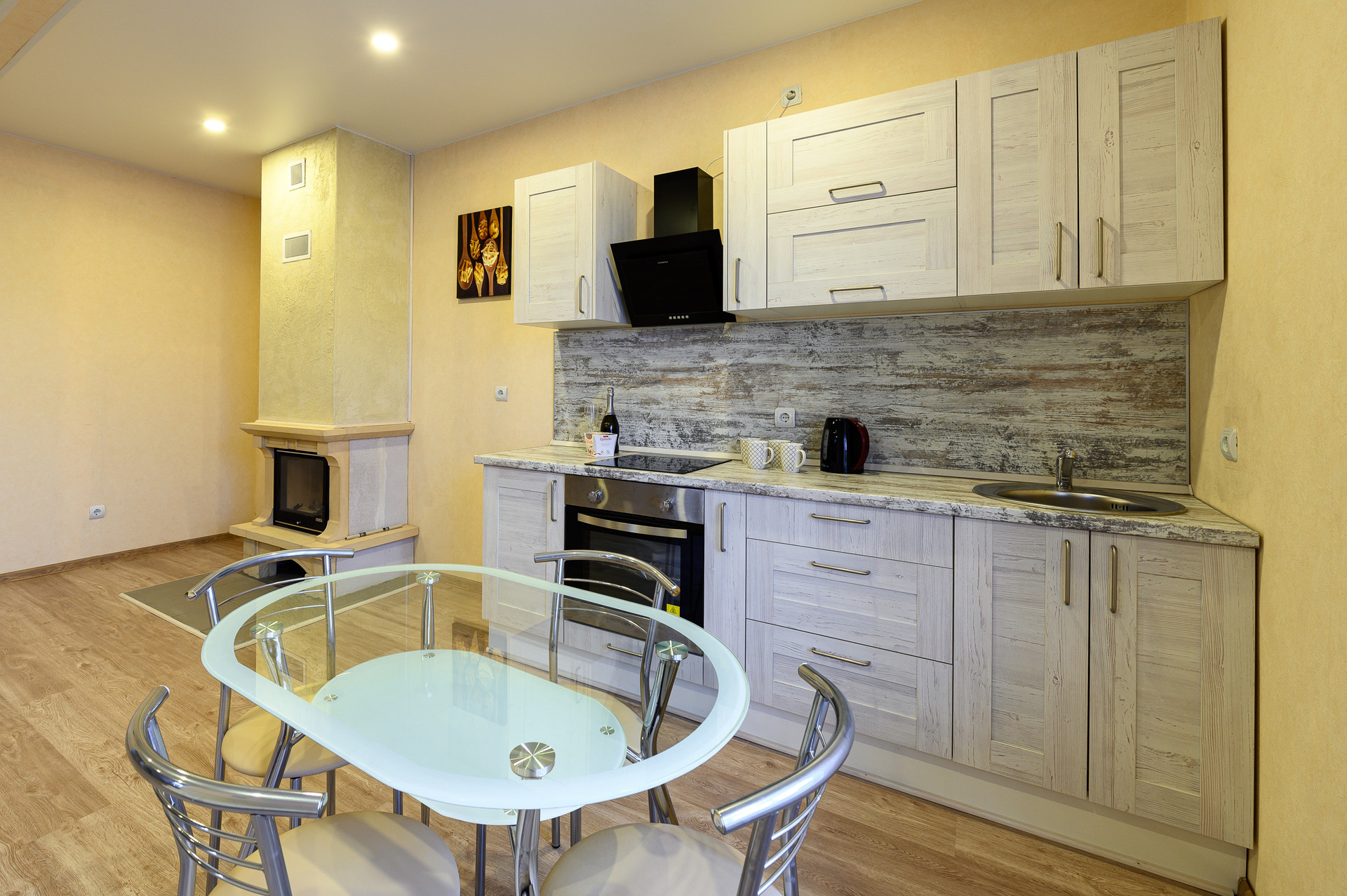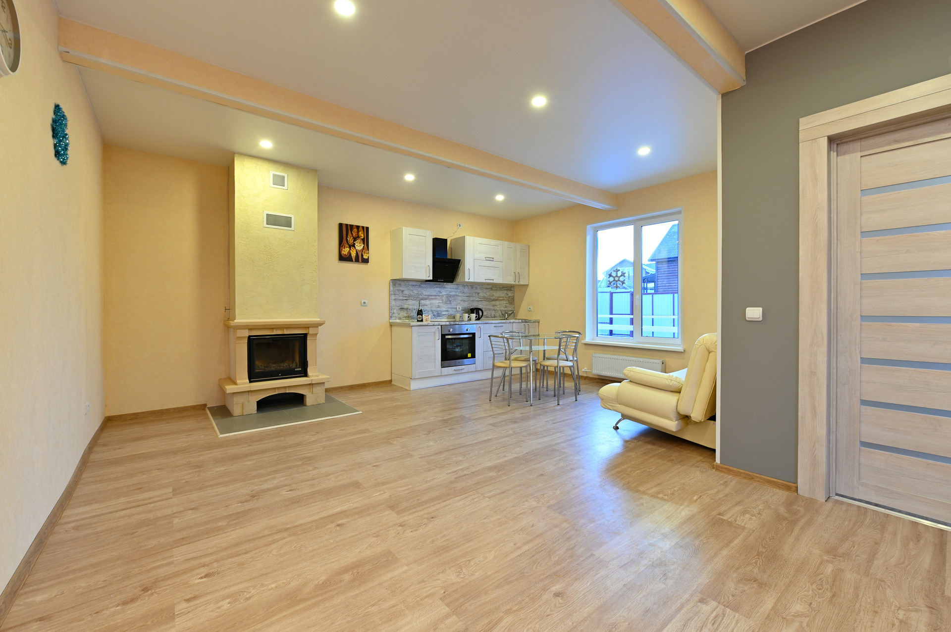 • полностью оборудованная кухня с встроенной варочной панелью и встроенным духовым шкафом