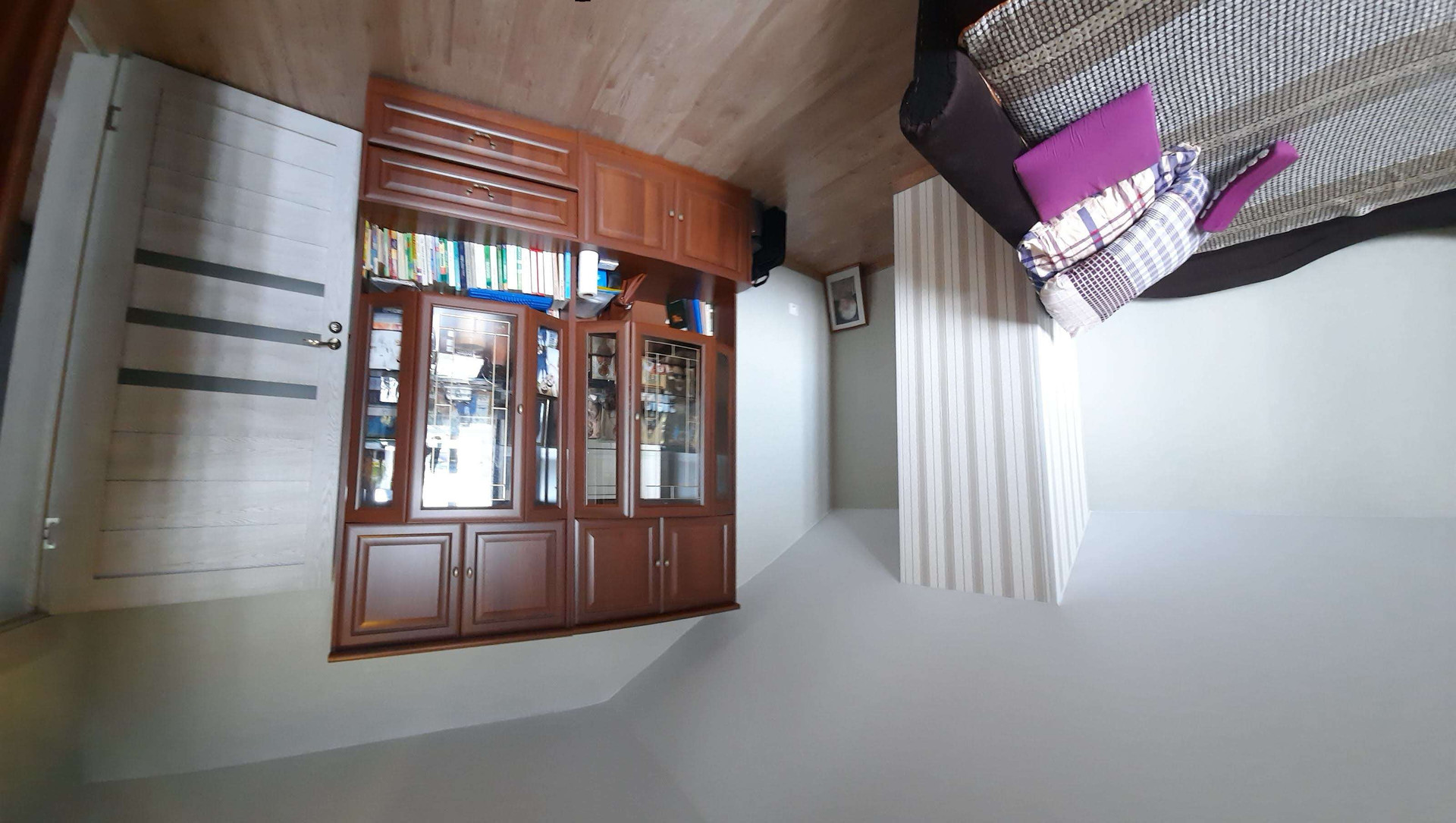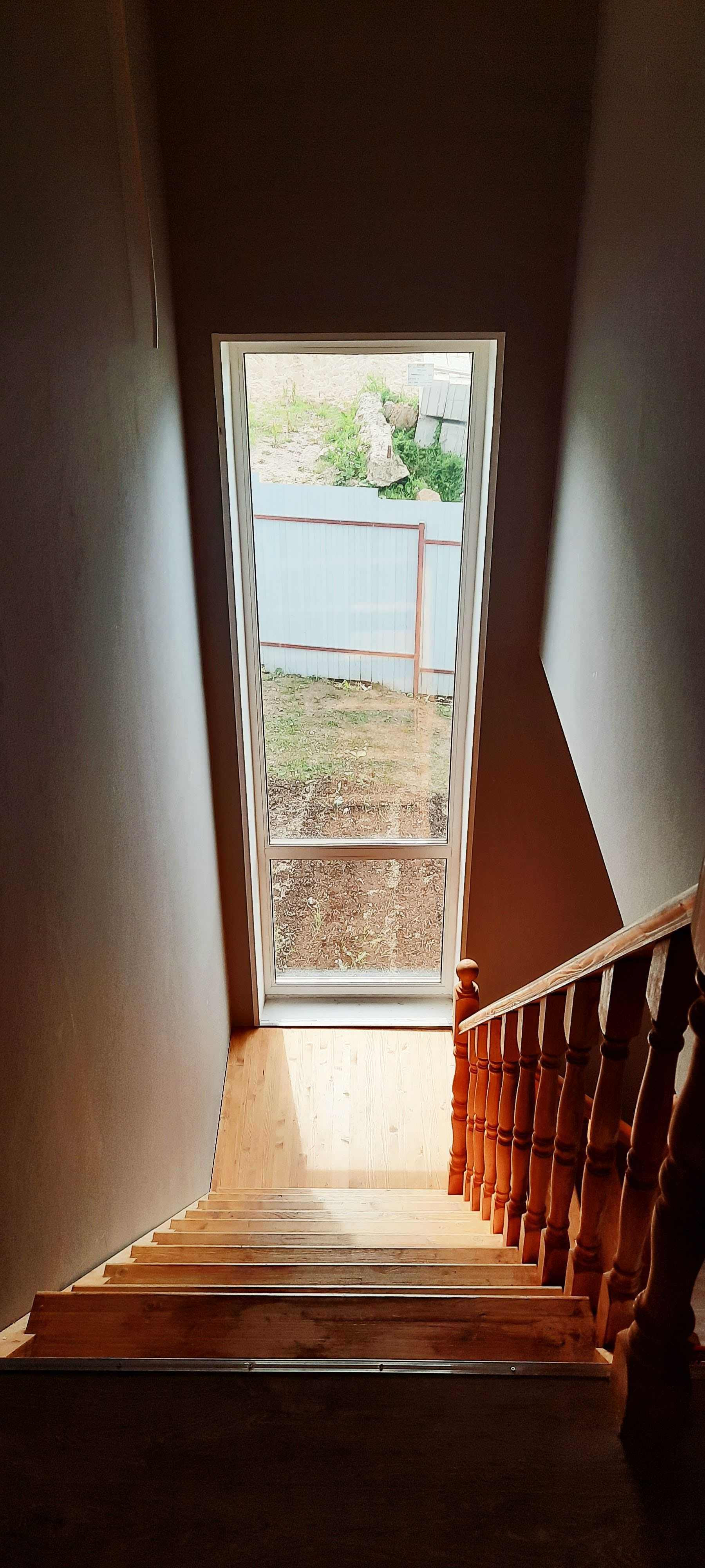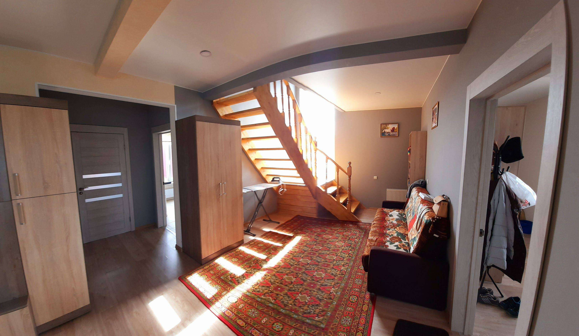 Ламинат, везде натяжные потолки, лестница - массив дерево.