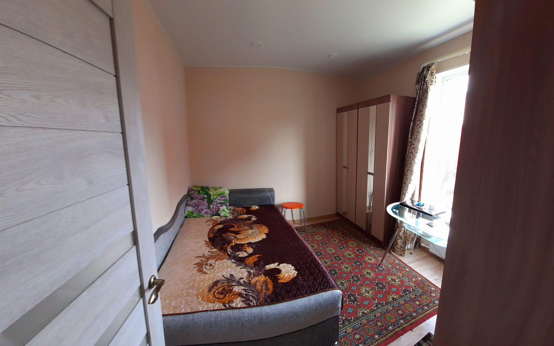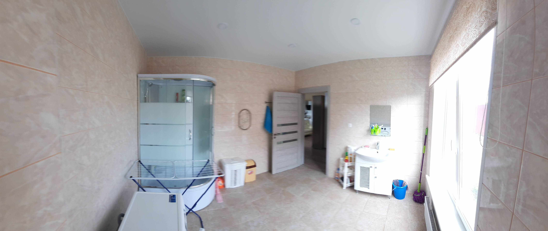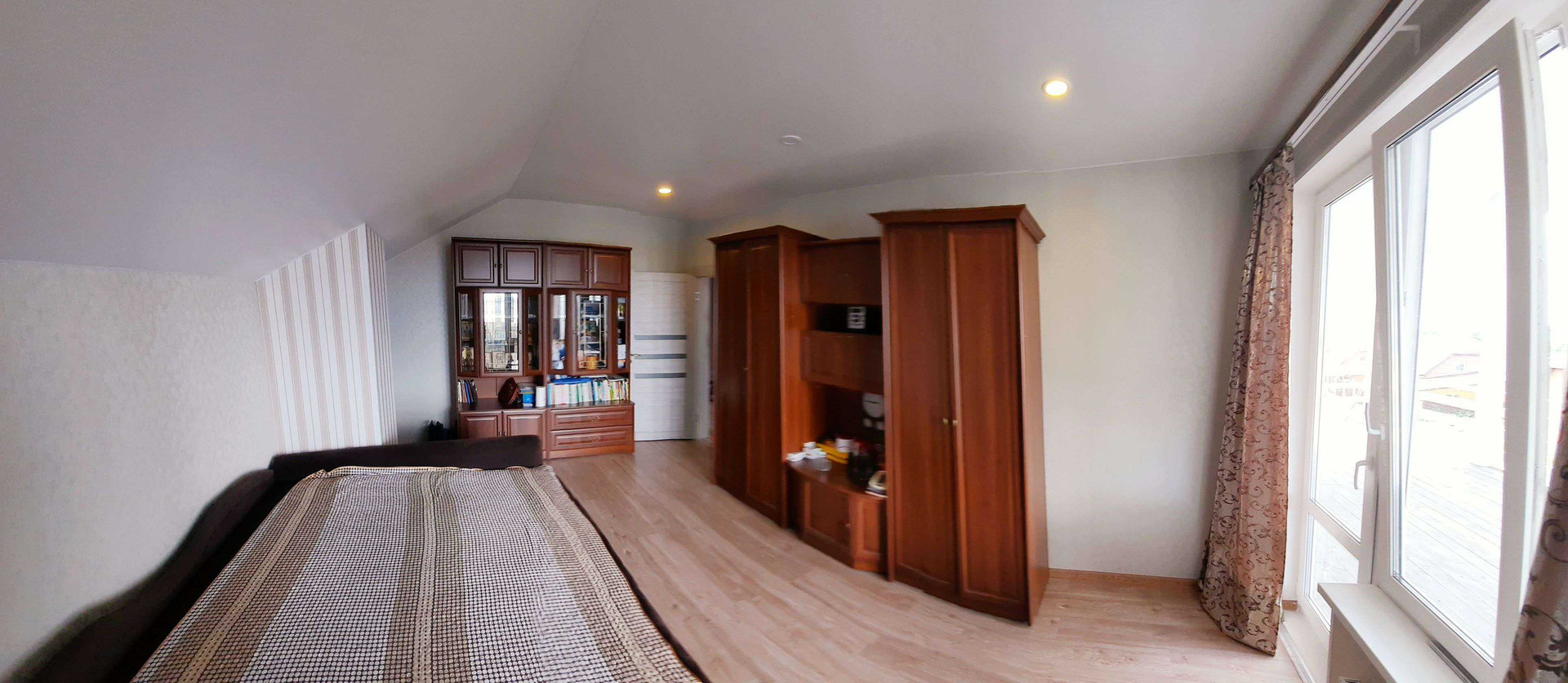Ламинат, везде натяжные потолки, лестница - массив дерево.