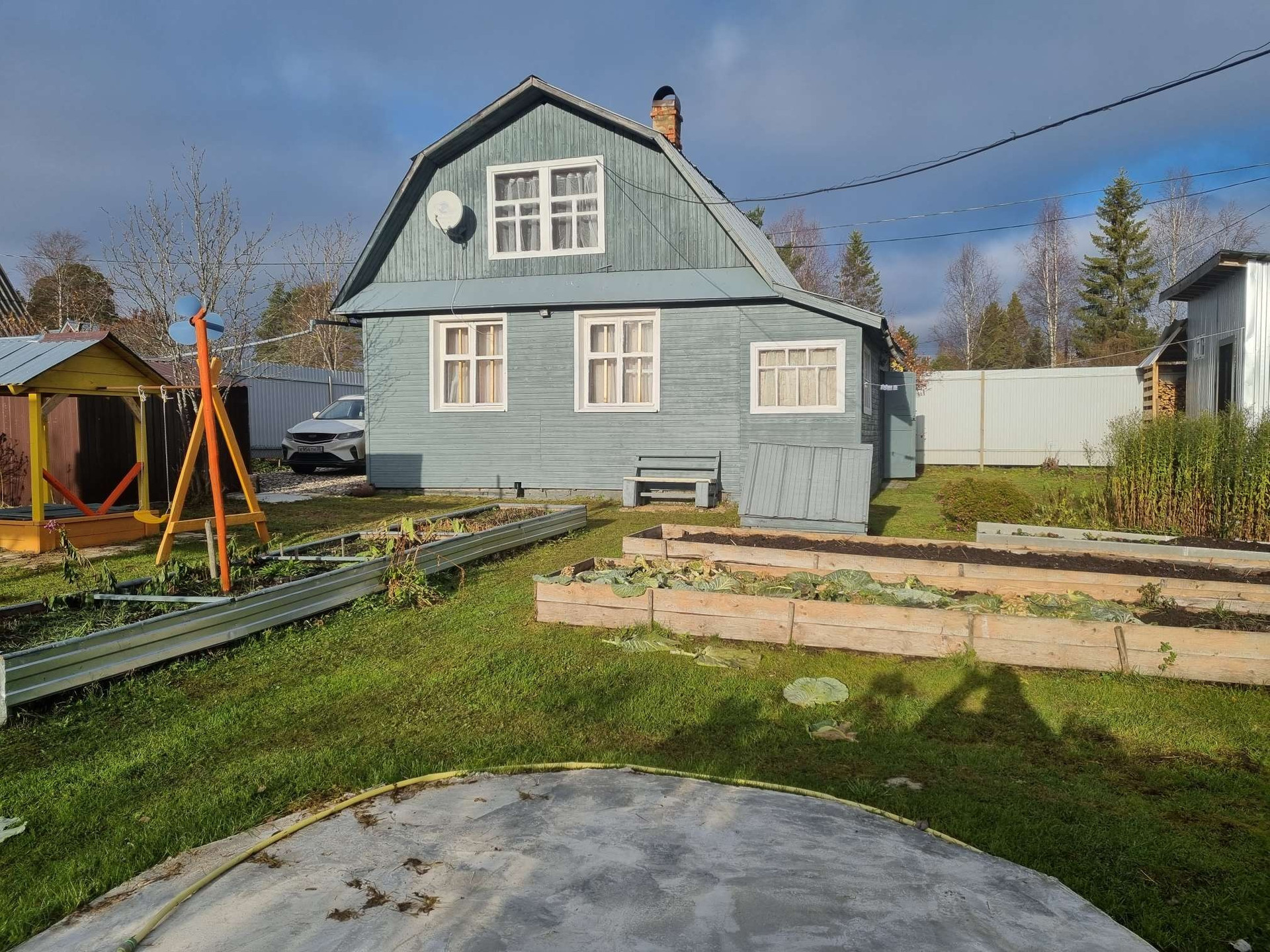 Садовый участок с домом и баней (из рубленного бревна). Также на участке есть хозяйственный блок, дровенник, кессон, две теплицы (дорожки забетонированны), летняя мойка, летняя душевая, летняя беседка (до 15 чел.), песочница с качелькой, парковка на две машины (отсыпана гравием на сетку и геотекстиль), по периметру дома освещение (на движение), место под каркасный бассейн (бассейн прилагается), колодец на 5 колец. Лицевая часть участка огорожена забором из профнастила. В доме каменная печка,   электричество, спутниковое тв ( можно подключить интернет).