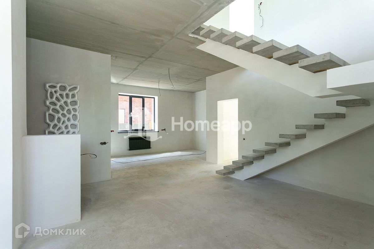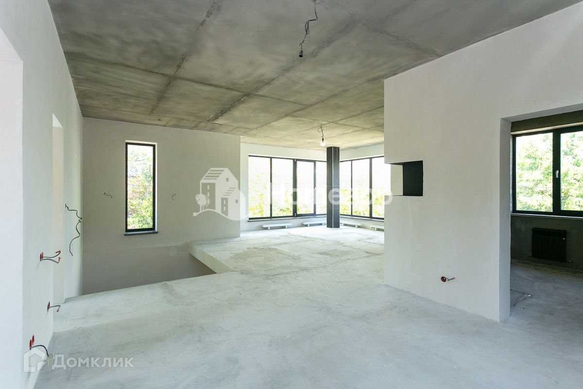 Четыре изолированные спальни (планировка функциональная), кухня, зона столовой, большая гостиная с панорамным остеклением, два санузла, котельная. Высокие потолки.