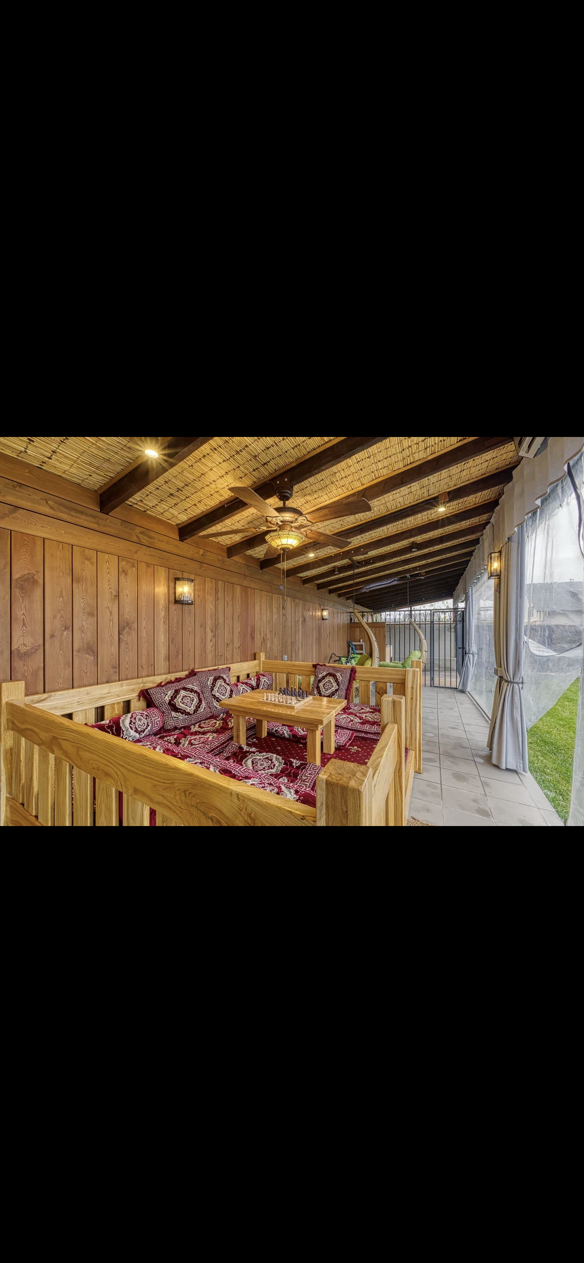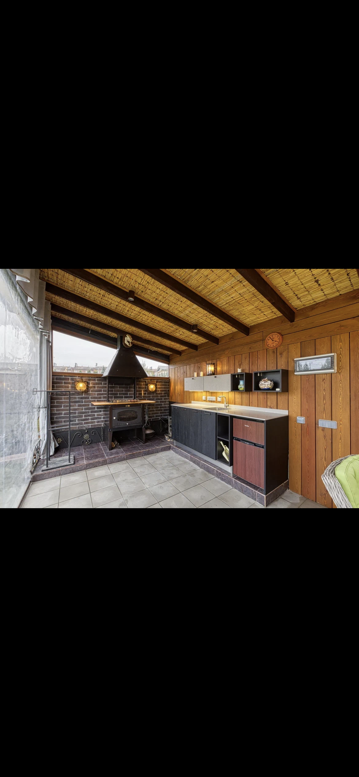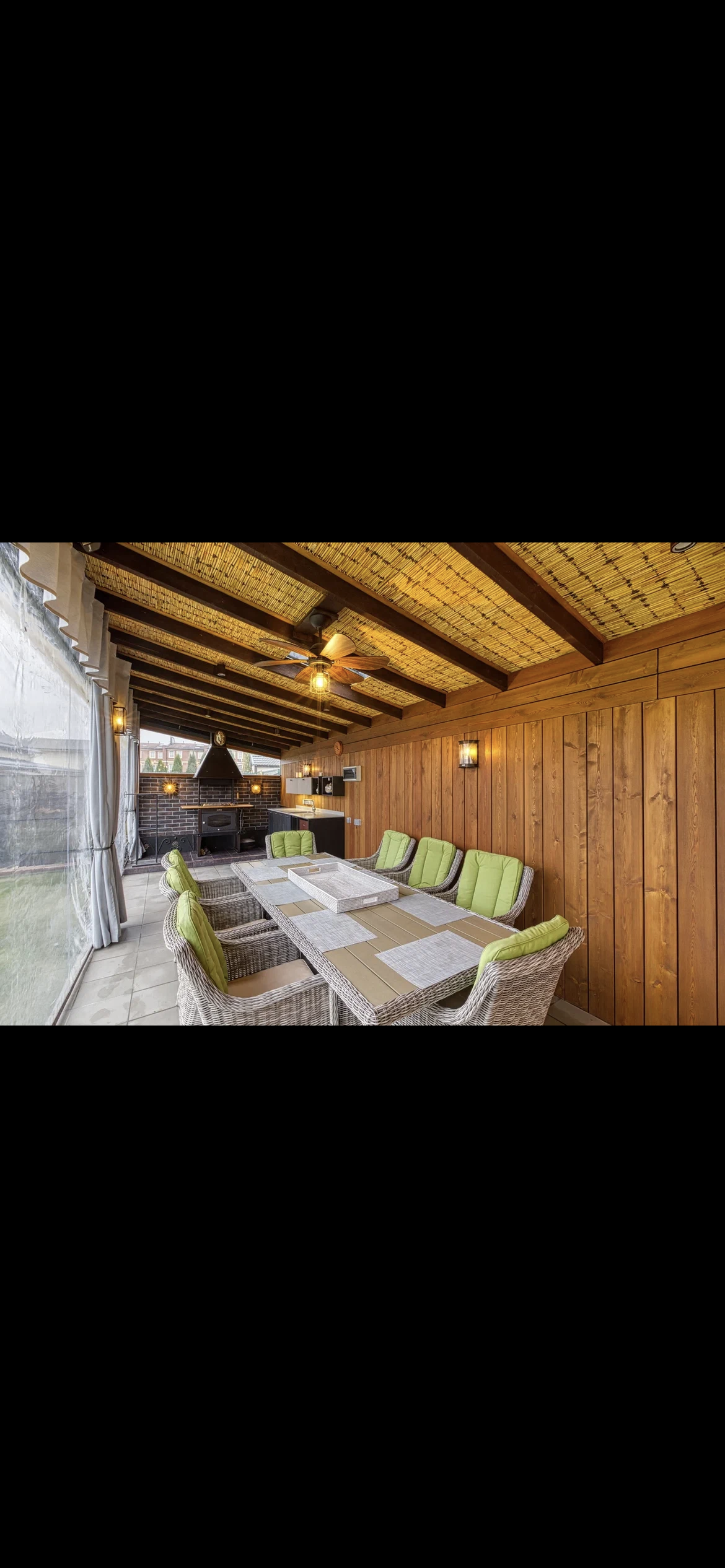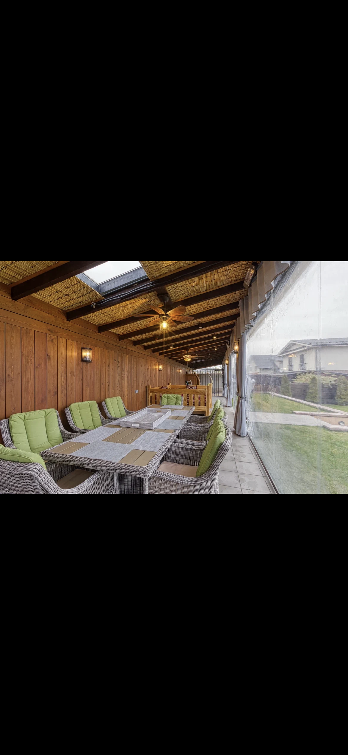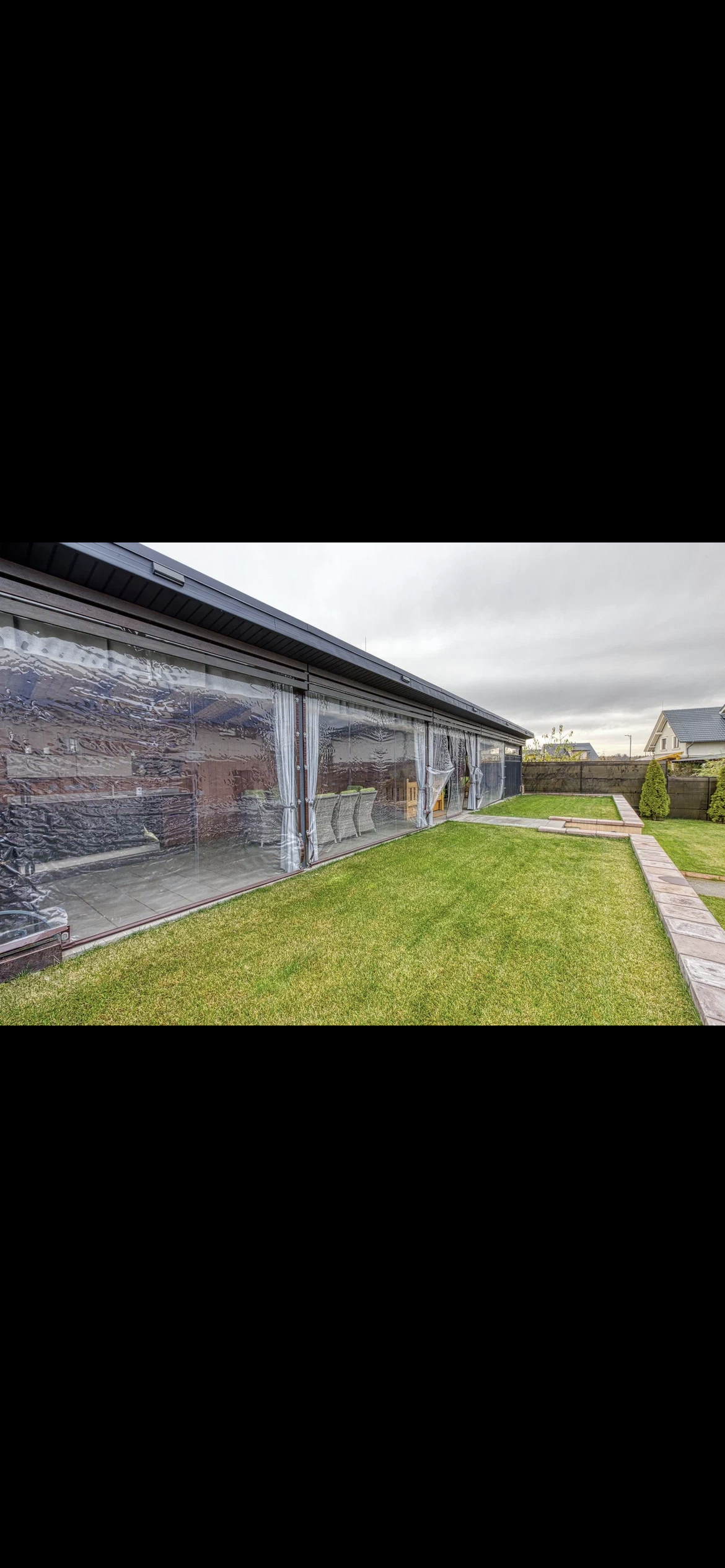 На участке под землёй расположены 3 скважины глубиной 100 м, в каждой из которых находятся теплообменники. Патио зона с столовой зоной, кухней, зоной отдыха (топчан их дуба и качели), вольером для собак и выходом на лужайку дают замечательную возможность для отдыха и приятного времяпрепровождения.