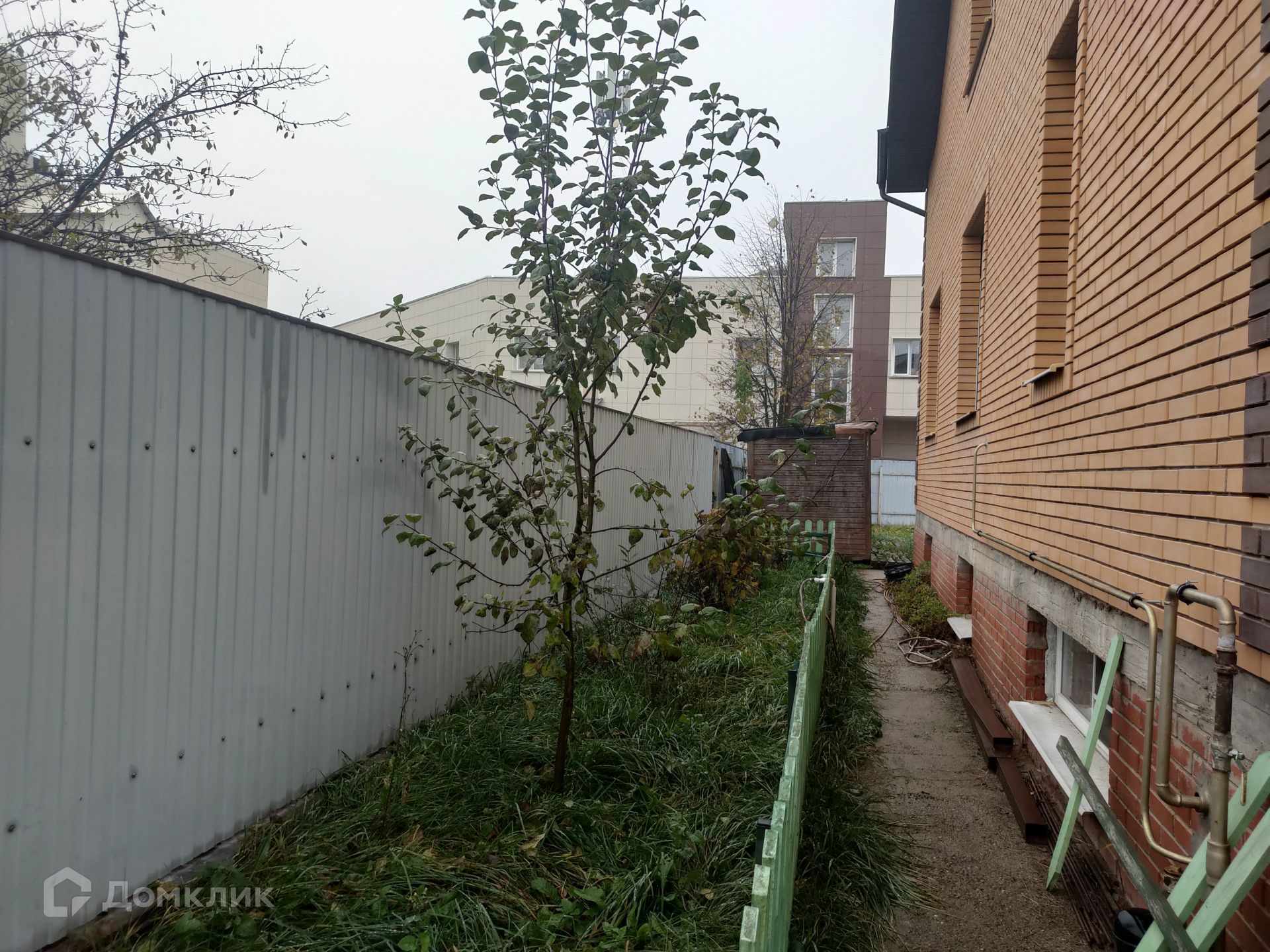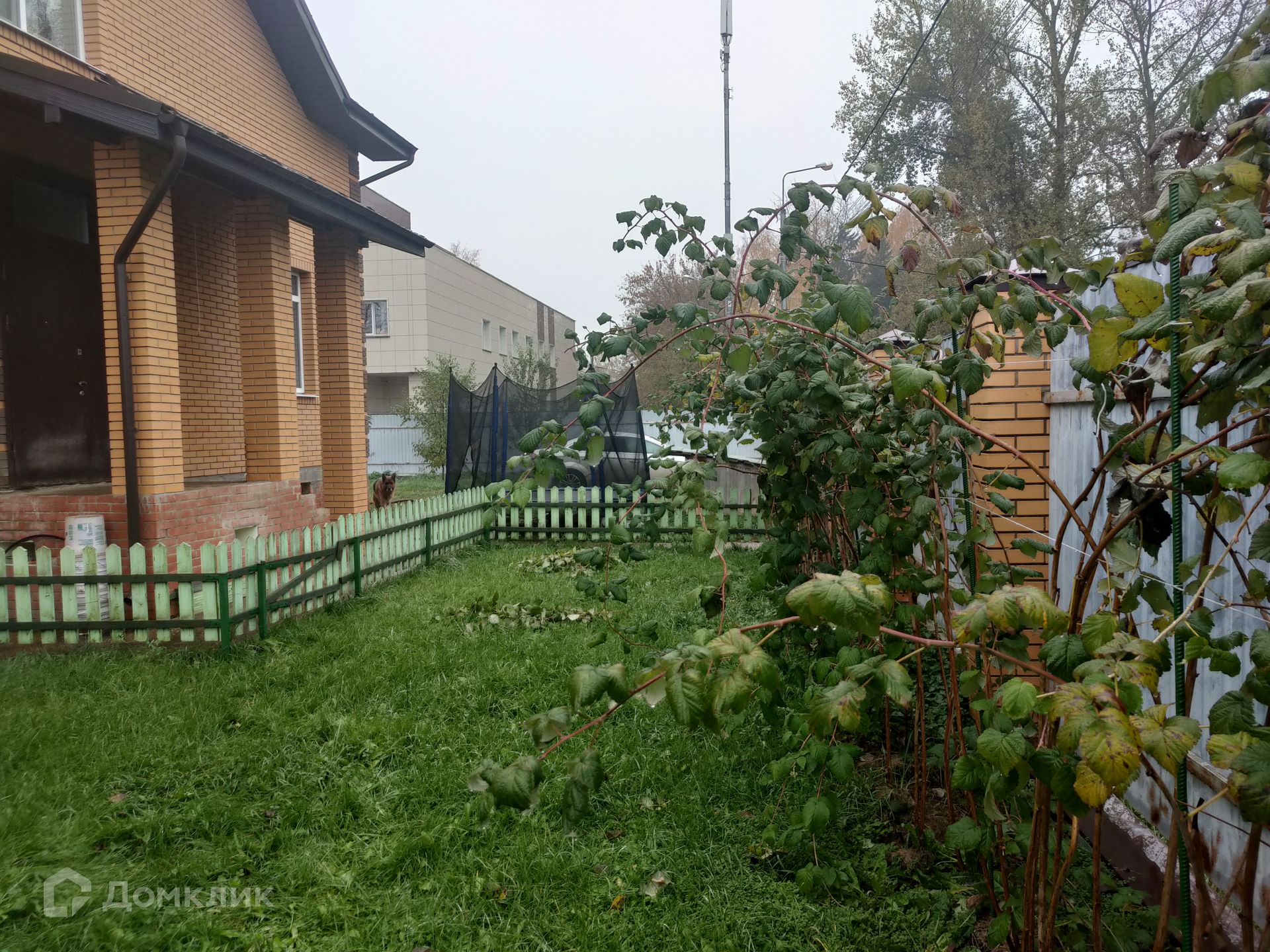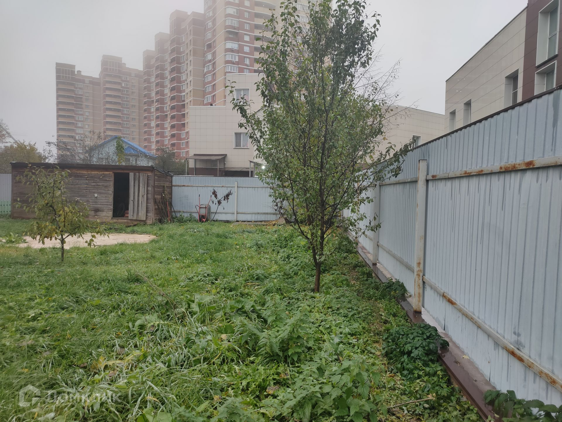 Участок огорожен металлическим штакетником. Сделаны откатные автоматические ворота и предусмотрено парковочное место. На территории есть хозяйственный блок. Растут плодоносящие деревья и кустарники.
