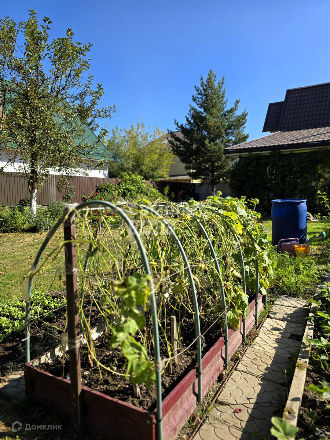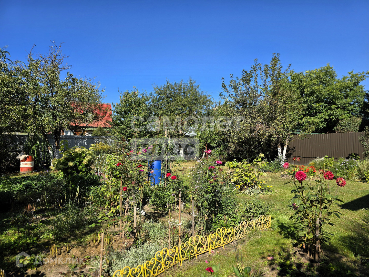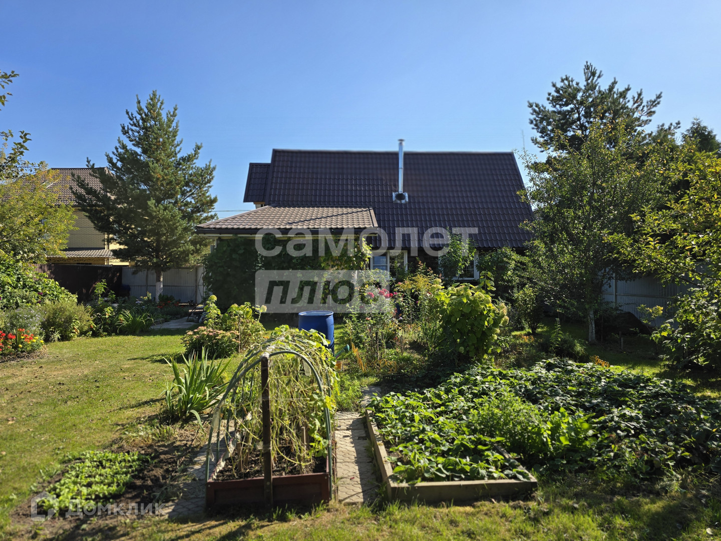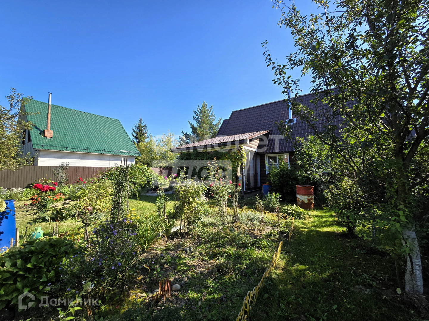 Участок ухожен с большой любовью, на нем расположены: площадка под стоянку авто, теплицы, плодоносящие деревья, ягодные кусты, множество цветочных клумб и тд.