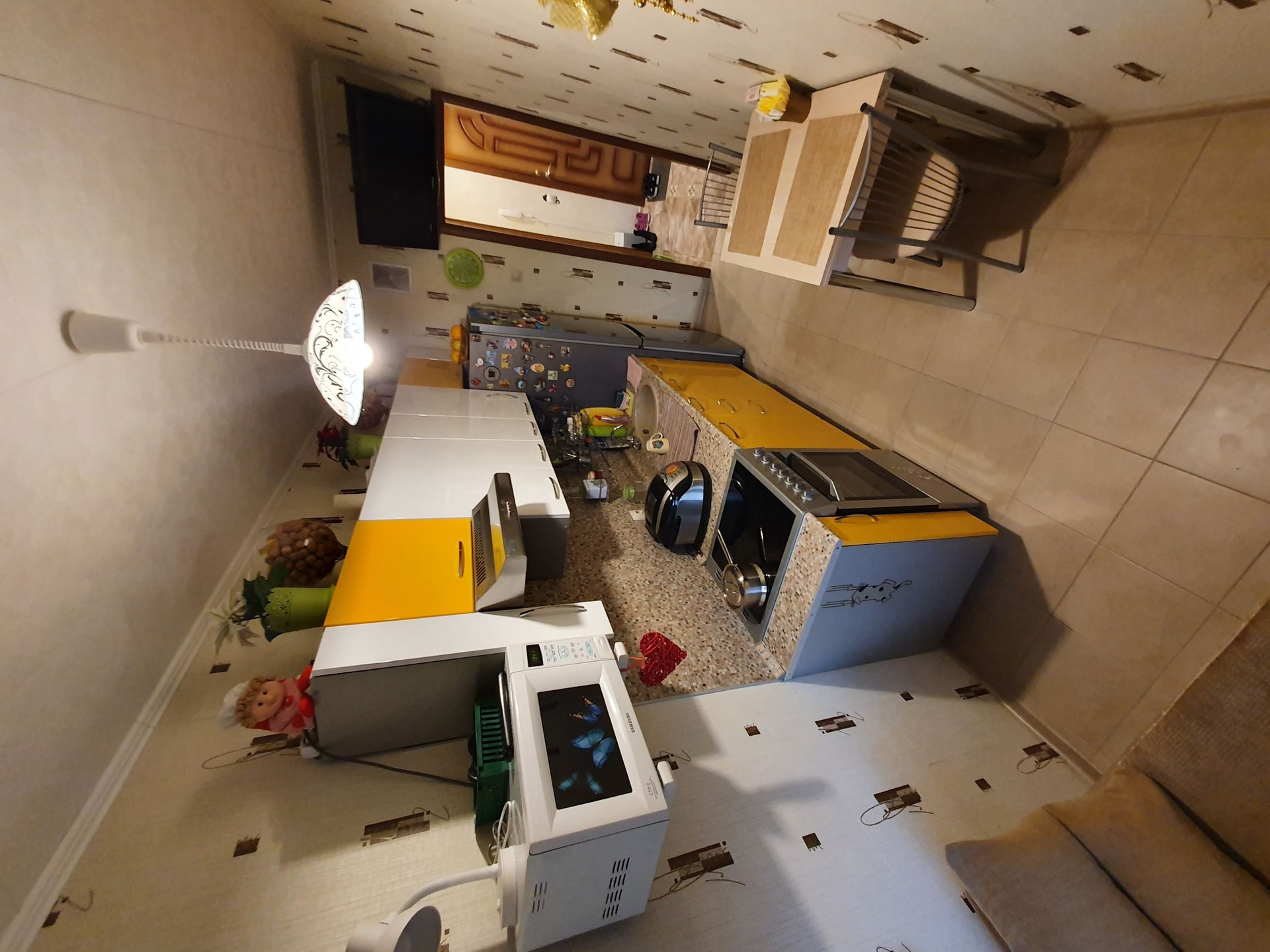 Вместительная кухня, в которой с лёгкостью размещается диван.