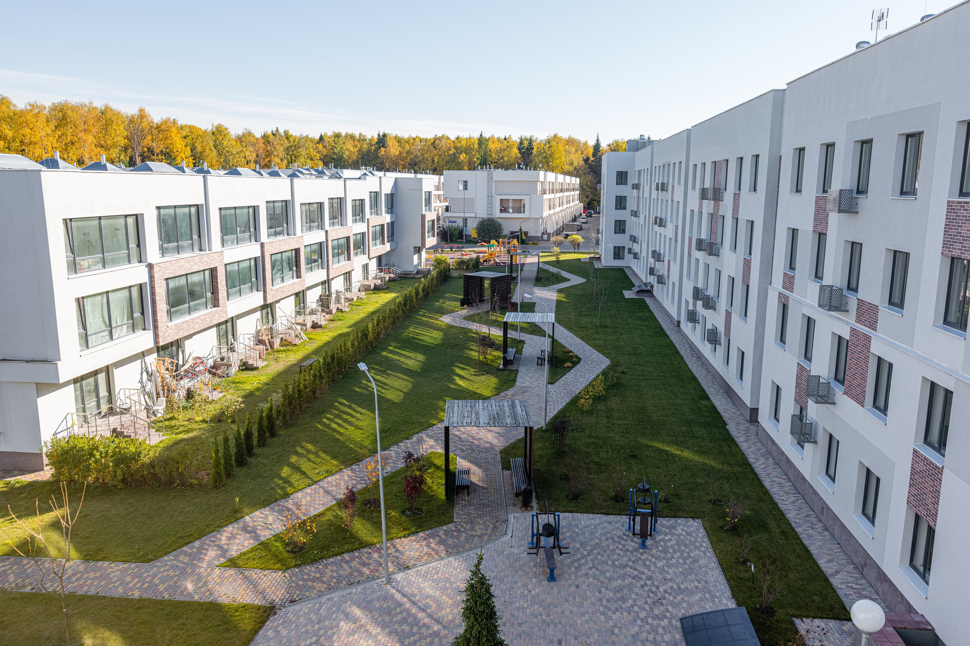 Всё необходимое для комфортного проживания - охраняемая закрытая территория, детский школьный автобус и своя бесплатная маршрутка, детская и спортивная площадки, благоустроенная территория, зона парковки, в минимаркете всегда свежие продукты, жилой комплекс окружен чистым лесом.