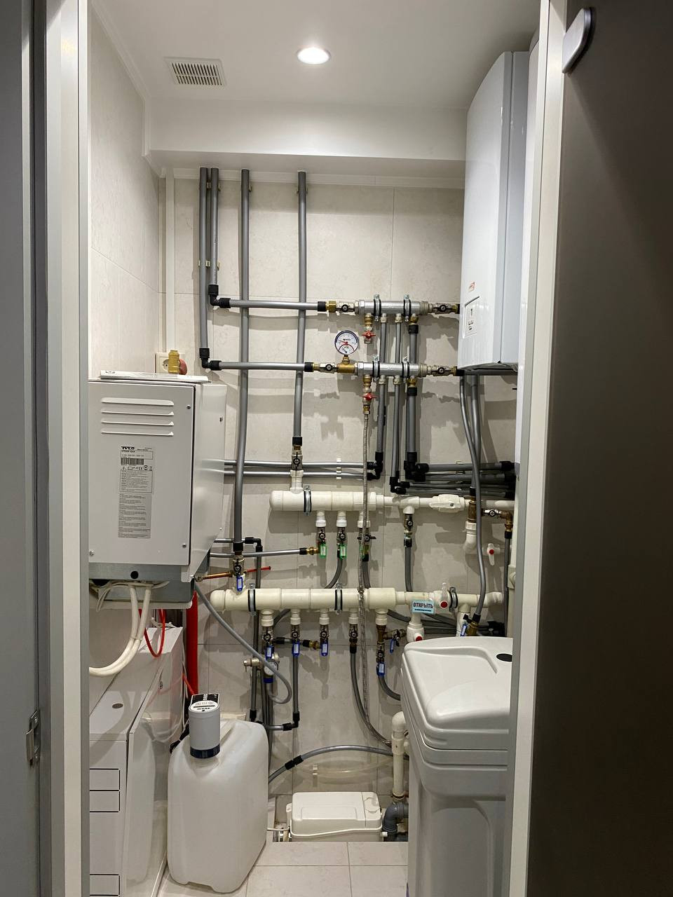 Коммуникации: центральные городские (в том числе отопление), в доме установлена система водоочистки, накопительный бойлер на время отключения горячей воды, дополнительно – электрокотел (отопление и подогрев воды), на придомовой территории выполнена дренажная система.
