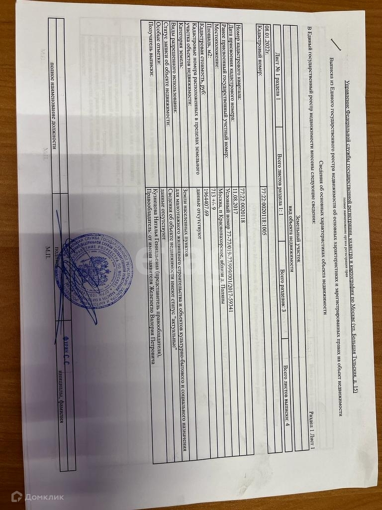 1 взрослый собственник, полная стоимость в ДКП!