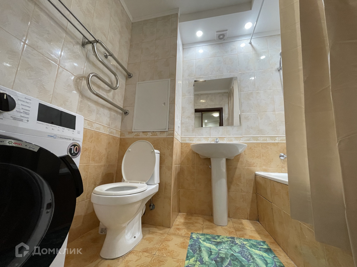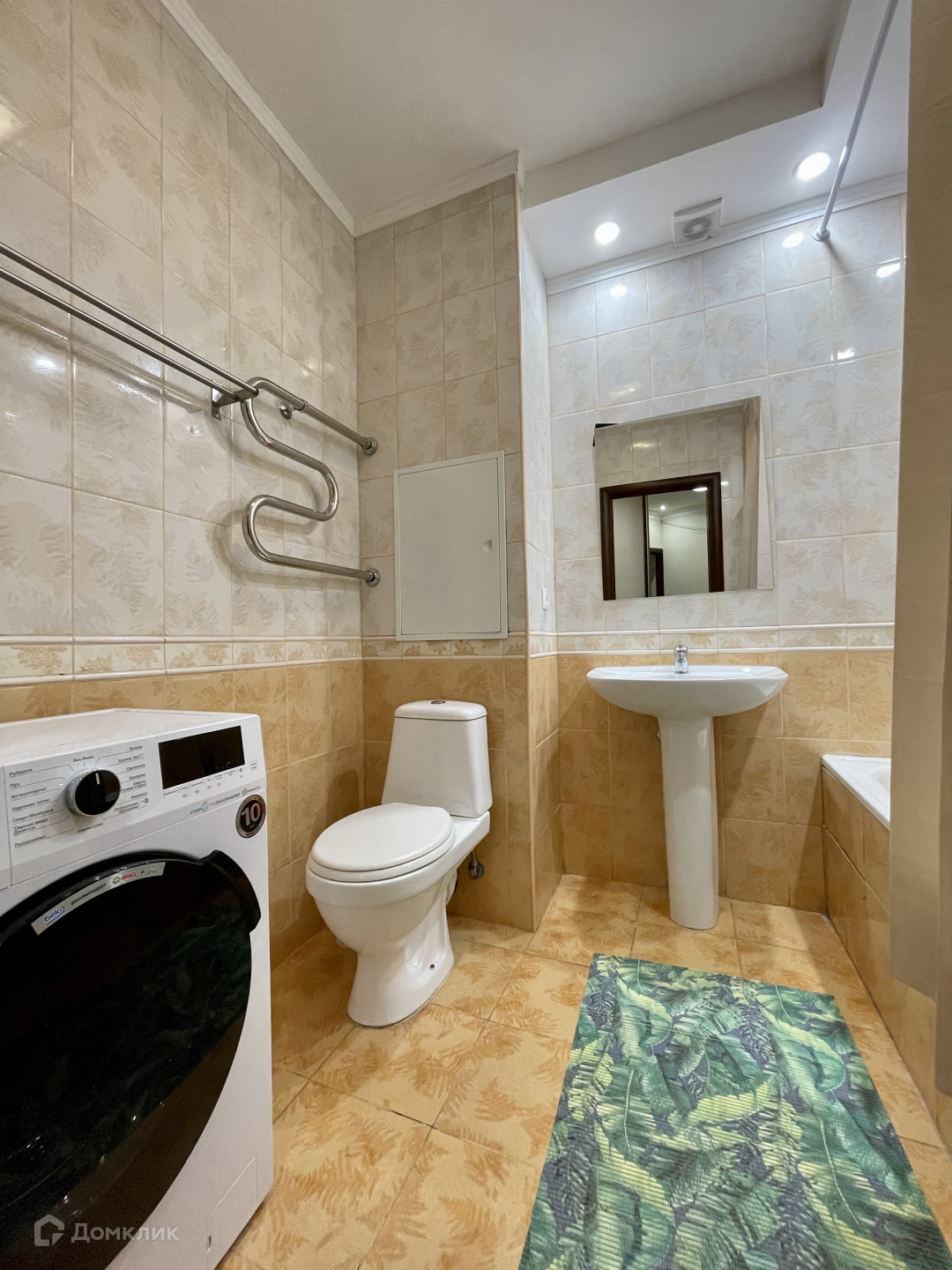 В коридоре большой встроенный шкаф, в спальне: кровать, два вместительных платяных шкафа. Кровать можем заменить на двуспальную. В кухне: диван, холодильник, кухонный гарнитур, плита, вытяжка. В санузле: полноразмерная ванна, новая современная стиральная машина.