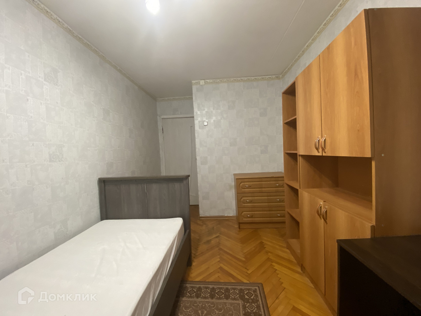 Зал: диван двухспальный, мебельная «стенка», стол небольшой, сто-книжка. Спальня: кровать односпальная, шкаф, стеллаж, комод.