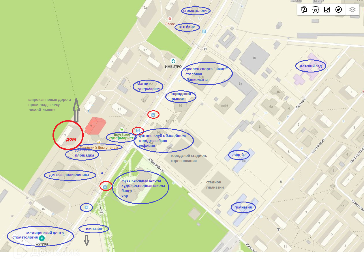 От 3-х до 5-ти минут пешком – супермаркеты Магнит, ВкусВилл, Ашан, городской рынок, Банк ВТБ, Сбер;