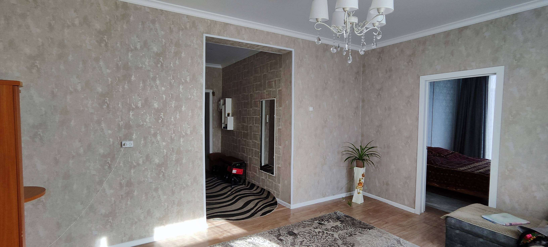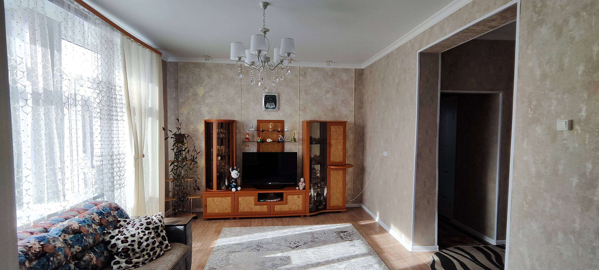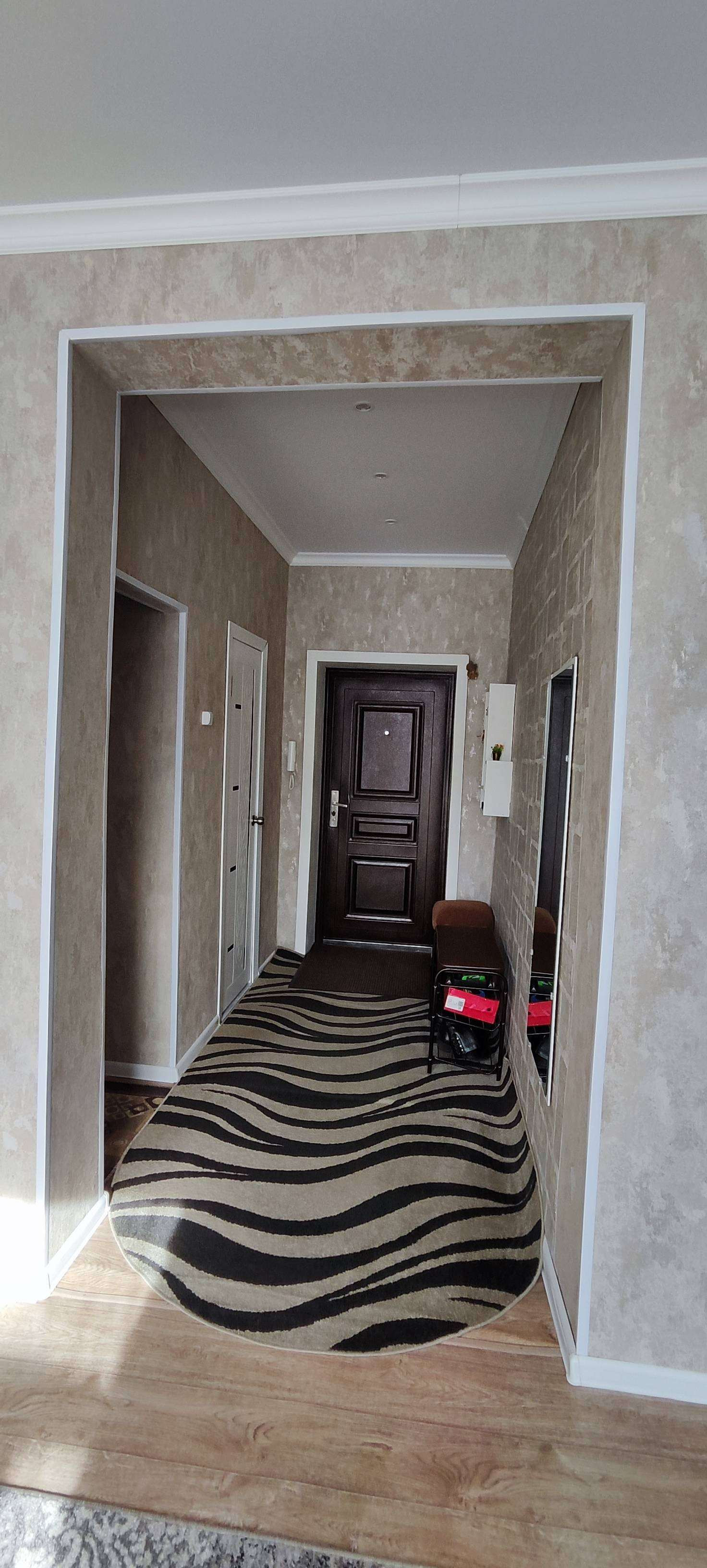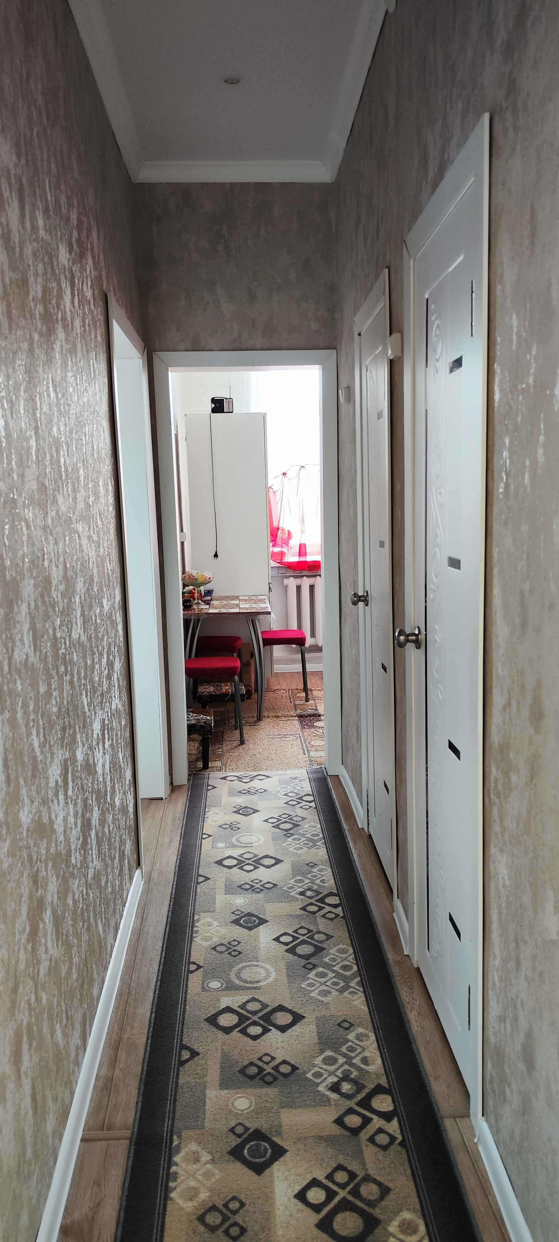 В квартире свежий косметический ремонт, натяжные потолки (высота 3 метра), новые межкомнатные двери, на полу линолеум, надёжная входная металлическая дверь.