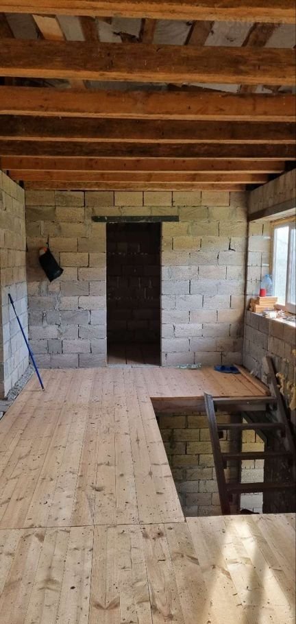 Фундамент: 2х метровая бетонная подушка (можно построить многоэтажку на таком). Пол 1го этажа идеально ровный, обработан бетонным лаком (нет бетонной пыли).