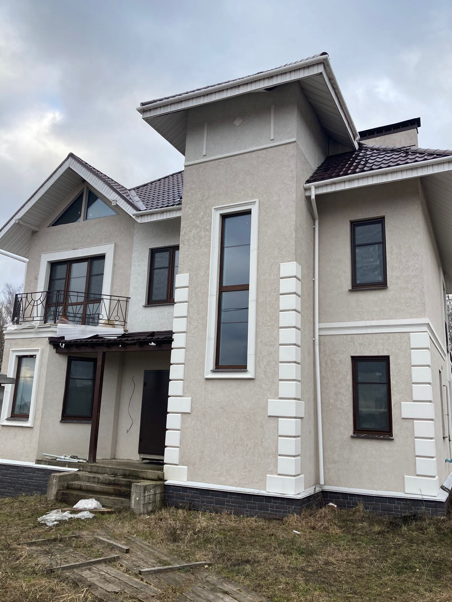 Ремонт в доме сделан практически полностью. Есть закупленные материалы, которые соответствуют проекту. На втором этаже в одной из комнат выход на балкон, панорамные окна в пол. Полы во всем доме выложены плиткой.