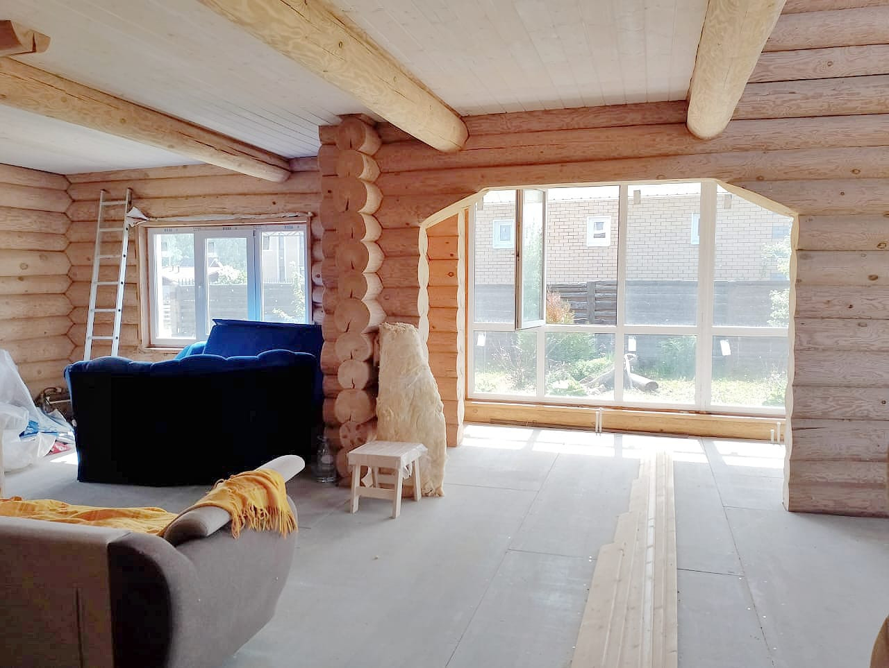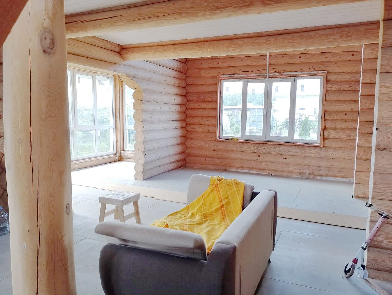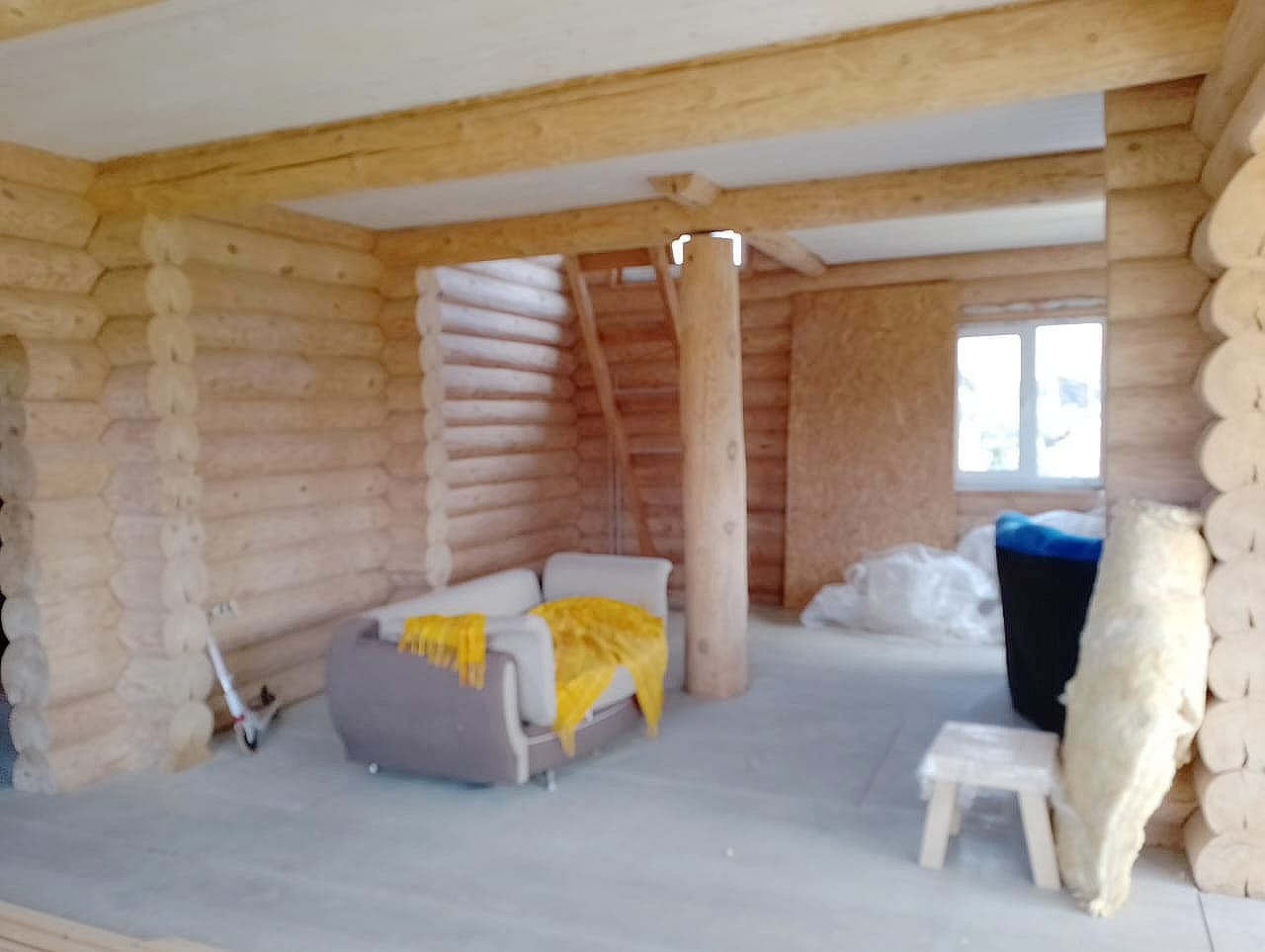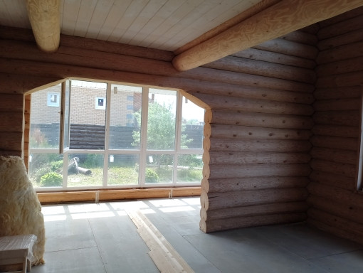 Дом чень светлый, теплый, качественно срублен вручную из сосновых бревен (диаметр бревна 26 см), стены отшлифованные внутри, утеплены межэтажные перекрытия и крыша, пол подготовлен для укладки покрытия. Газ заведен в дом, осуществлена разводка системы отопления.