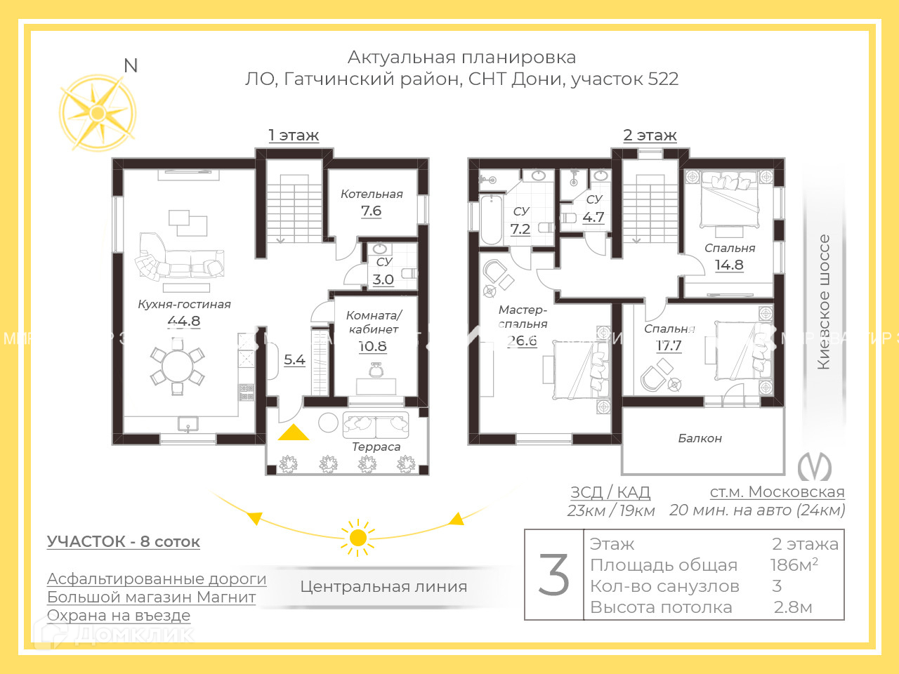 • 3 спальни, одна из них мастер-спальня со своим санузлом