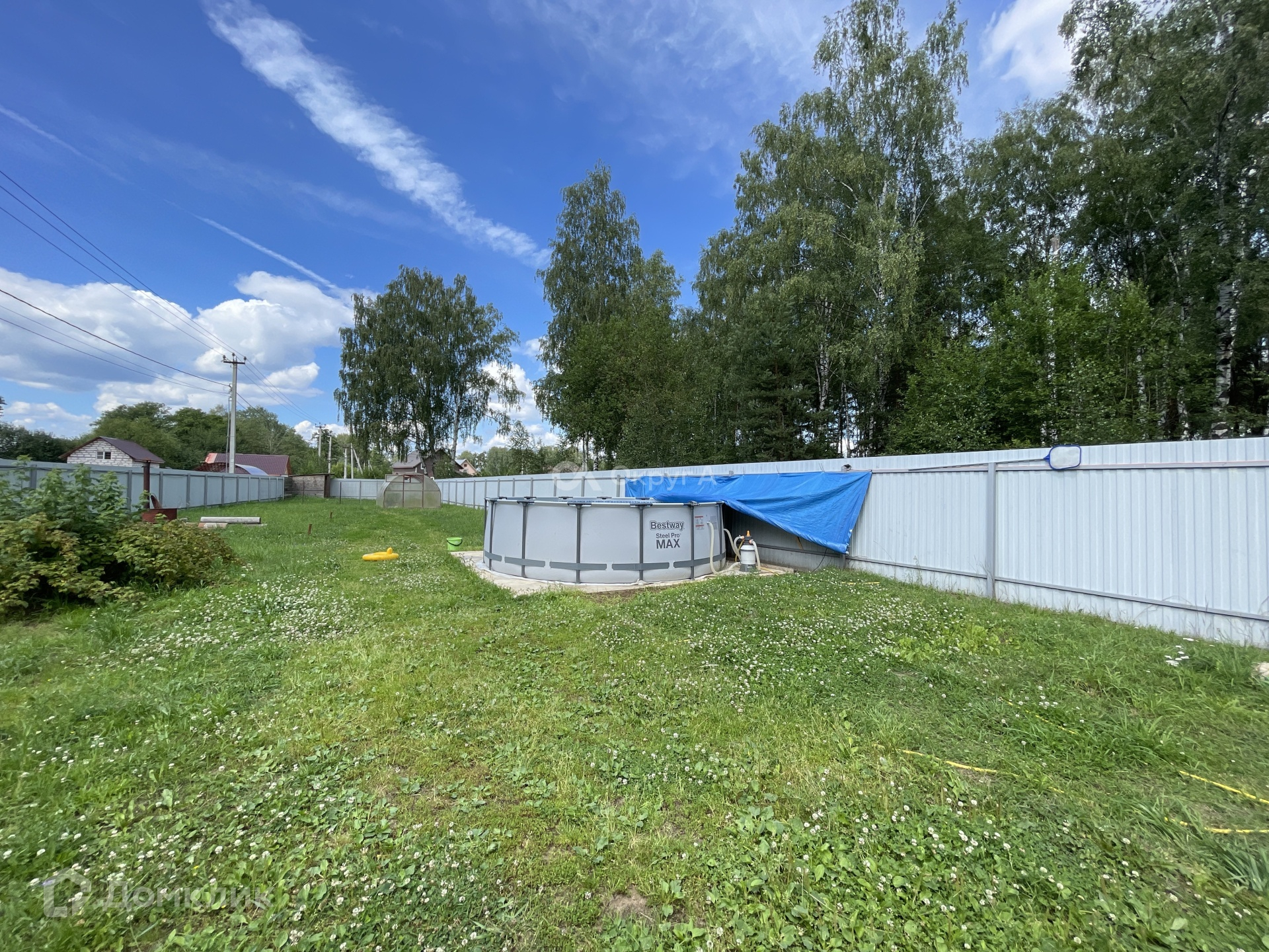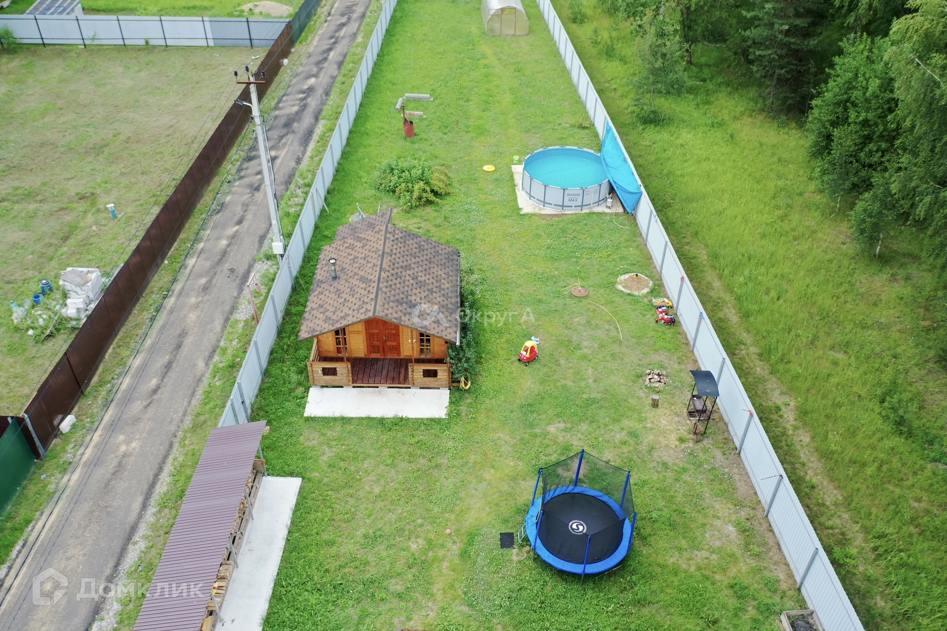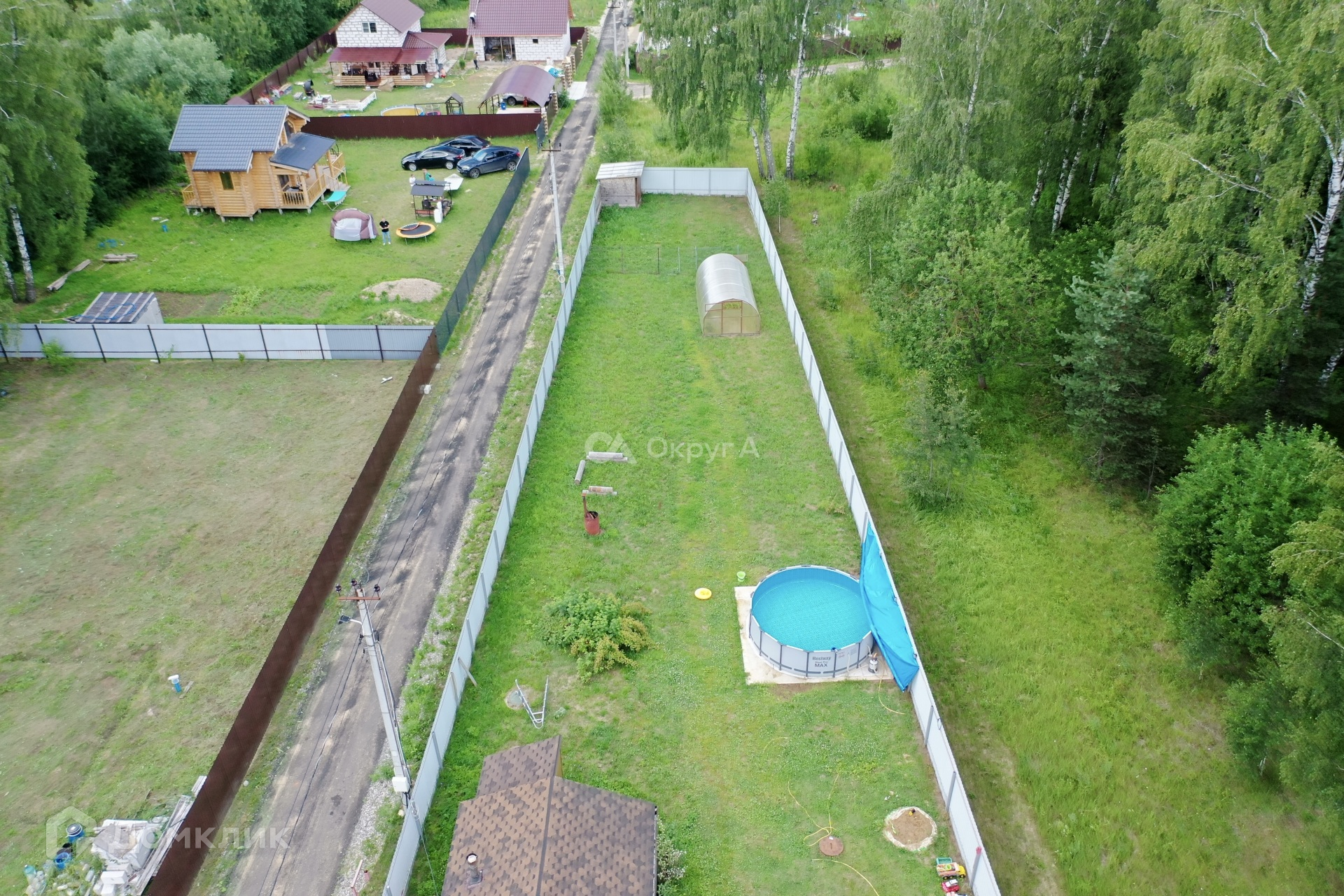 Участок ровнный правильной формы. По периметру установлен забор, откатные ворота , басейн.
