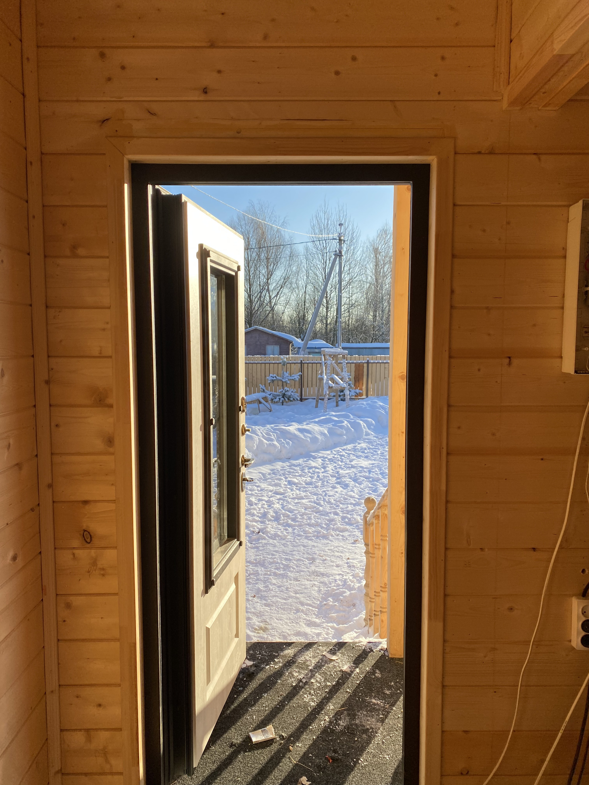 На террасу выход из кухни-гостиной (пластиковая двухкамерная полностью стеклянная дверь) и со двора.