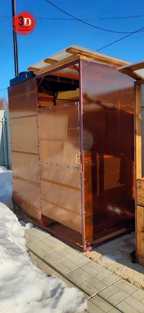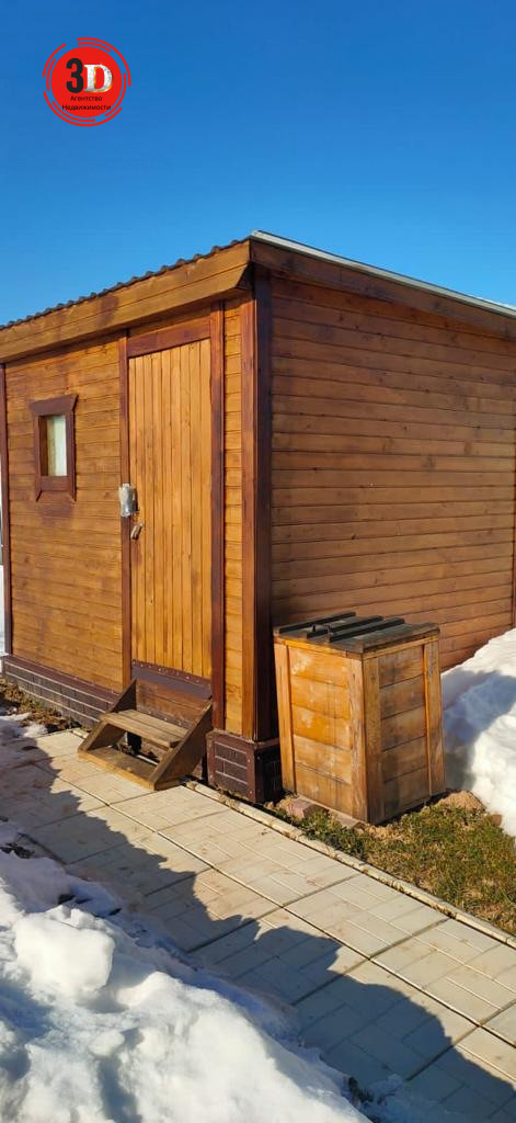 На участке есть деревянная бытовка 2х3 м, сделаны полки, утеплённая, полностью обработана, крыша из профлиста.